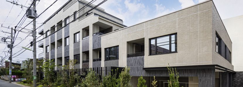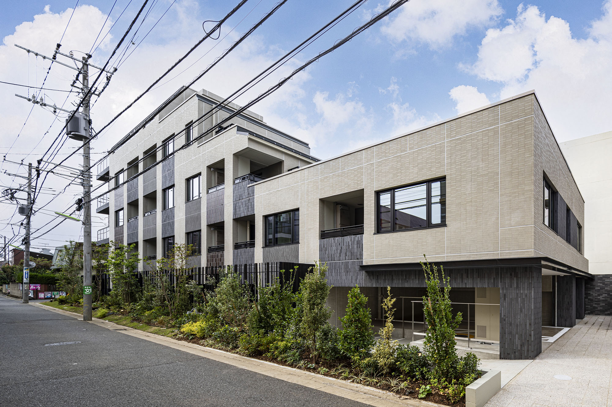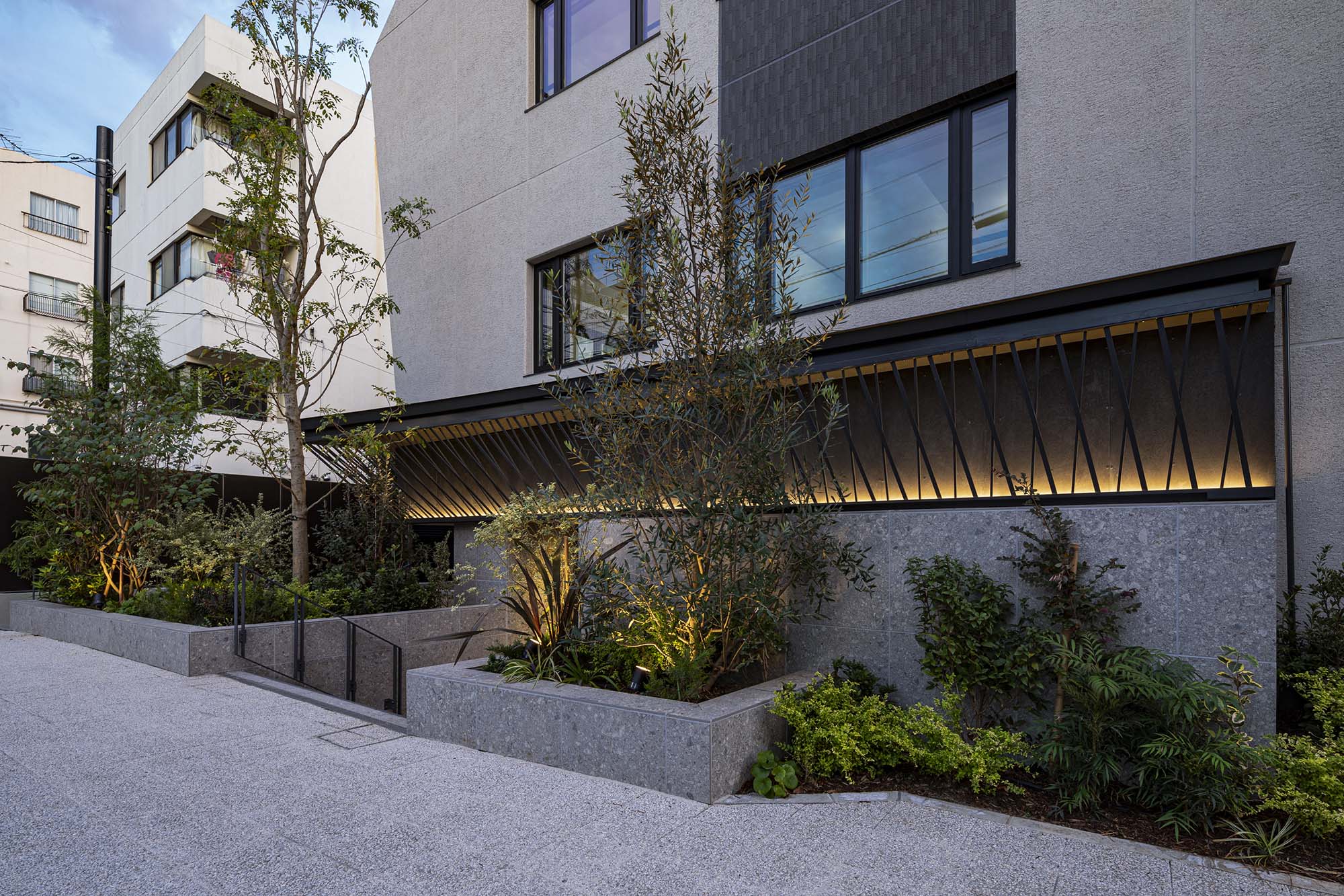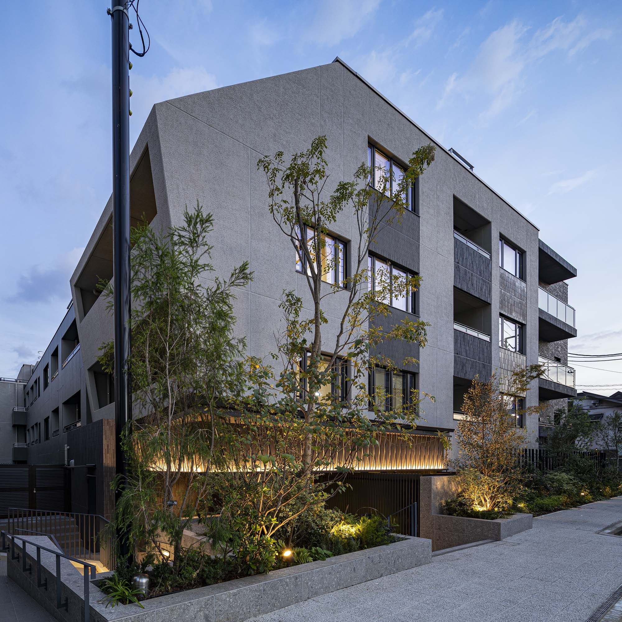 外観デザインは、多角形をモチーフにしており、個性がありながら高級感のある外観に。多角形の部分の塗装にはラメを施し、洗練された雰囲気を表現しています。外観や共用部には、天然石・磁器タイル・木材・ガラス等、複数のマテリアルを採用。質感・色彩・形状の異なる素材を織り交ぜることで多彩な表情をつくりだしています。