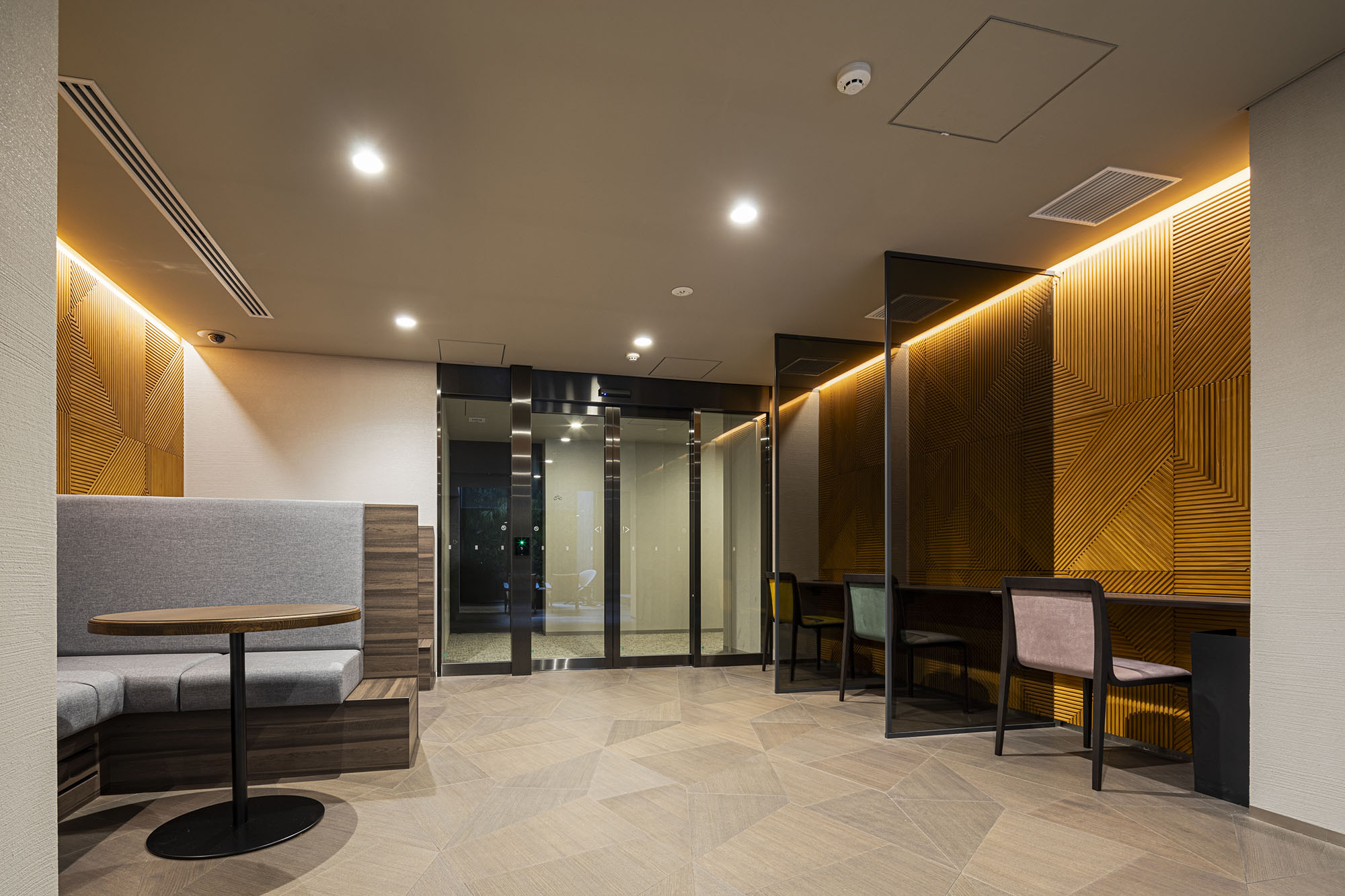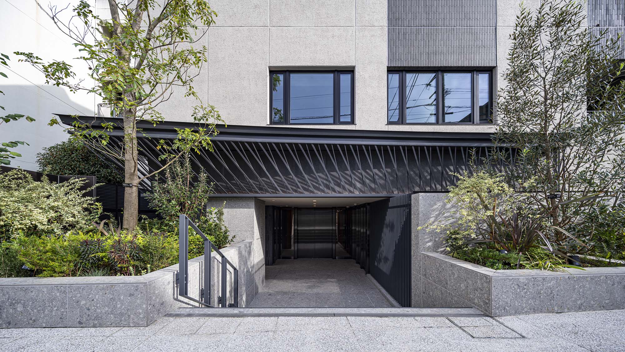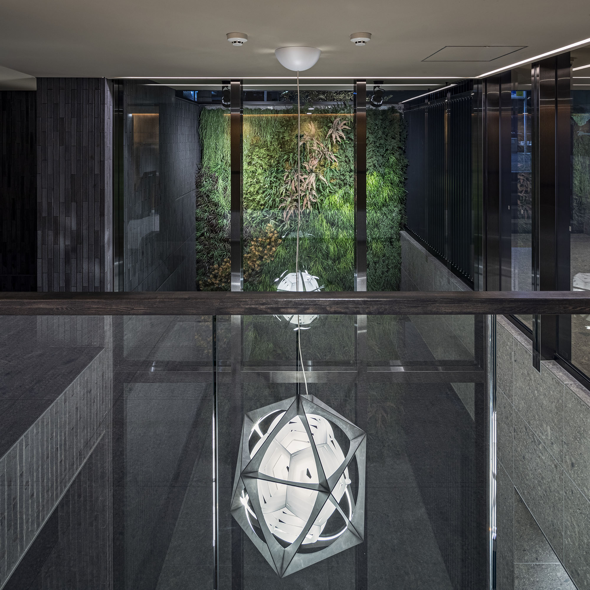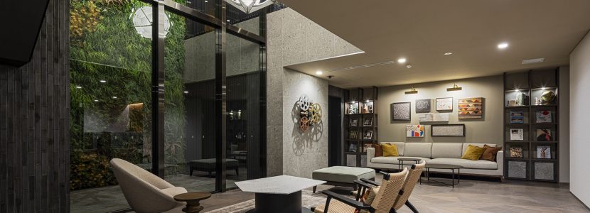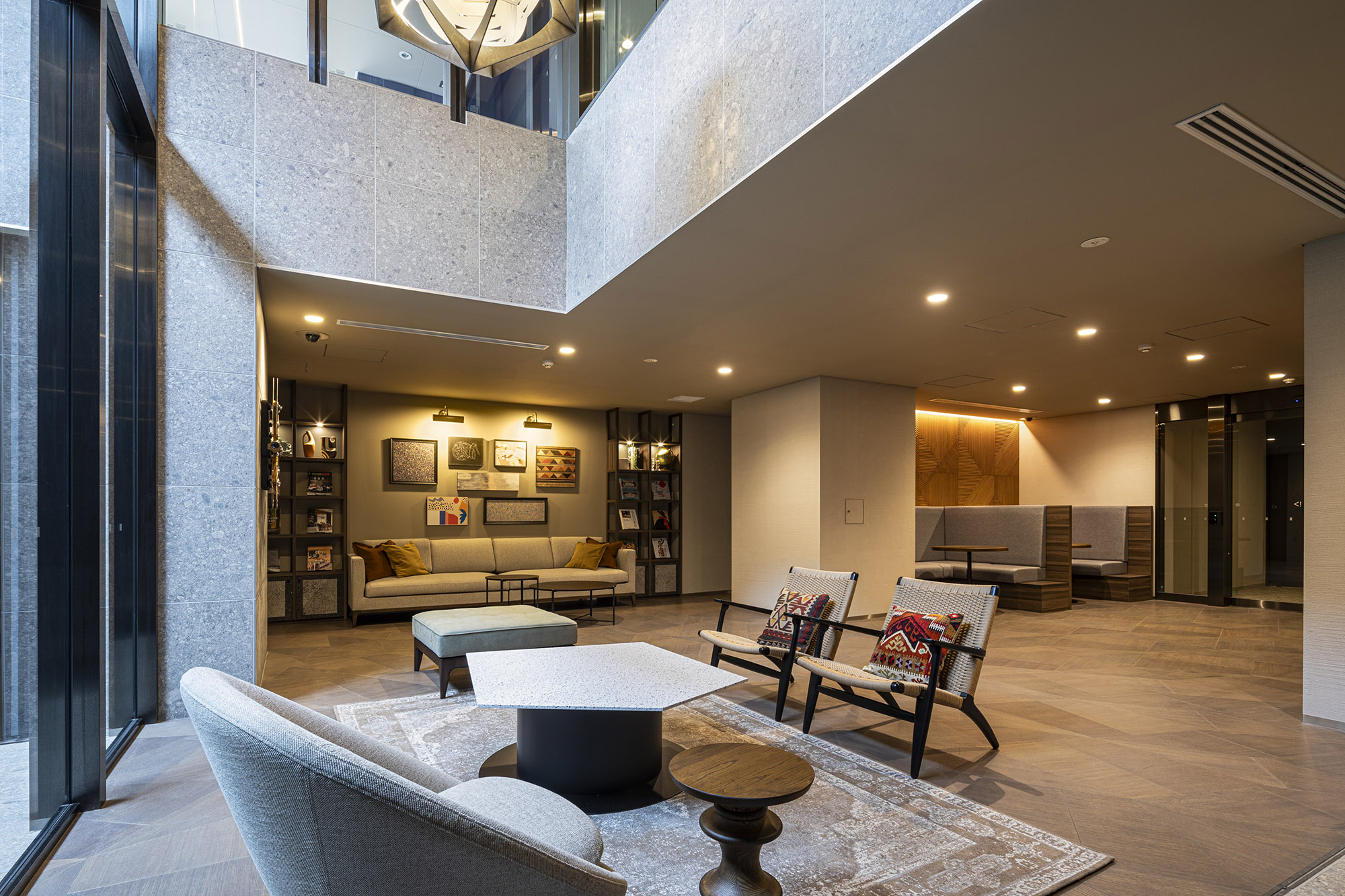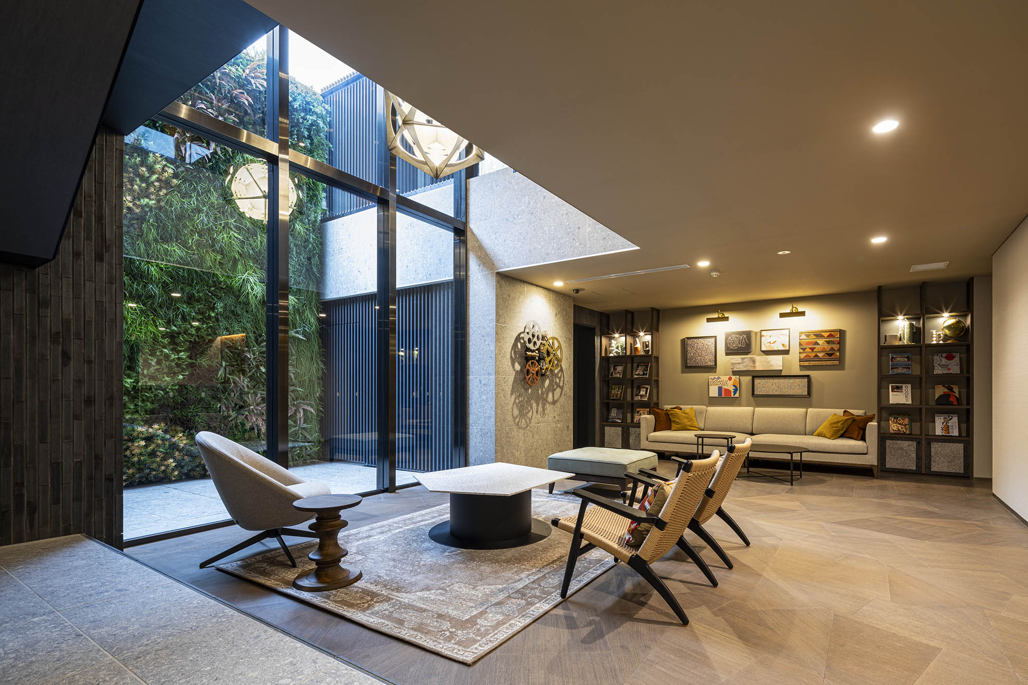 上質なプライベート空間を予感させるエントランス。洗練された大庇の奥に、そっとある穏やかな風景は、街の環境に溶け込みながら住まう方や訪れるゲストの心を満たす空間となっています。建物内に入り、階段を降りた先にあるラウンジは、大人の隠れ家をイメージした落ち着きある空間です。2層吹き抜けの大きな窓からは優しく光が差し込み、グリーンウォールが潤いを演出。個性的な家具や、時の蓄積を感じさせるアートが、大人の遊び心を表現。ビジネスからプライベートまで、多様な使い方ができるワークスペースも完備されています。