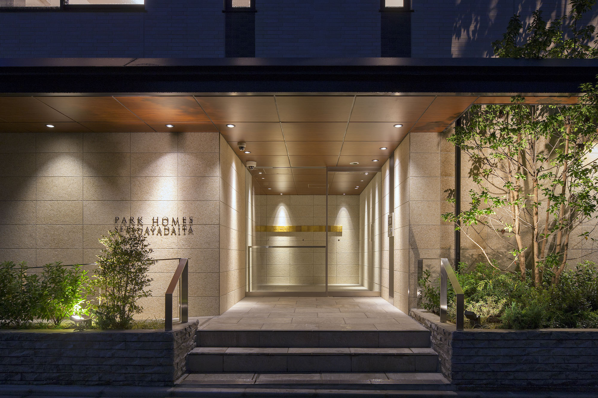 敷地北側中央にオープンな横に伸びる庇を設けることで、水平方向の伸びやかさを強調し、建物に一体感を与えると共に、開放的な雰囲気と迎賓の構えを創出。エントランスからエントランスホールへは連続性のあるデザインとなっており、シンプルで落ち着いた雰囲気の空間が創り上げられています。敷地北東角には7mのコブシがシンボルツリーとして配置されるなど、豊かな植栽計画が私邸の趣を演出しています。