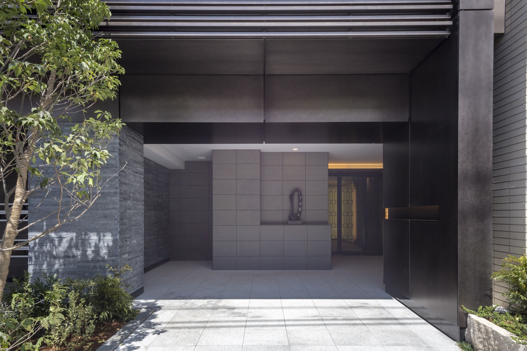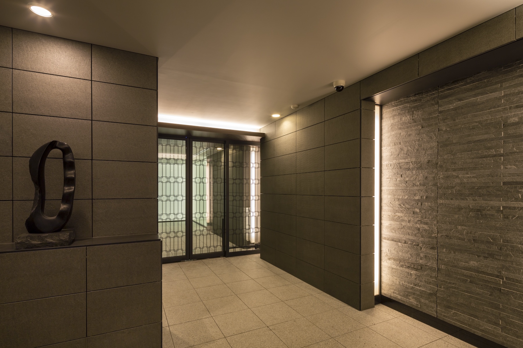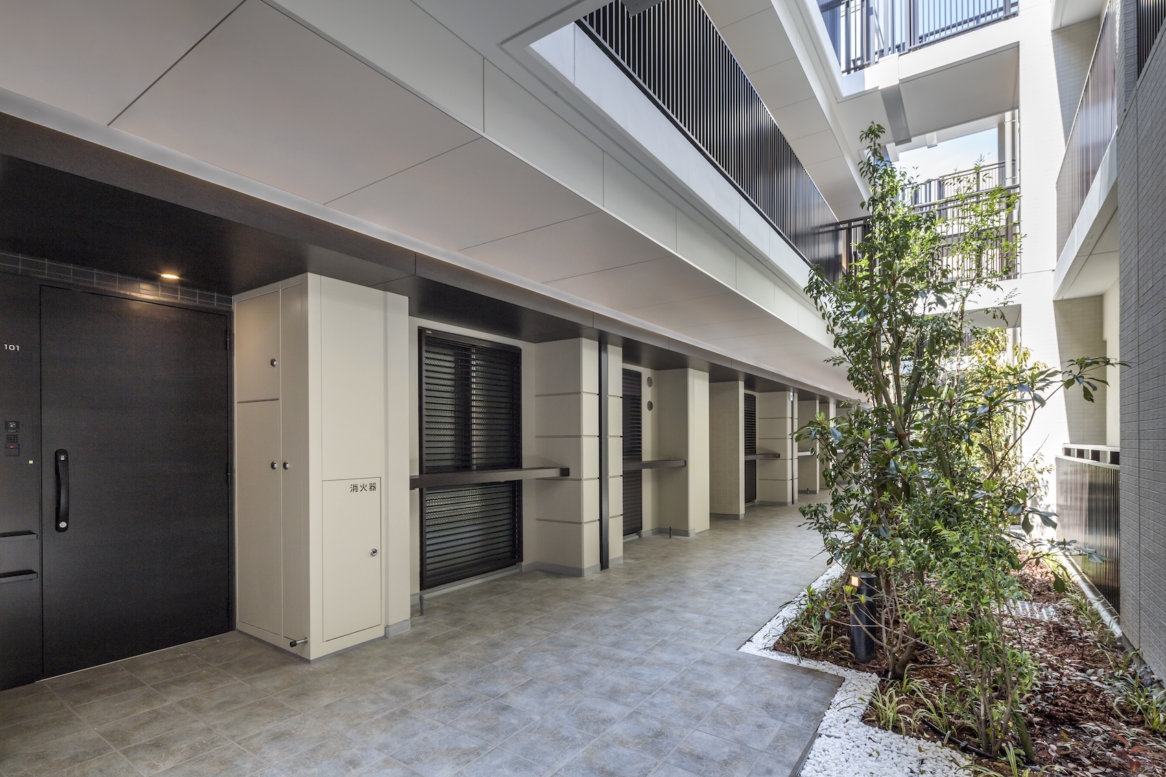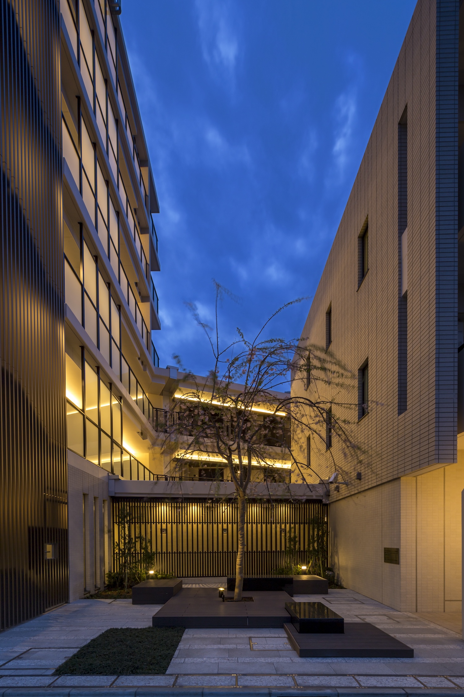 エントランスの自動ドアには、質感のあるロートアルミの装飾が採用され、クラシックな優雅さを演出。その先に広がるエントランスホールでは、光壁がファブリックガラス越しに空間を柔らかな光で満たしています。敷地中央には吹抜けを生かして、そよ風と陽光が心地よいインナーコートを設置。プライバシー性と開放感を兼ね備えた快適なアプローチを実現しています。外部に開かれた環境空地にも、枝垂桜を植えた和の風情あふれる庭園が配され、美と潤いの空間が設計されています。