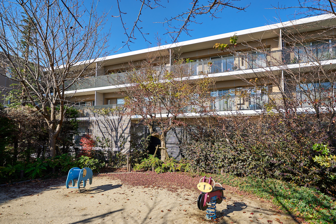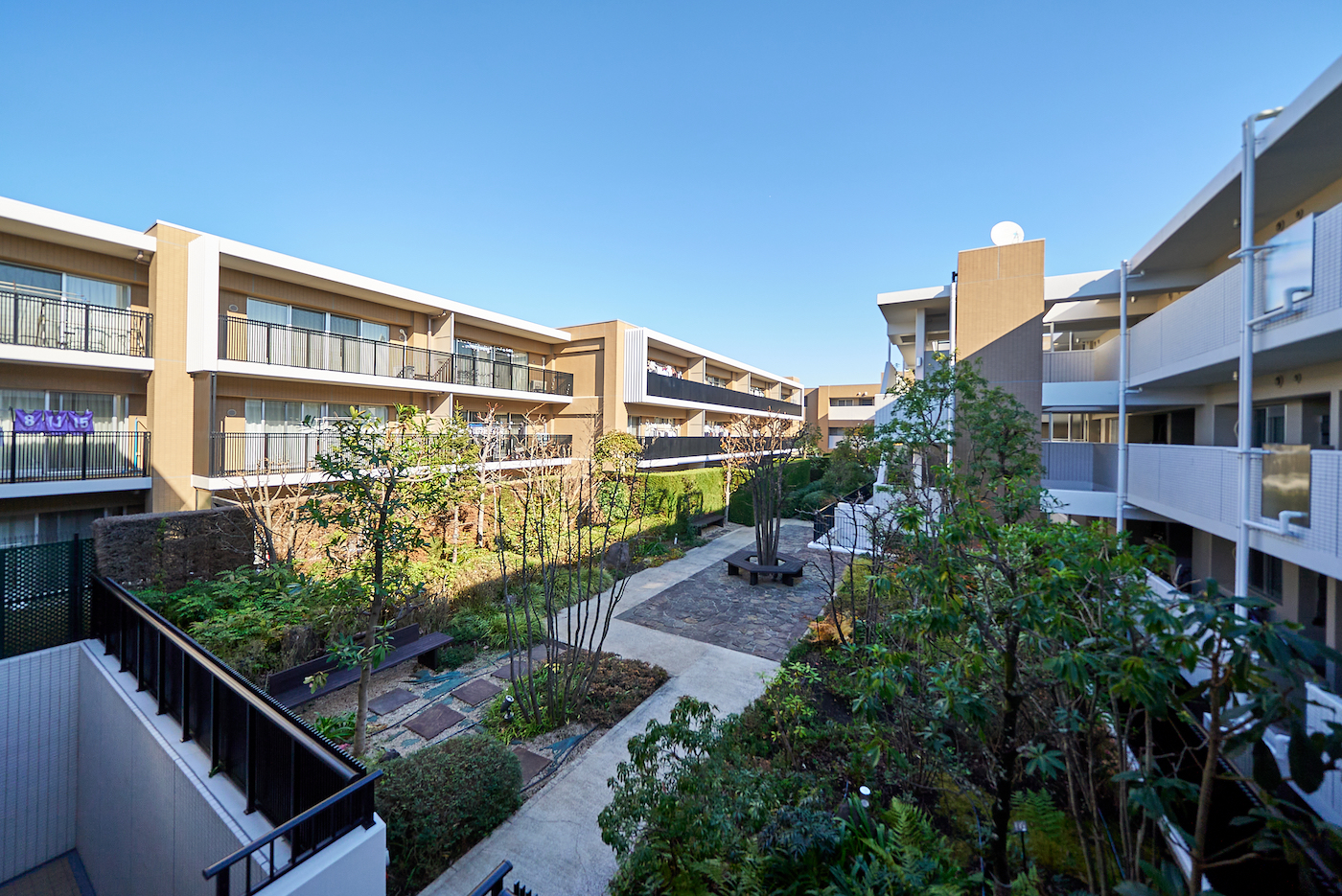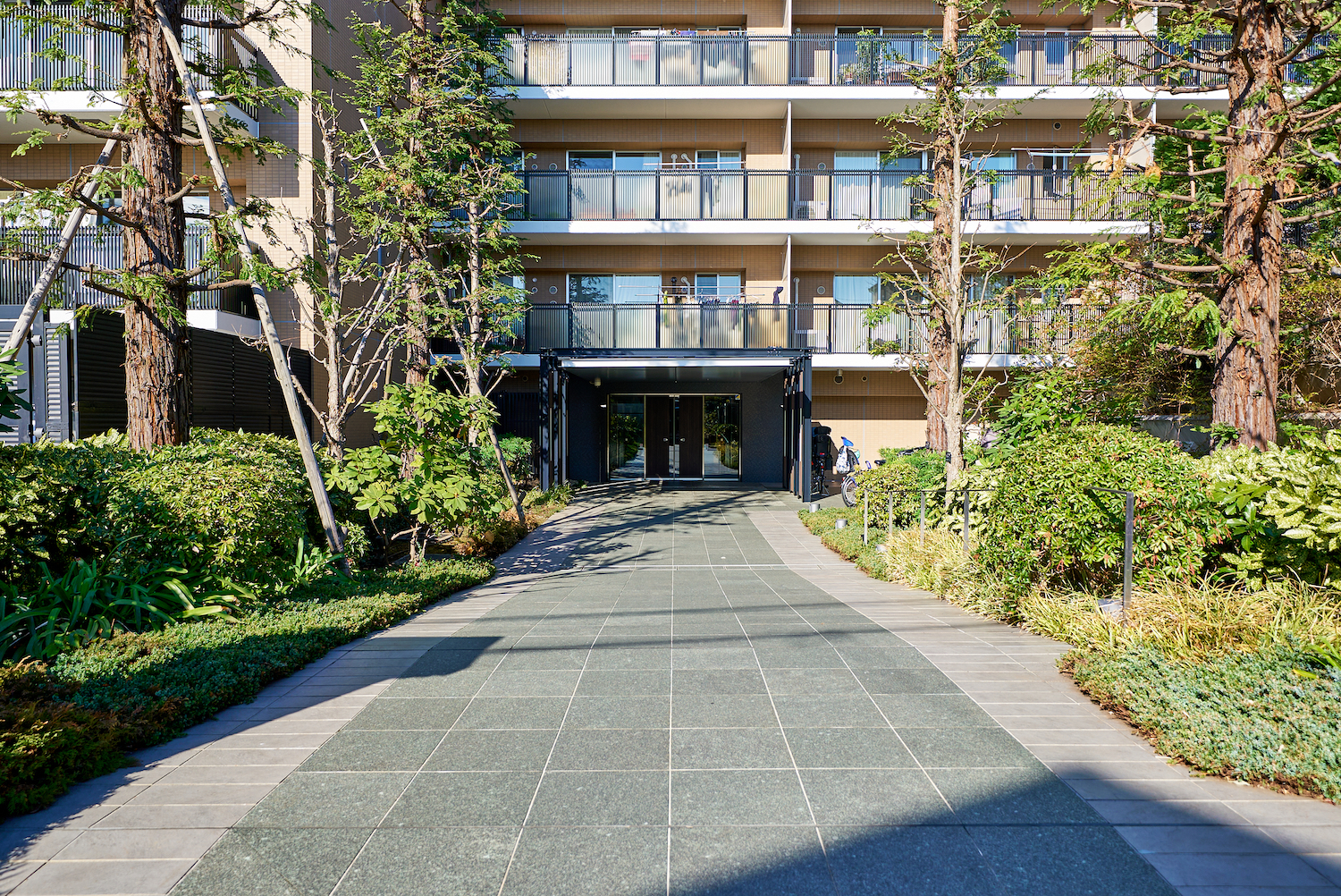 敷地の中央に設けられたのは、自然の潤いあふれる中庭「翡翠の森」。石神井公園をテーマに、多種多様な草花と、その間を縫うように小径が配され、気軽に散歩を楽しめる空間となっています。