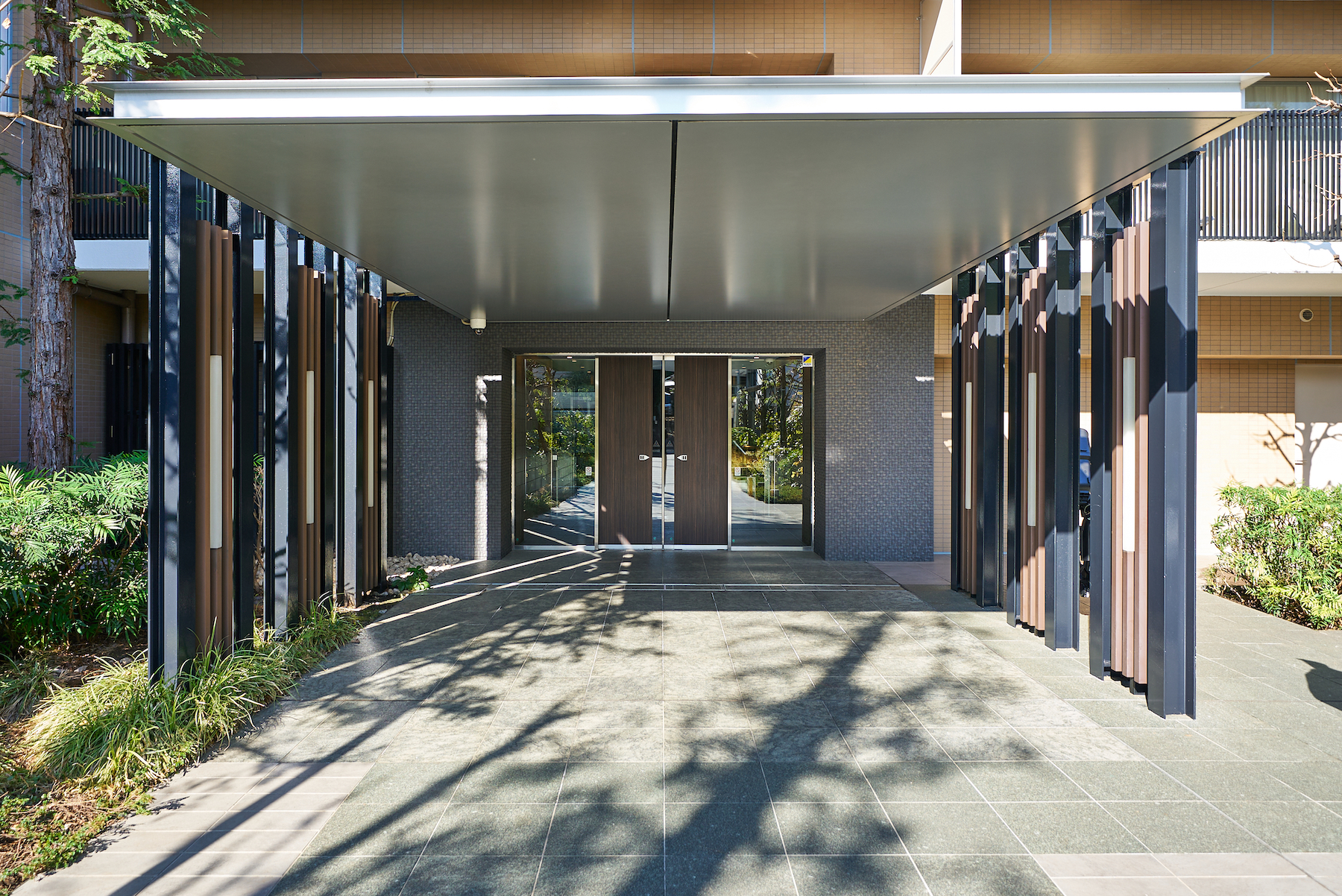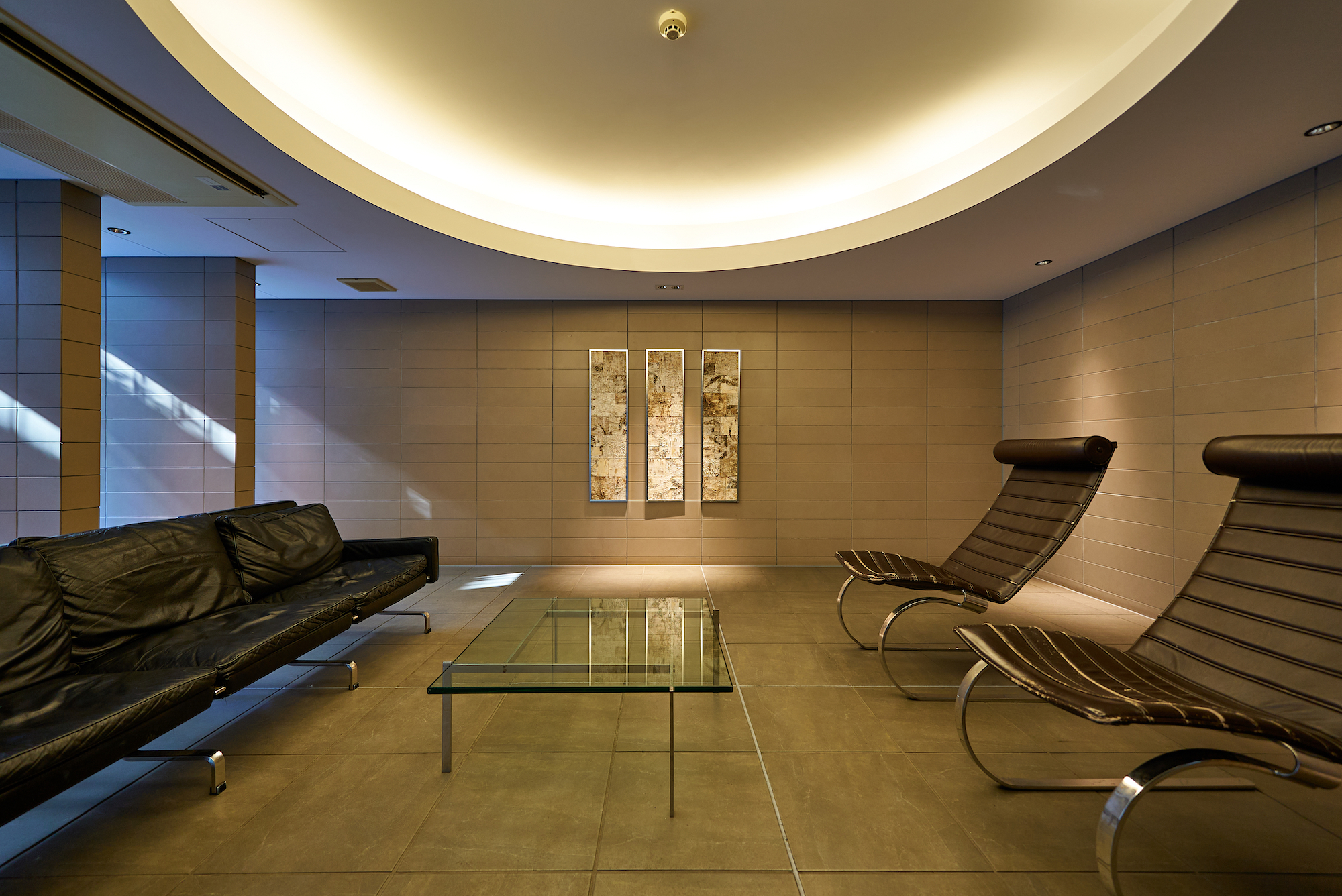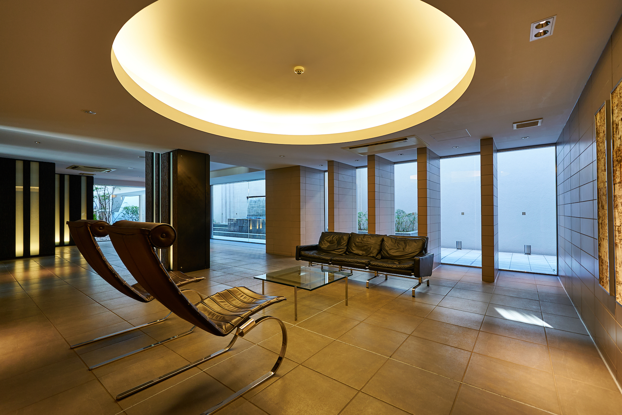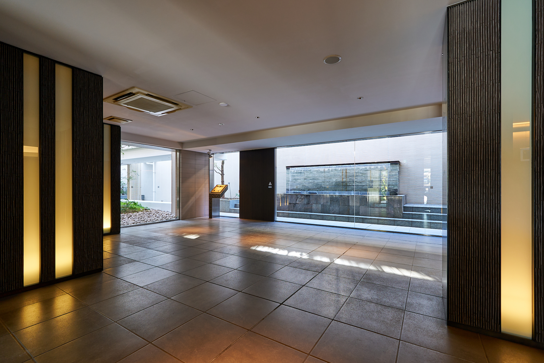 重厚感ある門柱を抜けると、季節の潤い溢れうる「四季の並木」がお出迎え。キャノピーをあしらった壮麗な雰囲気のエントランスは、夜になると淡い光でゆったりとした帰路を演出してくれます。エントランスから一歩足を踏み入れると広がるのは、澄んだ水をたたえる「水景の庭」と、折上げ天井の優雅な「水光の間」。深い安らぎに包まれ、気持ちをオンからオフへと切り替えを促す空間です。ゆったりと寛げるソファもあり、待ち合わせや歓談スペースなどにも利用できます。