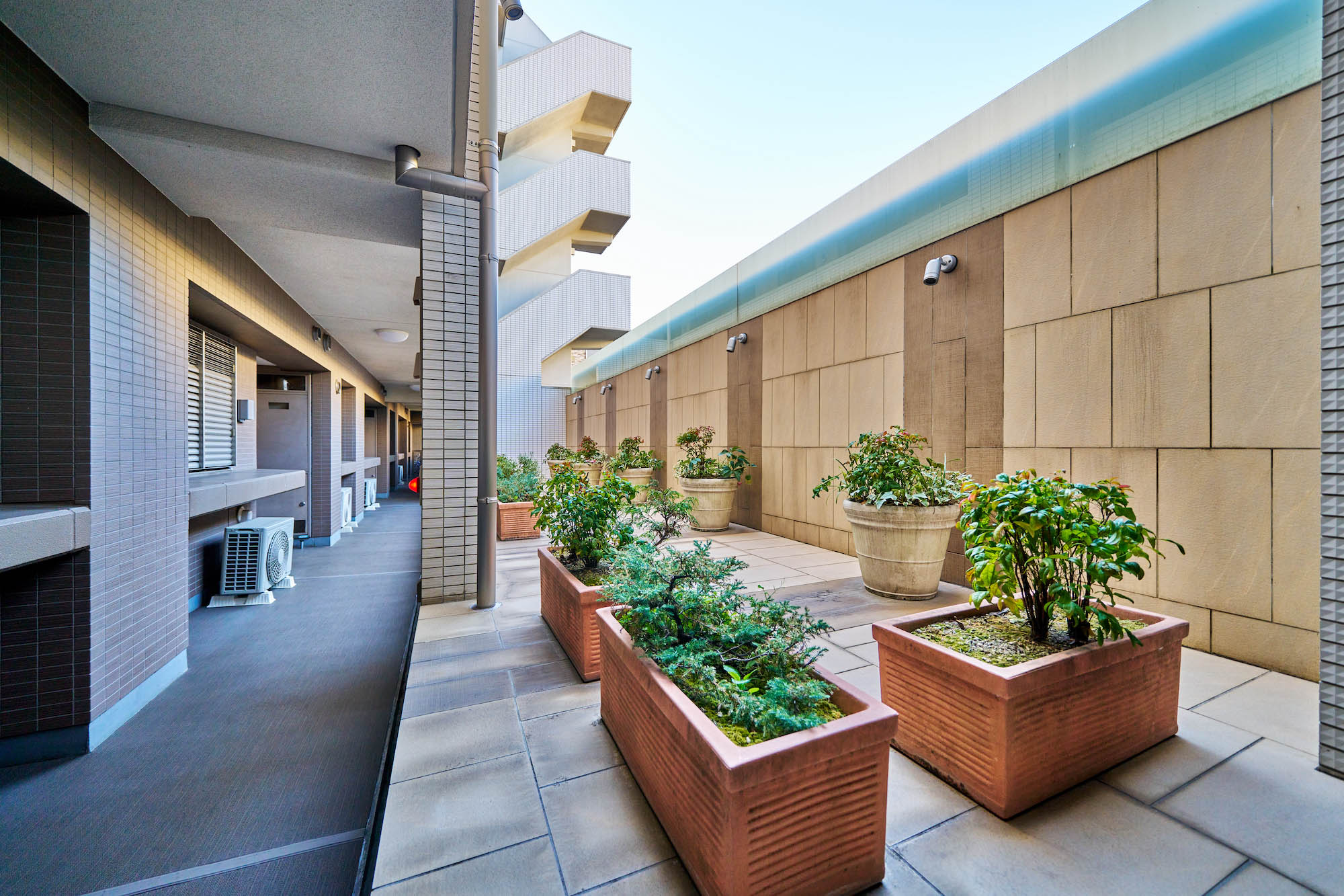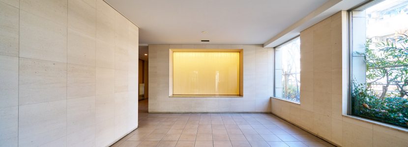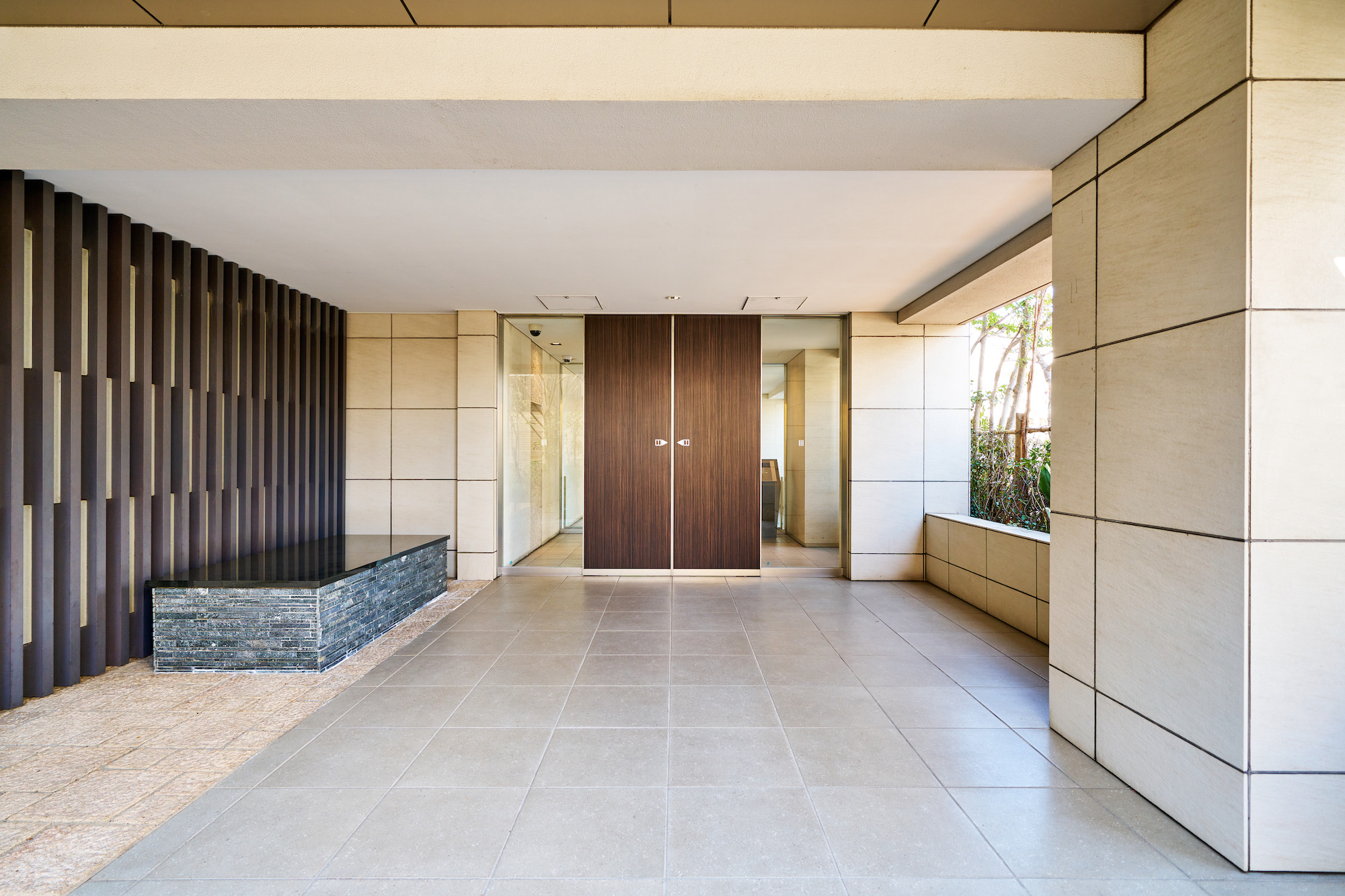 陽光と夜間の照明で二つの輝きを見せるガラスのアクセントや、時の流れと共に陰影を変化させる格子庇、ガラスを透過したやわらかな光など、訪れる方にやすらぎを与える仕掛けが施されたエントランスアプローチ。エントランスホールは暖かみのあるナチュラルカラーのタイルと石で構成された、落ち着いた雰囲気の空間です。エントランス廻りや表通りに面した部分には、街並景観と調和するよう、四季の彩り豊かな植栽が施されています。