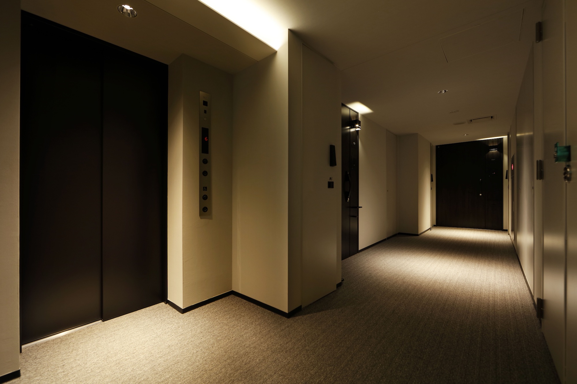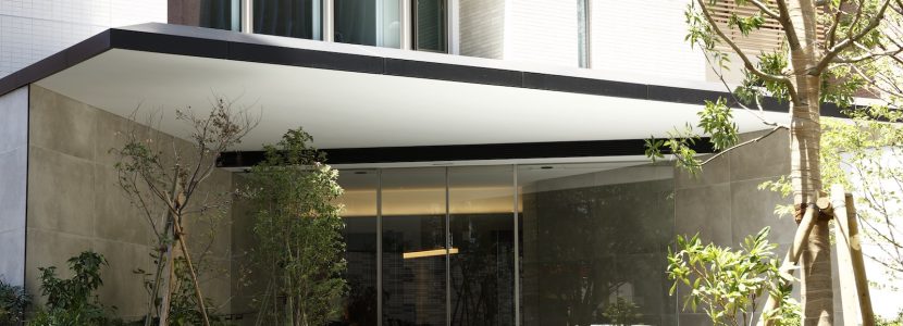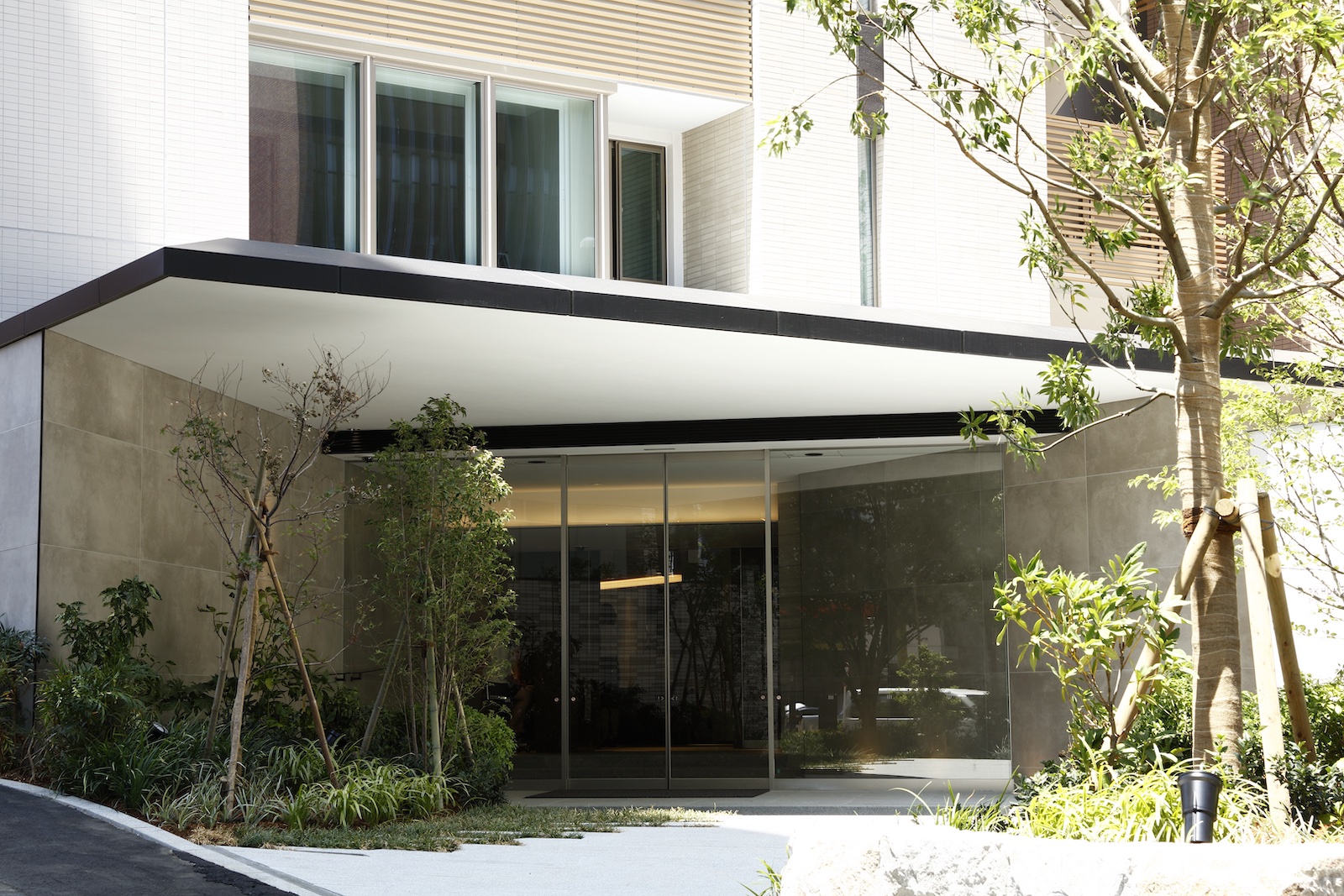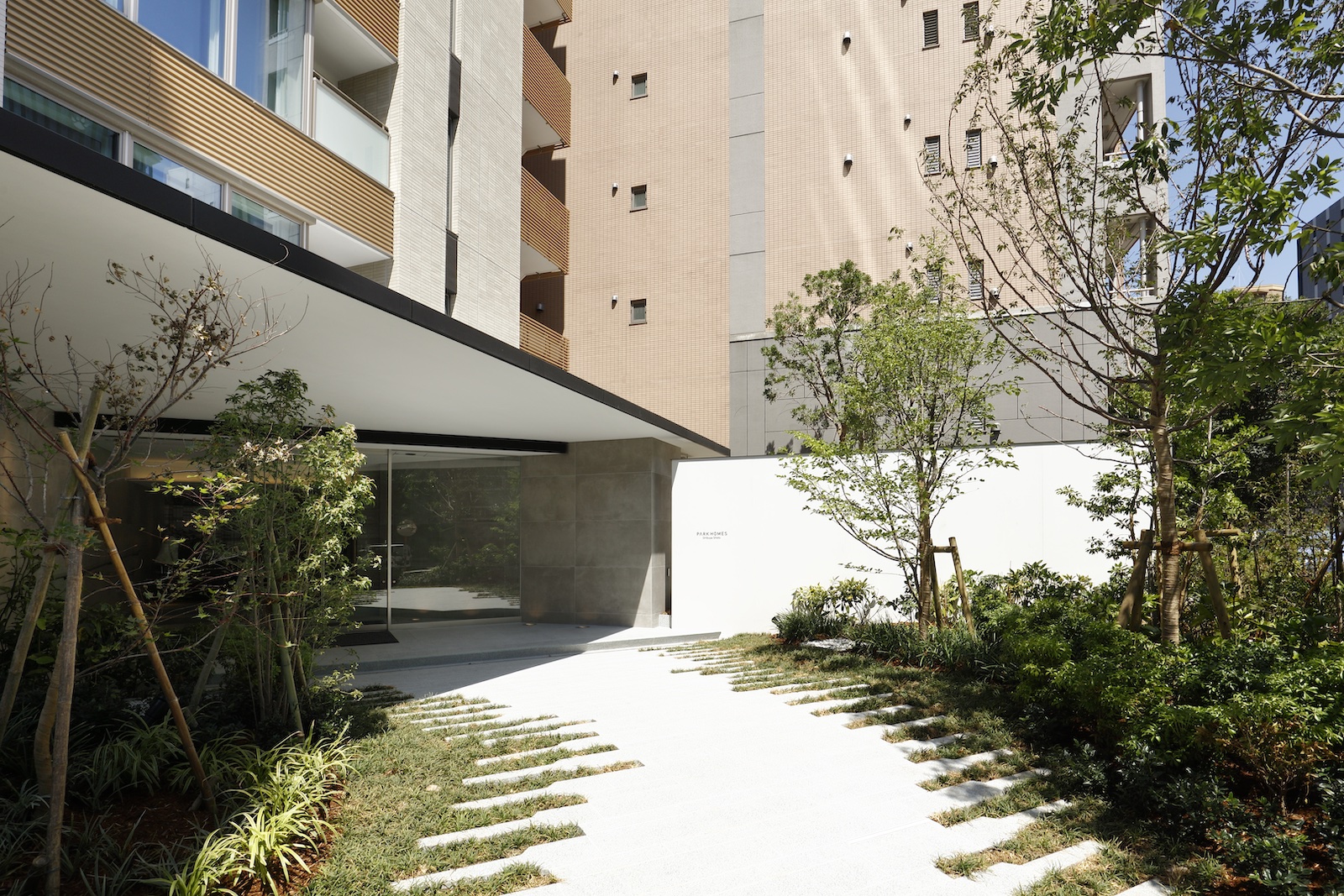 私邸へ近づくほどに、住まう方を落ち着いた時間で包み込むように、贅沢な奥行きを持たせたエントランスアプローチ。質感のある自然石を敷き詰め、四季の彩りを感じる植栽、風格のある大庇など、素材一つひとつにこだわった迎賓空間です。エントランスの先には、光と緑を臨むラウンジが広がります。別荘のような寛ぎの空間は、職住一体の時代に対応し、Wi-Fiやコンセントなど働くための機能も備わっています。