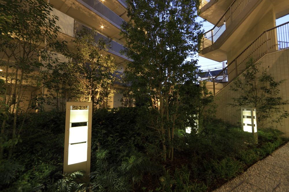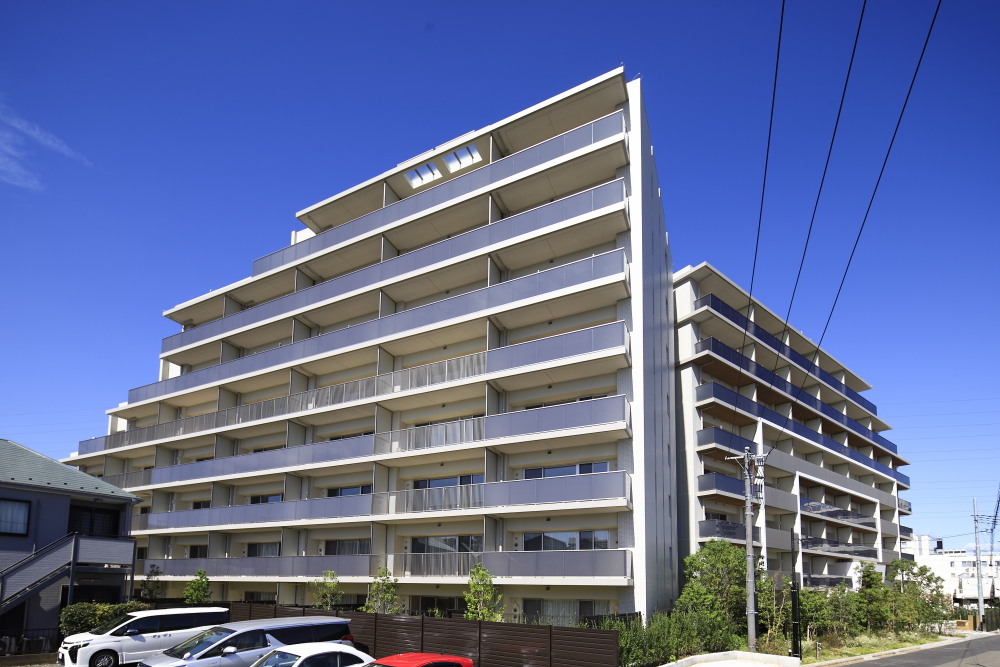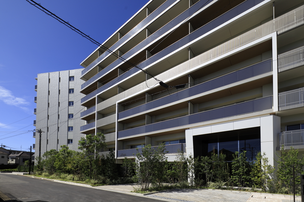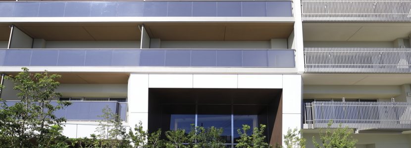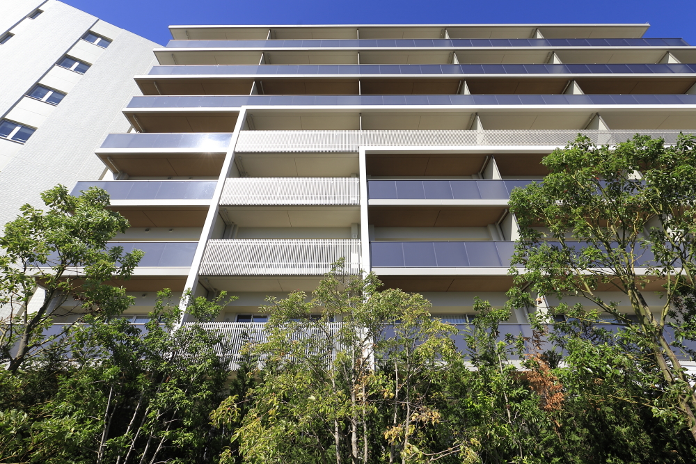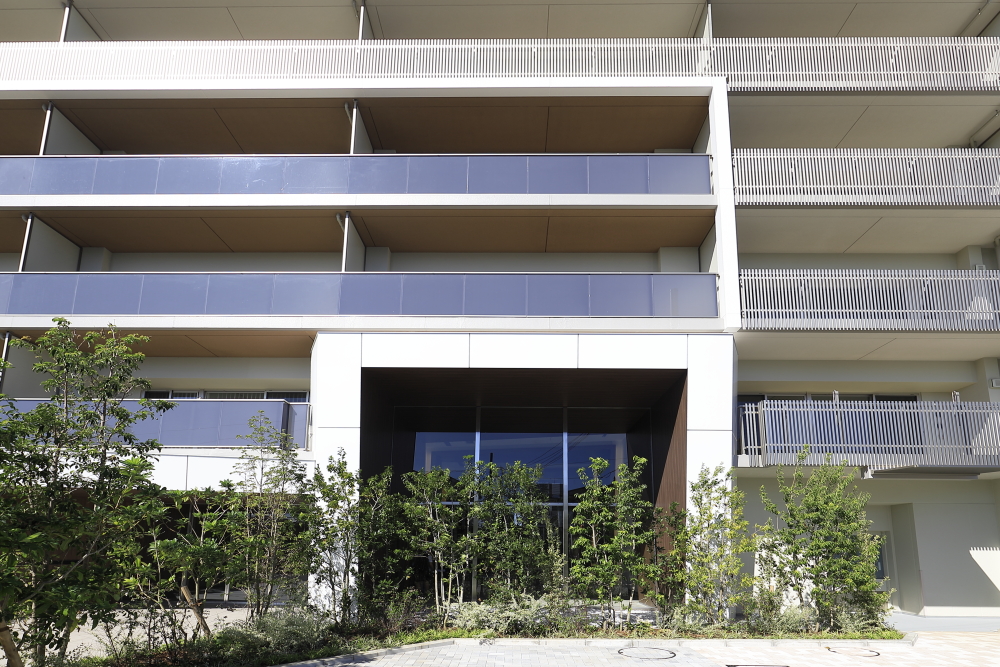 駅からのアプローチとなる通りから、一本入ったその先に、スケール感溢れるレジデンスが姿を現します。エントランスの上部には、マリオンと横の庇で構成する2重のラインを施し、エントランスのゲート性を強調。遠景から望む雄大さに対して、近くに寄ると繊細なデザインが際立ちます。モダンさを醸すバルコニーのガラス手摺と、ステンカラーのアルミの堅格子という異なる素材でファサードに変化をもたらすなど、モダンでシャープな印象の外観です。