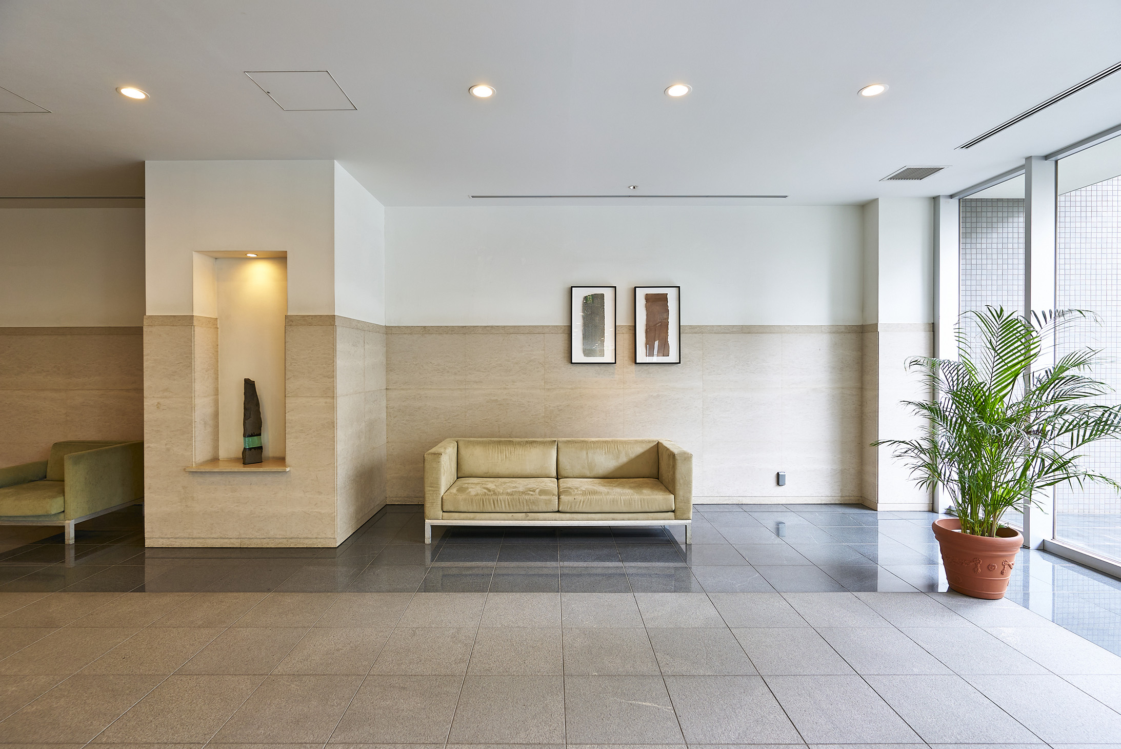 深い品位に包まれて、エントランスホールにはゆとりと落ち着きが漂います。正面には大理石の壁が風格を讃えるかのように広がり、ニッチのある柱が趣を醸し出します。
