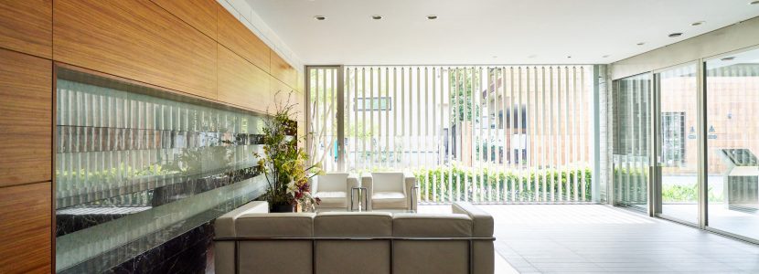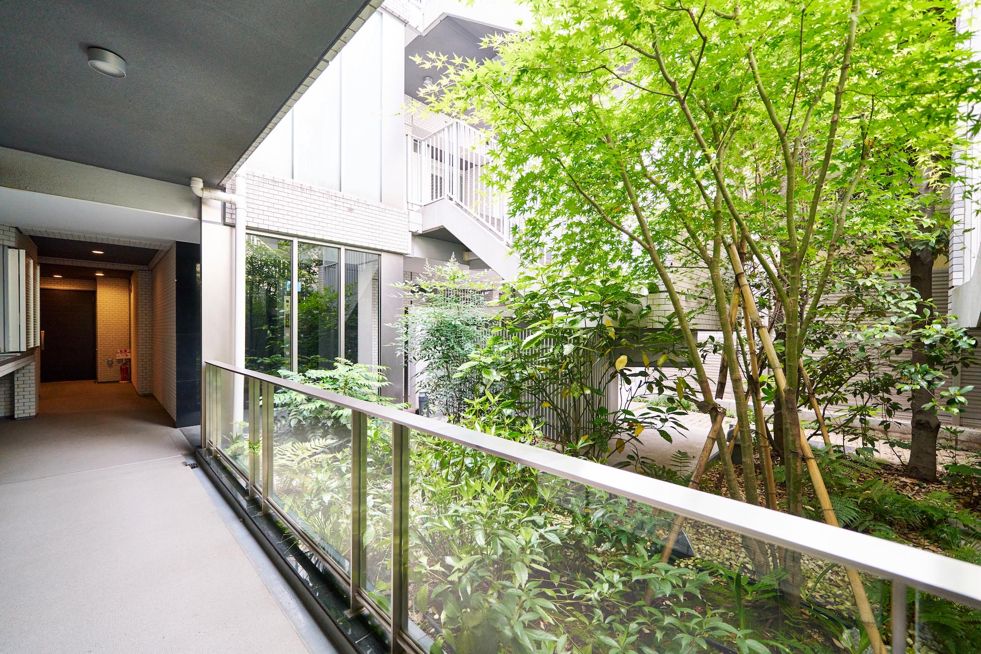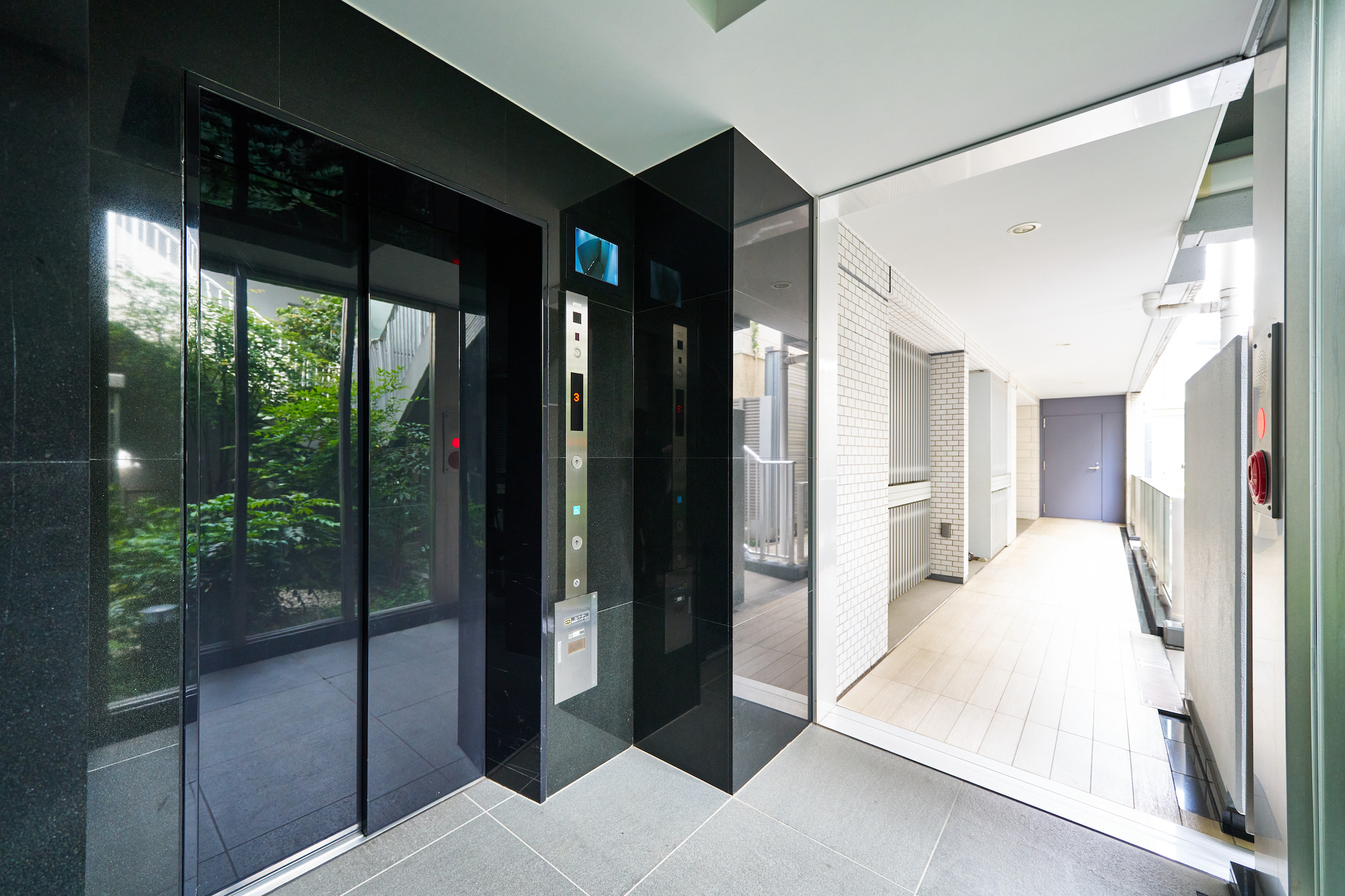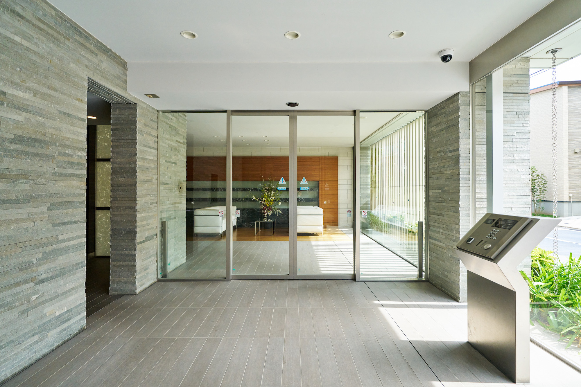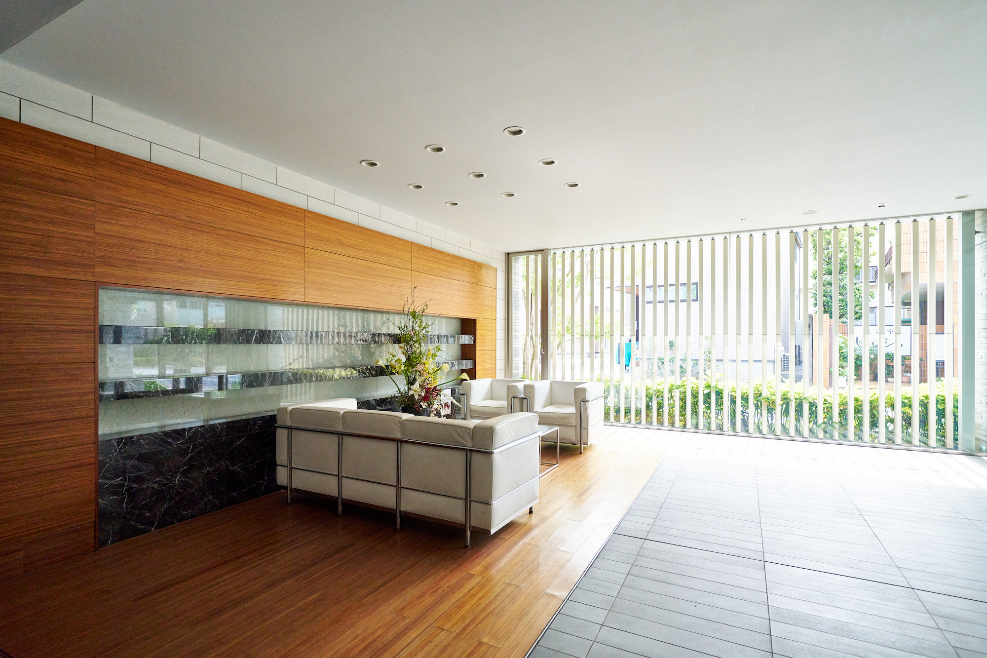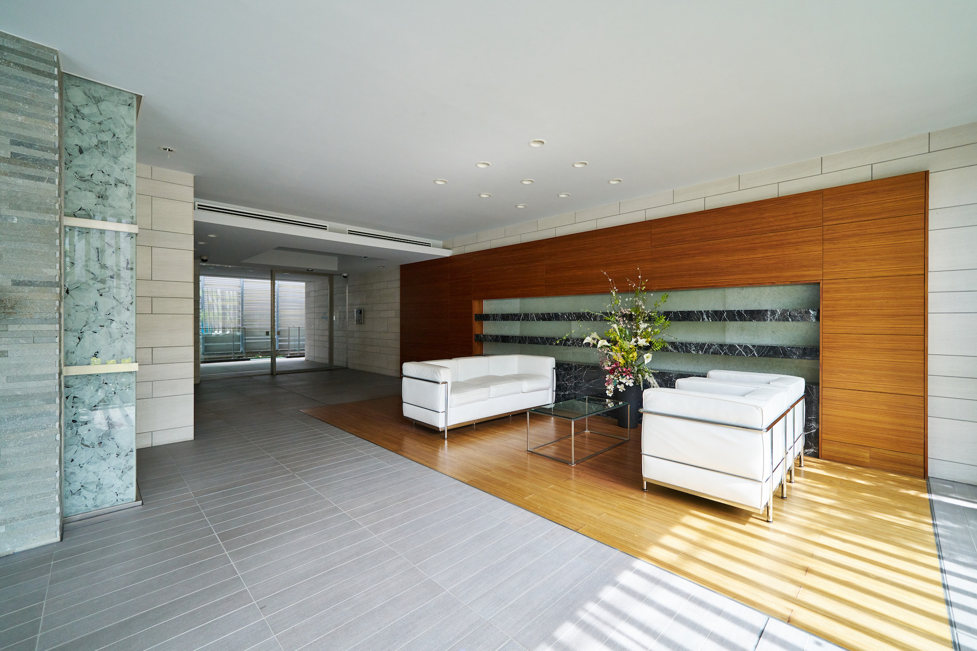 アプローチから風除室、エントランスホール、そして各邸へと至る動線上には、公から私へと気持ちを切り替えてゆくための「おもてなしのシーン」が連続してプランニングされています。風合いのある割肌の壁面に柔らかな光を照らすアプローチ。その先には、積層したガラスが光るデザインウォールと重厚な大理石が、上品なくつろぎの空間を演出するエントランスホール&ラウンジが広がります。さらに、ライティングウォールがやさしい光でお出迎え。エレベーターホールは、深い艶を湛える黒御影と中庭を望むガラスウォールが安堵感を深めています。いくつものクランクを進み、その度に出逢えるのは、趣の異なるマテリアルと光の演出で創りあげる美しき風景。ここに住まう方々の日常を、贅沢な時空でもてなしています。