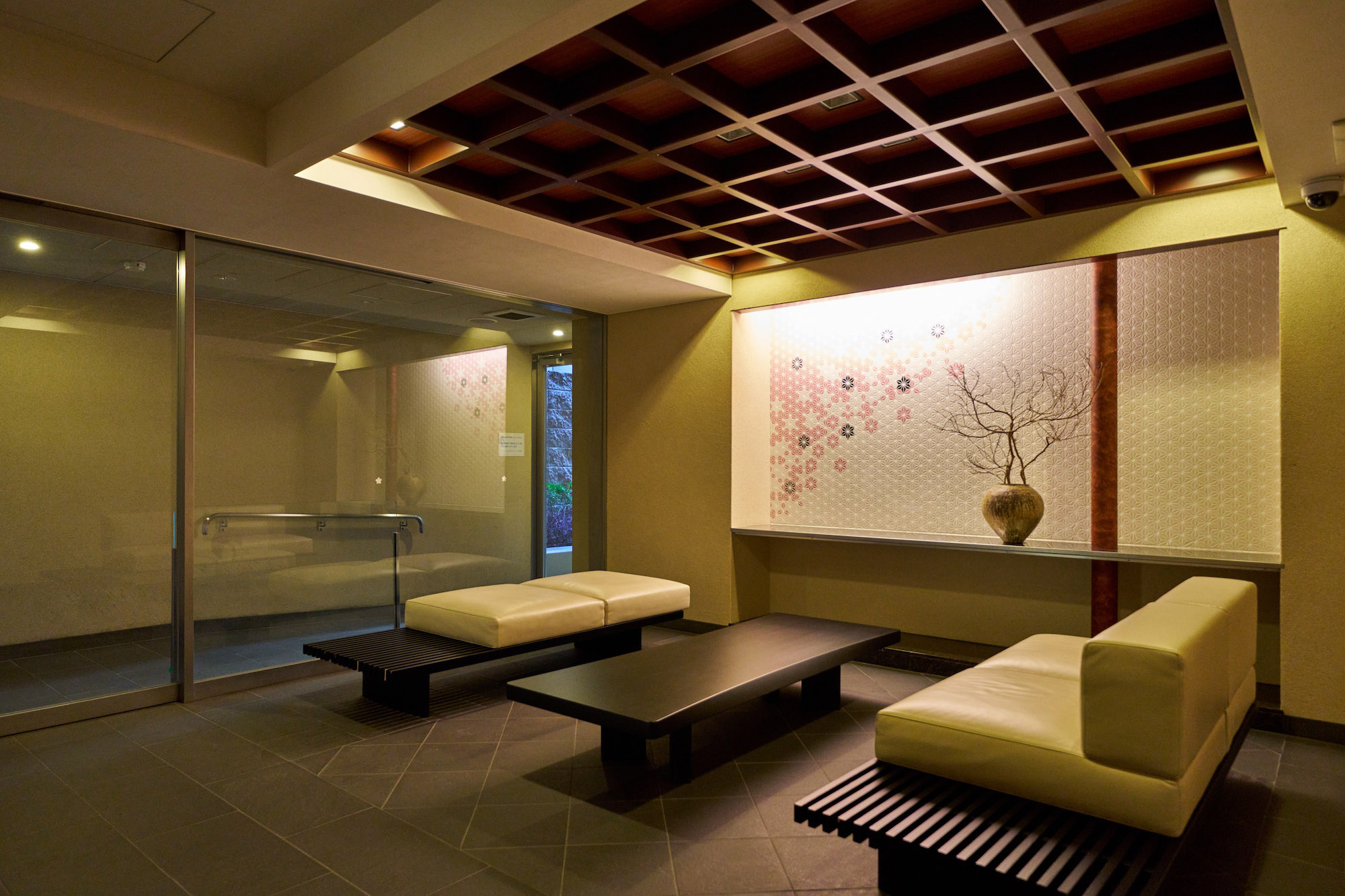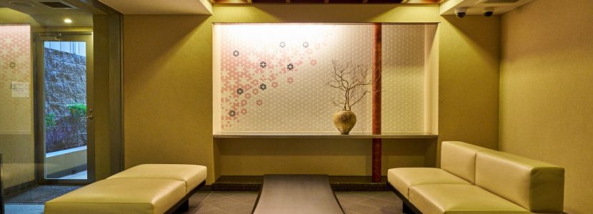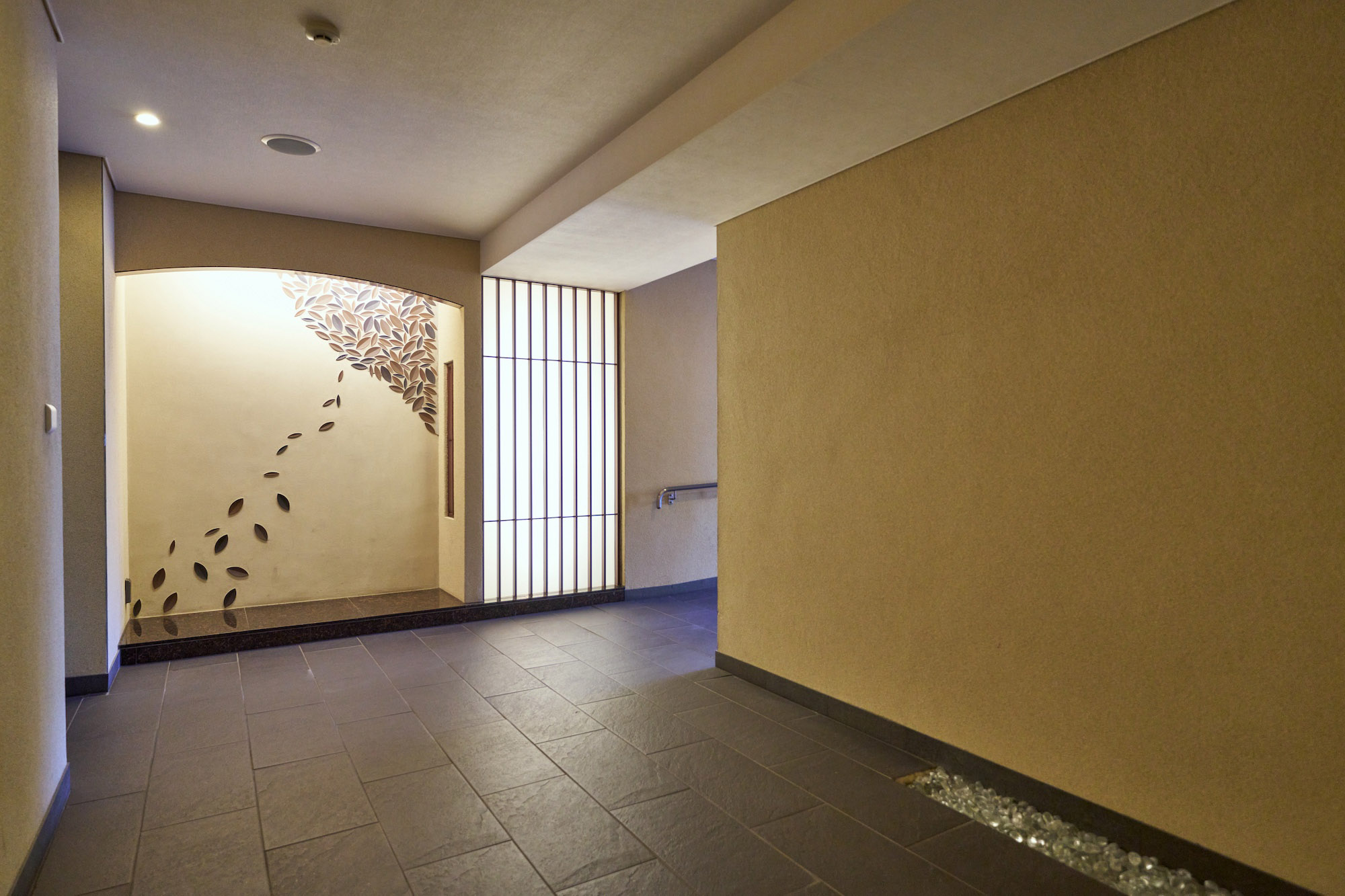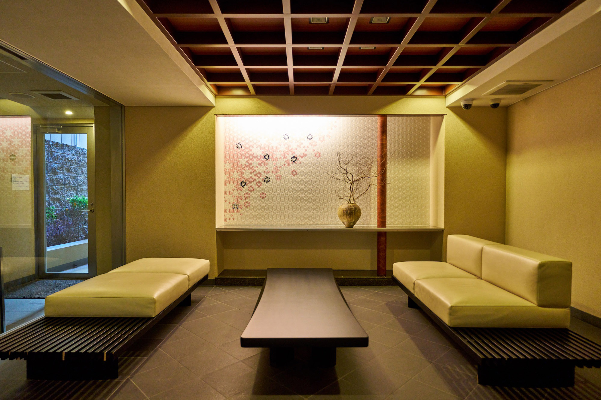 風除室からエントランスホールまでの動線には3ヶ所、訪れた人々を雅なる温もりでエスコートするように、それぞれ異なる和の伝統的な模様をアレンジしたアイストップを設置。美しき意匠の連続が胸を打ち、歩みを進めるごとに期待感が高まります。桜の花片を思わせるような内装に誘われるのは、広々としたエントランスホール。随所に和をモチーフとする文様を添えることで、空間一帯に迎賓の志を浸透させています。