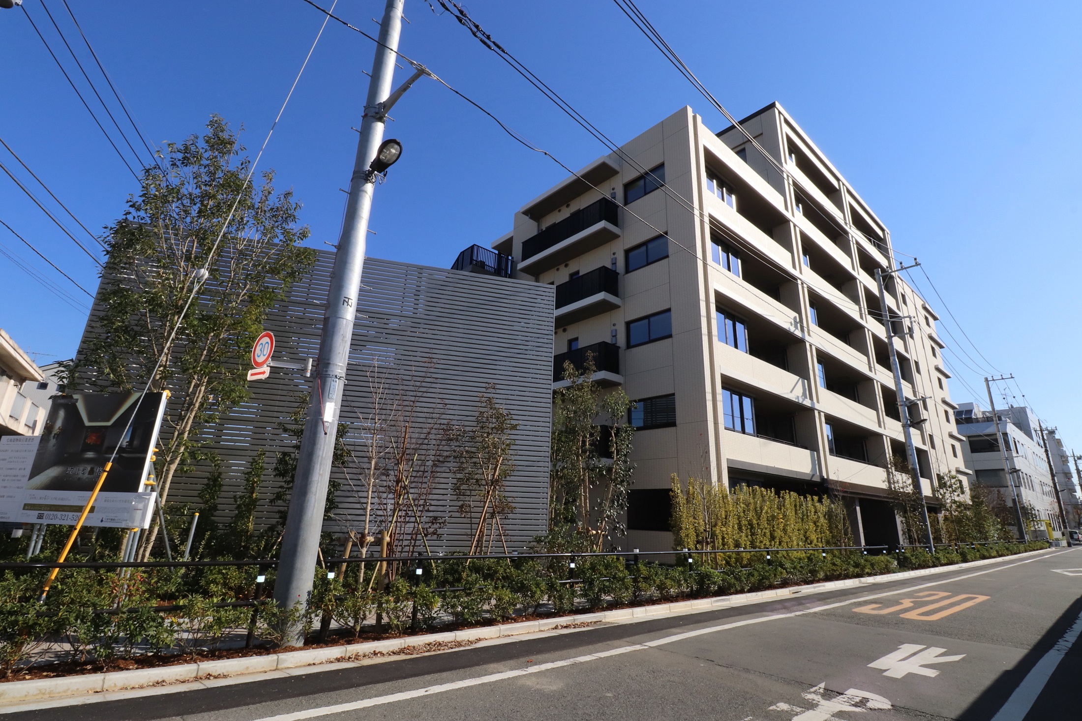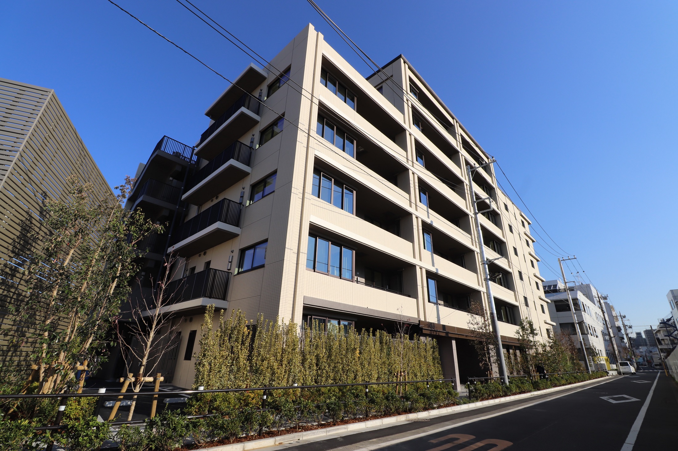 全体コンセプトを「坂上の品格」とし、外観・共用空間のデザインにおいてもそのテーマを踏襲しています。建物デザインは、同じタイルの素材や貼り方に変化を持たせることで陰影を生み出し、邸宅としての存在感を表現。落ち着いた明るめのベージュタイルをベースに、高級感溢れる大理石や風合いのあるタイルなどが使用されています。自然な風合いを持つ素材を用いて構成した「上質感」と、陰影を意識的に生み出すことによって建物に表情を付け演出した「存在感」を兼ね備えた、美しい佇まいです。