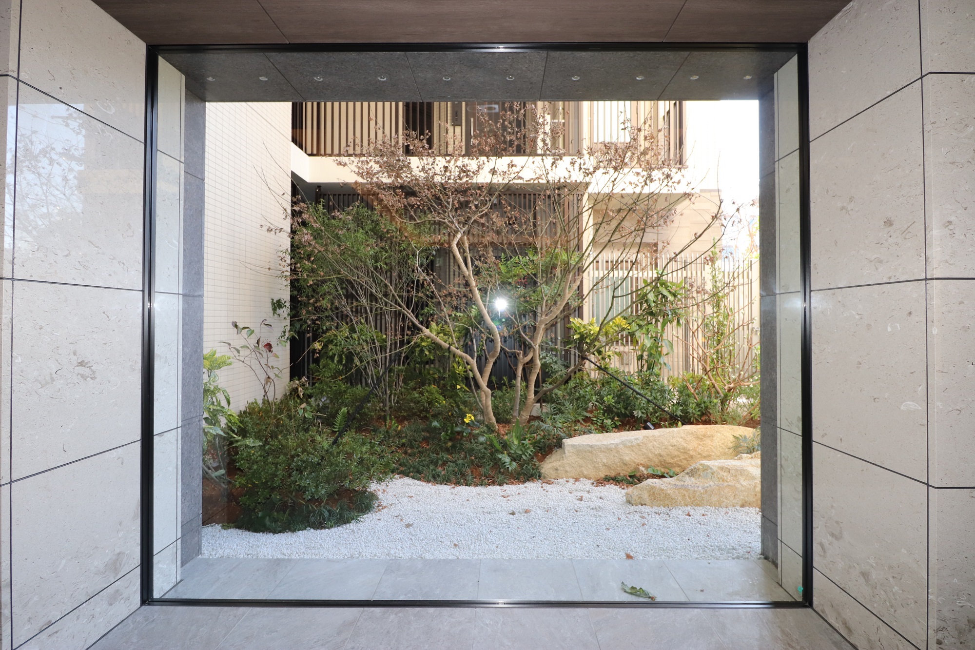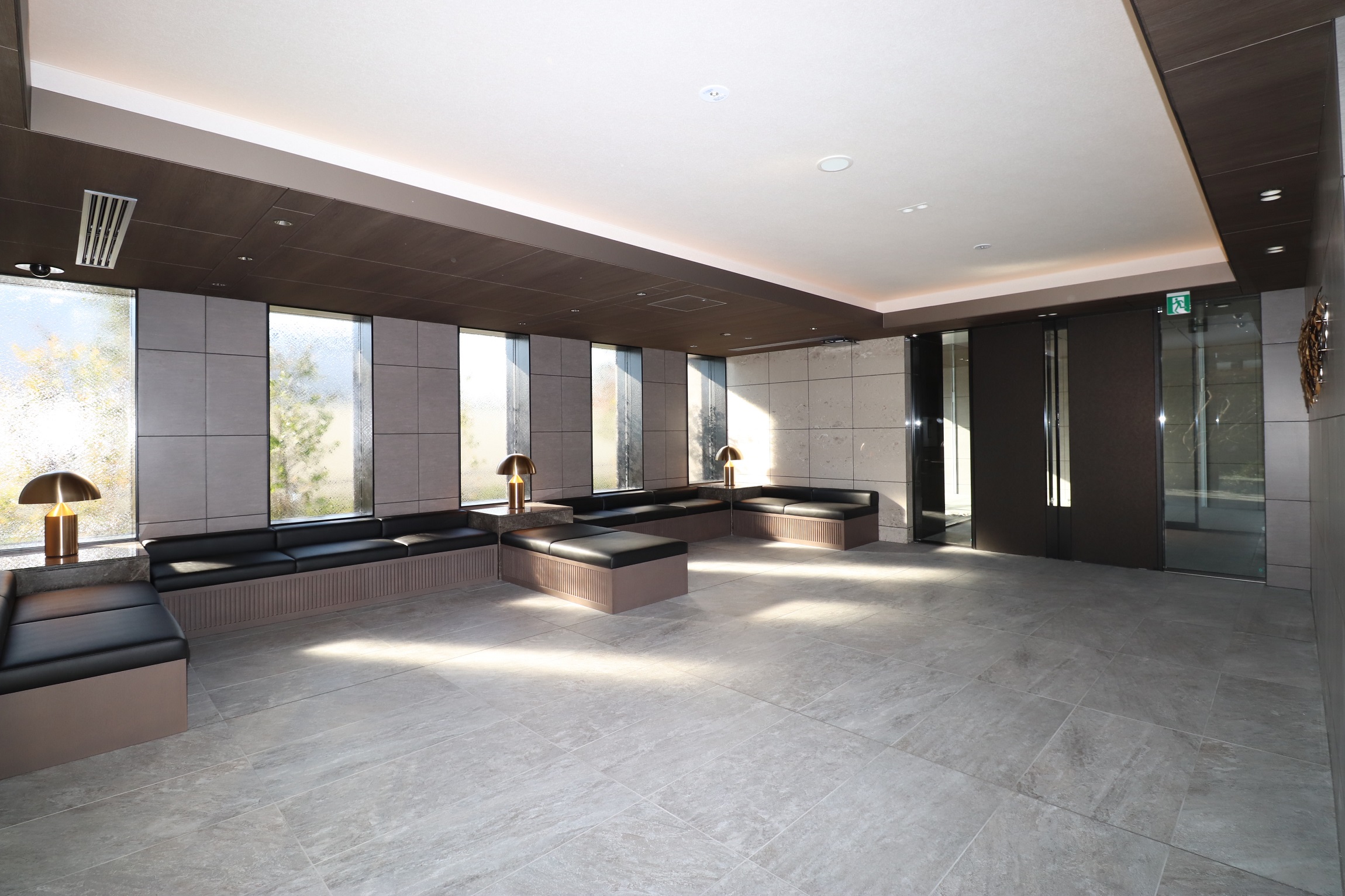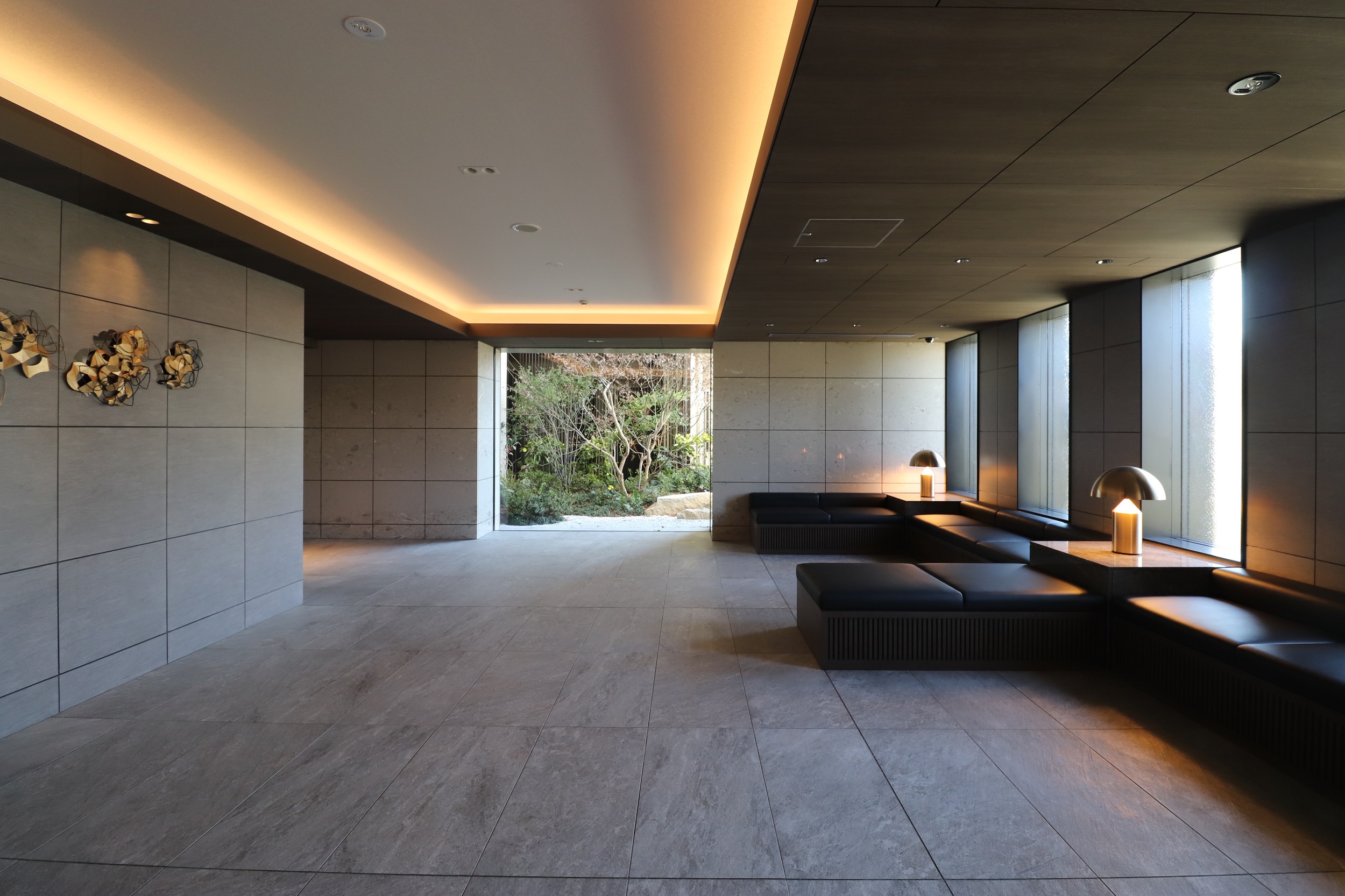 開放的な折上げ天井や間接照明の柔らかな光が、訪れる人を優しく迎えるエントランスホール。正面の坪庭には、イロハモミジやヤマザクラなど季節によって表情を変える樹々。上質なソファセットが配置され、ホール壁面には小豆沢公園に咲く桜をモチーフとしたアートが設られています。美しく華やかながらも繊細なデザインで、日々の中で四季の移ろいも感じられる、優雅な迎賓空間です。