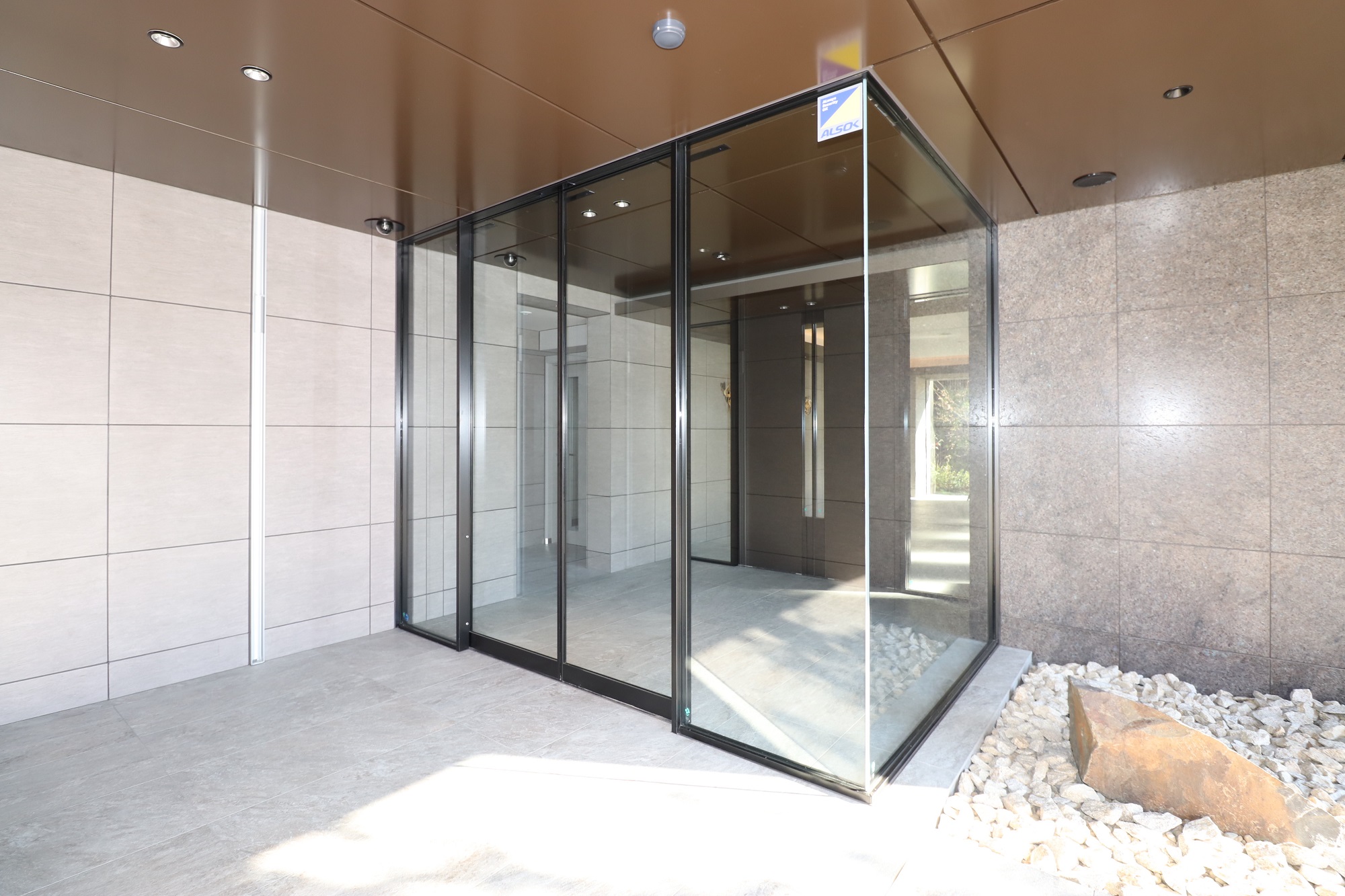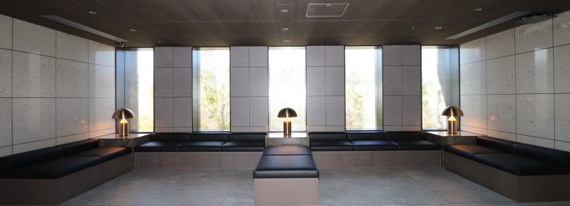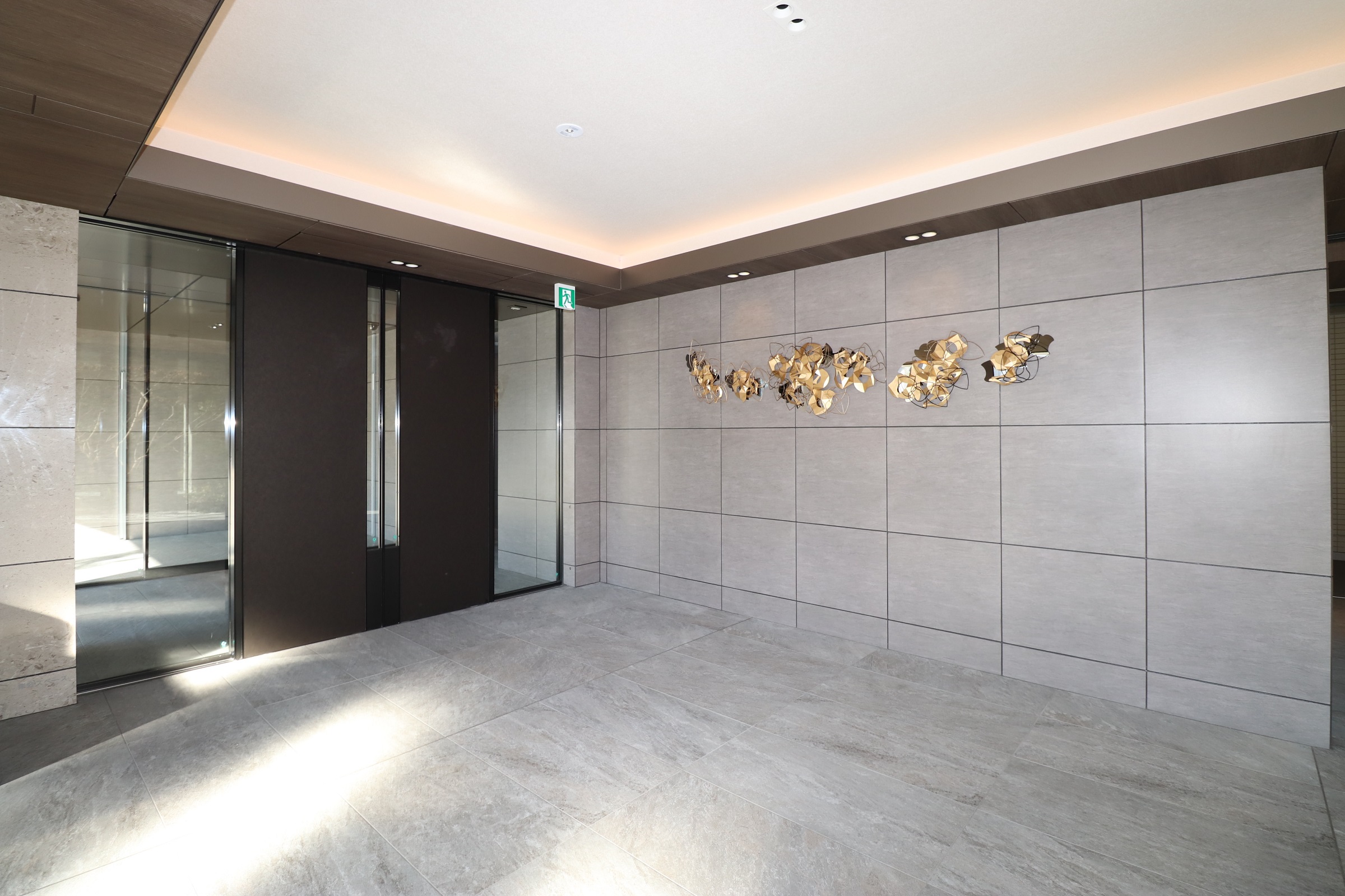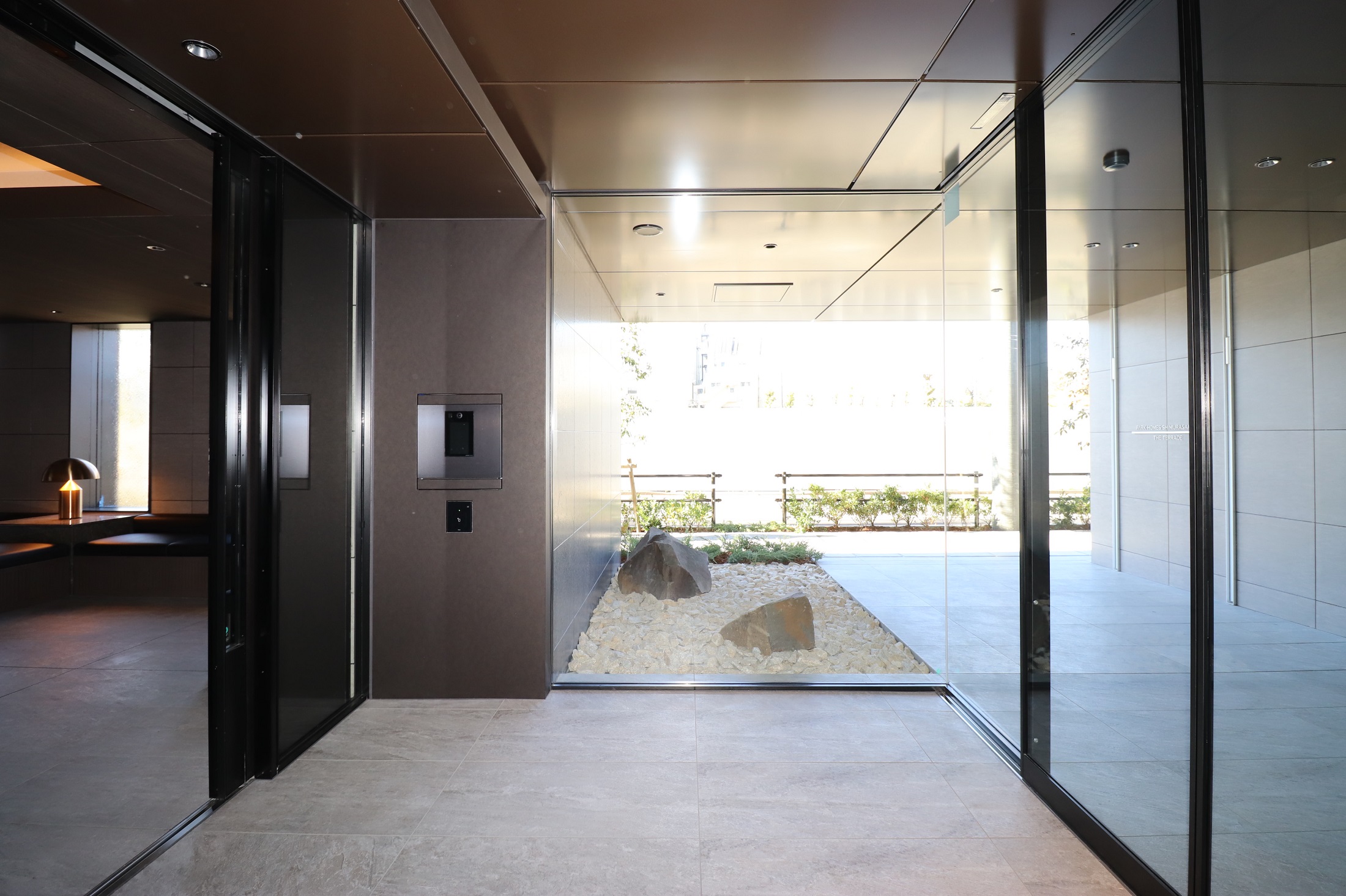 開放的な折上げ天井や間接照明の柔らかな光が、訪れる人を優しく迎えるエントランスホール。正面の坪庭には、イロハモミジやヤマザクラなど季節によって表情を変える樹々。上質なソファセットが配置され、ホール壁面には小豆沢公園に咲く桜をモチーフとしたアートが設られています。美しく華やかながらも繊細なデザインで、日々の中で四季の移ろいも感じられる、優雅な迎賓空間です。