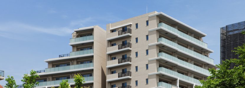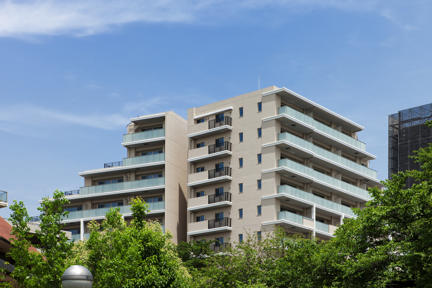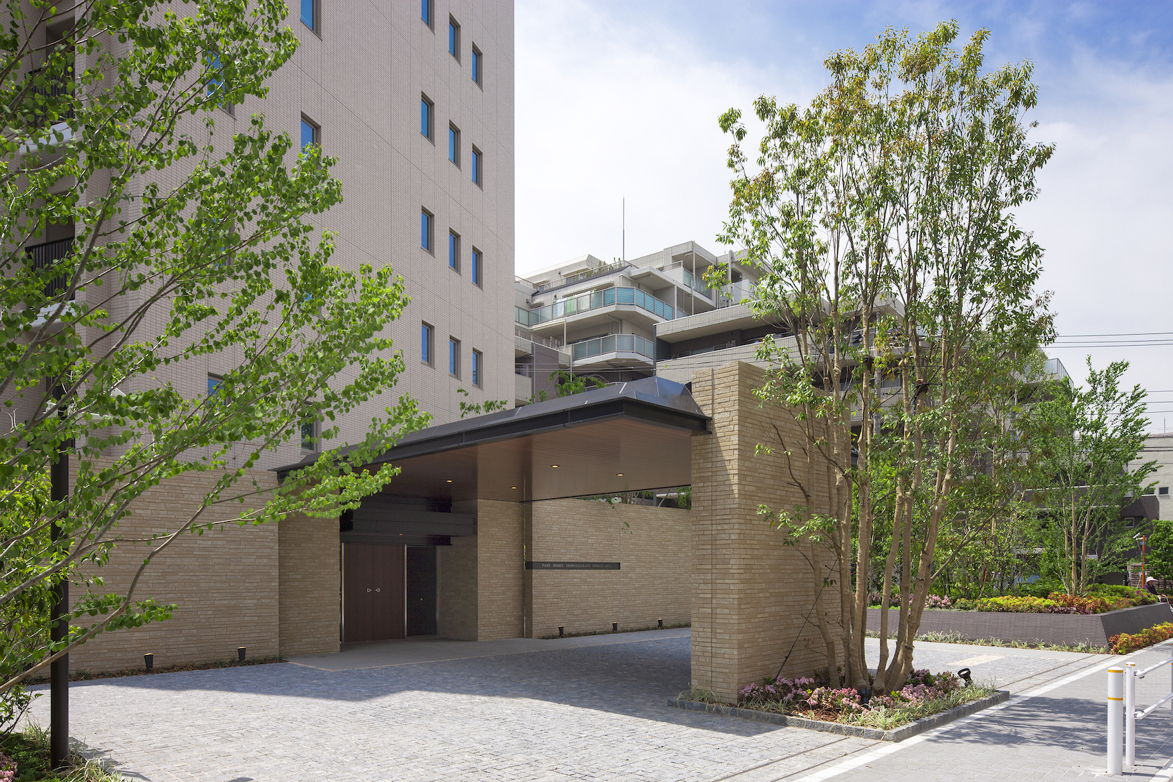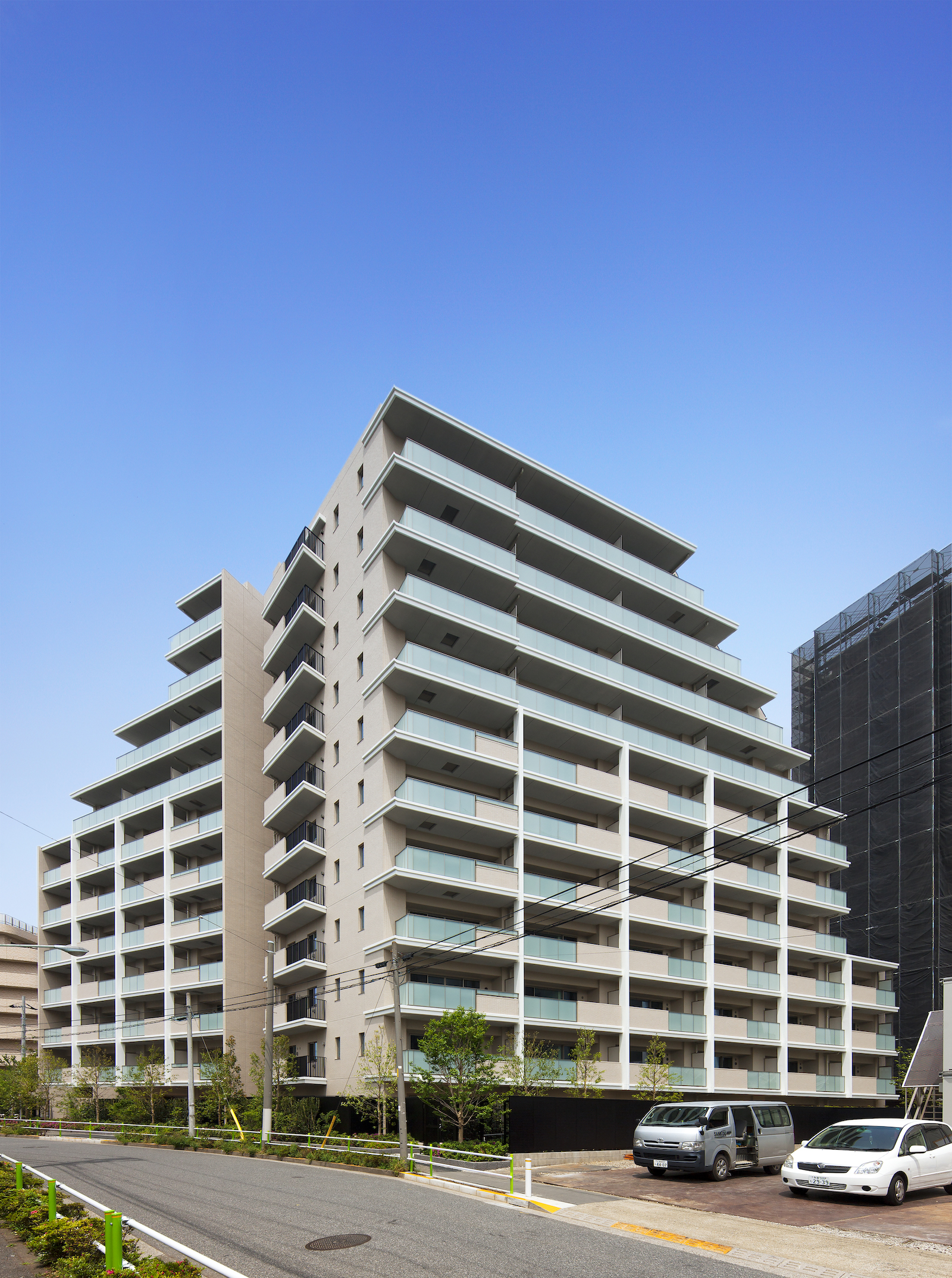 外装タイルはアイボリーを基調とし、軽やかで清々しいイメージを演出。ファサードには、水平のスラブラインと垂直のマリオンが形成するグリッドがリズミカルに連続し、そこに空を映し出すガラス手摺が透明感を添えています。さらに、エントランス廻りには風合いを感じる素材を採用。モダンな中にも気品が感じられる外観デザインです。