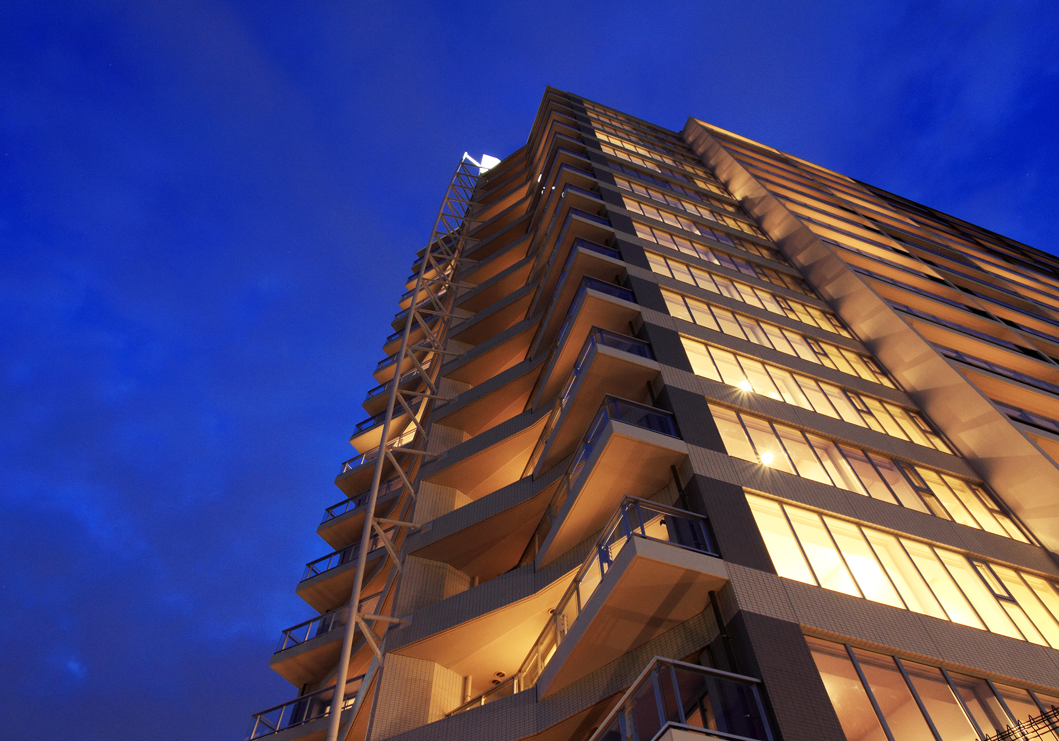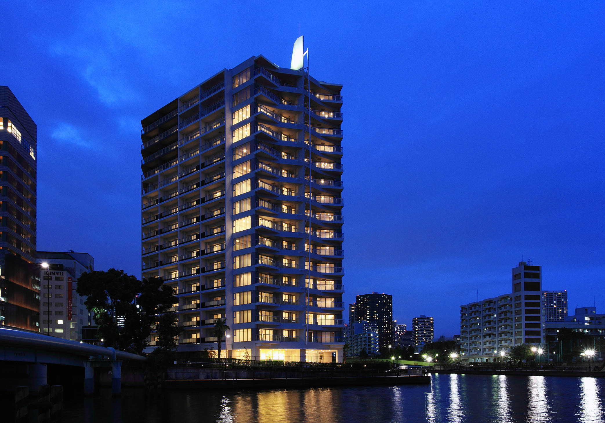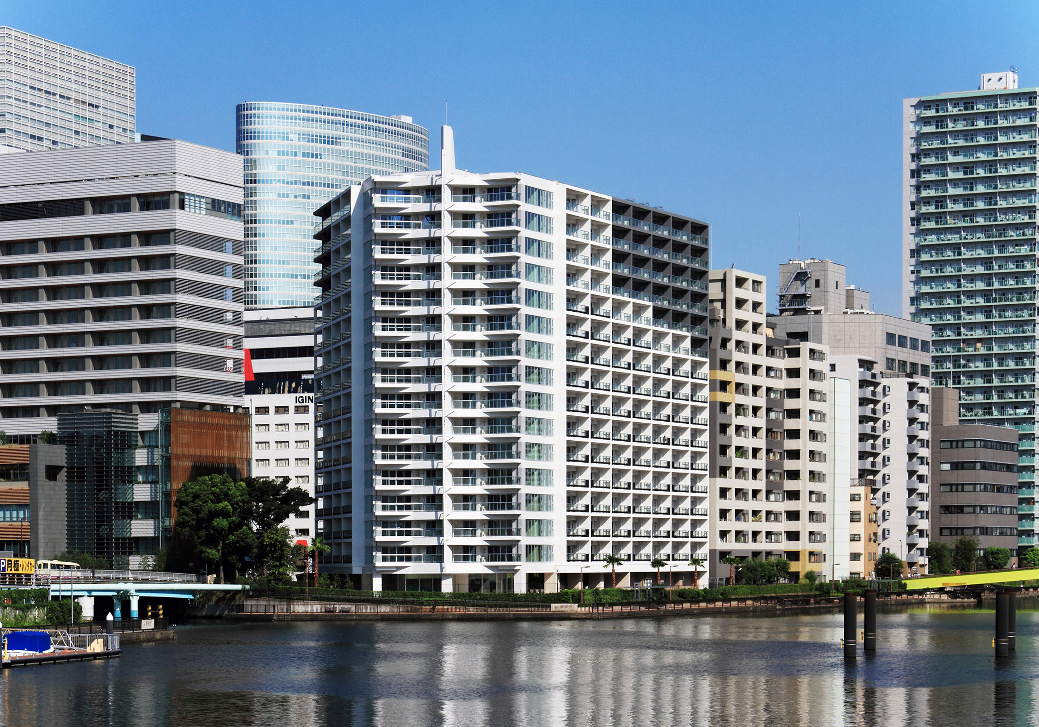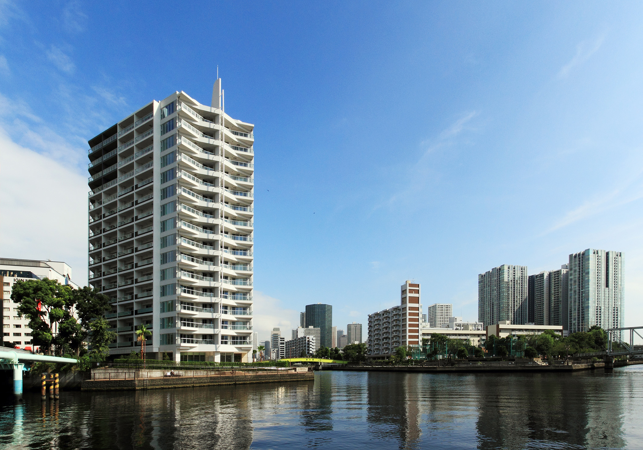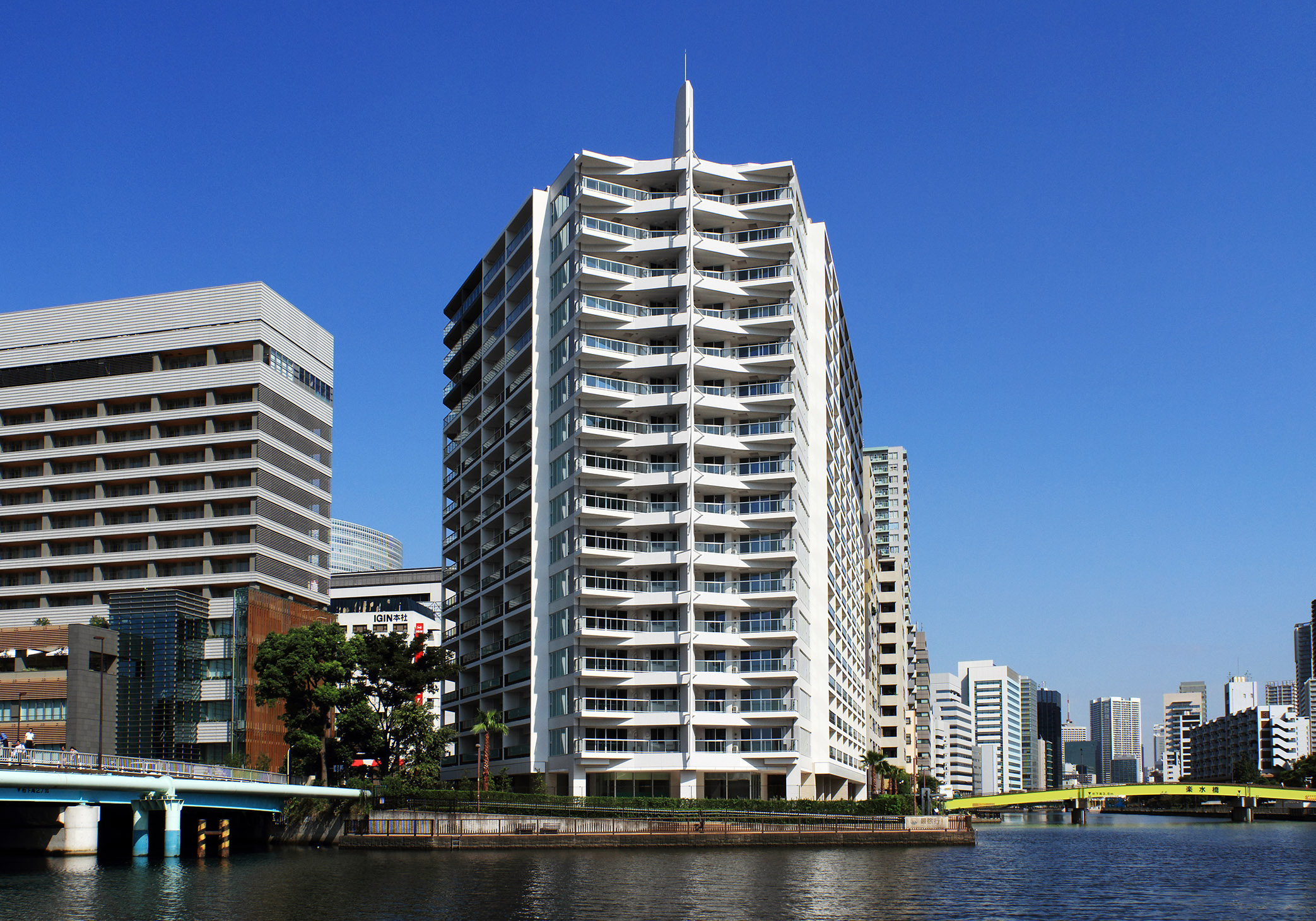 建物のコンセプトは「キール&マスト」。「キール」とは船の底にあるいちばん大事な「背骨」のこと。運河に向いた建物の端、“艦橋”にカーブを描いた「キール」を持ってきて、さらにマストを立てているような演出が施されています。ファサードの色は、「マリーンホワイト」というべき、青い海や空に映える白を基調とし、甲板をイメージした茶色を組み合わせ、“船尾”にあたる方の色を落とすことで前面の白を強調。「客船」が力強く海を前進していく姿を演出しています。