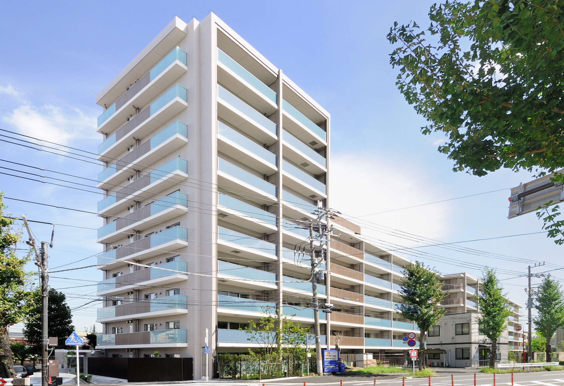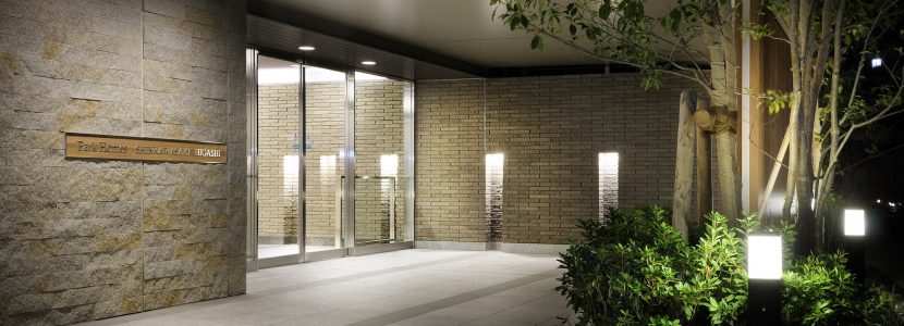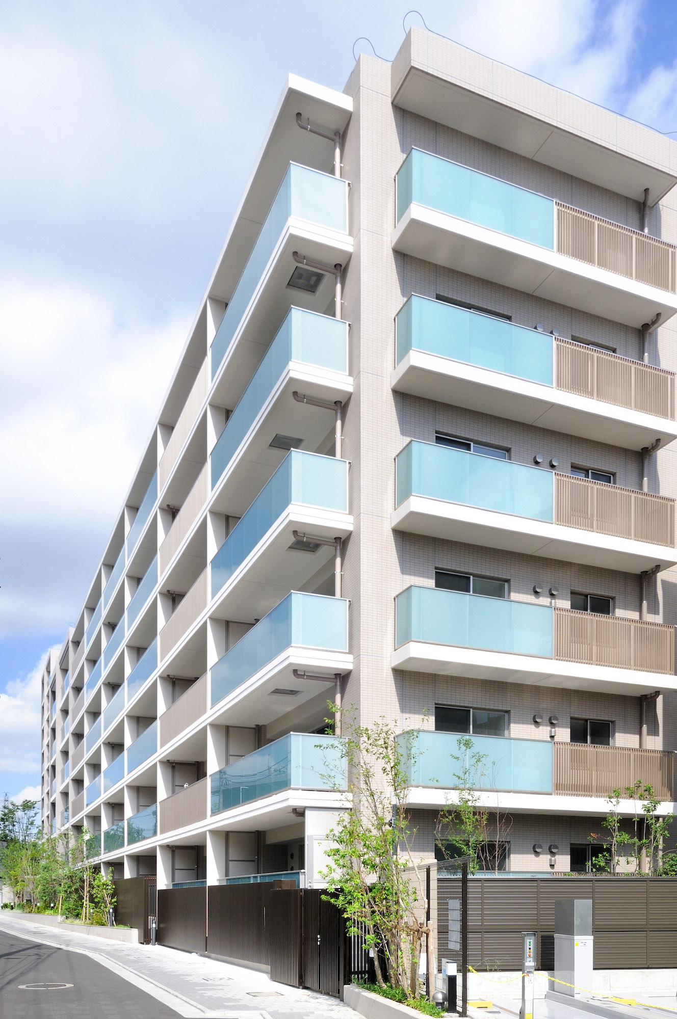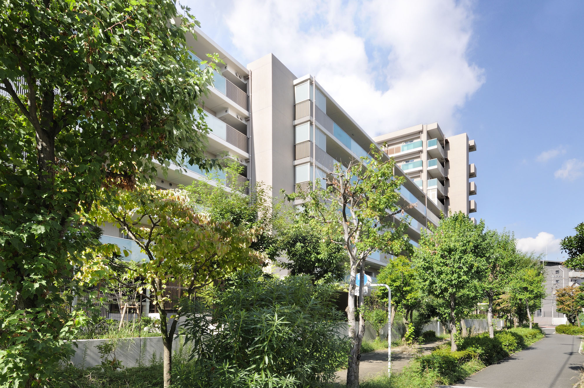 緑豊かな古市場コミュニティ道路(緑道)に寄り添うようにして佇む「パークホームズ新川崎東」。北東面は豊かな風景と調和を目指し、共用廊下の手摺には、ブルーと乳白色のガラスを市松模様に組み合わせたデザインを採用。緑道の緑と相まって、深みのある景観をつくりだしています。南西面のファサードは、縦ラインのマリオンと、水平ラインのガラス手摺により、格子形状のスクエアなデザインを形成。ブルーのガラスとアースカラーを基調としたタイルそして木目調の格子による、異なる素材のコンビネーションがモダンな雰囲気を創出しています。