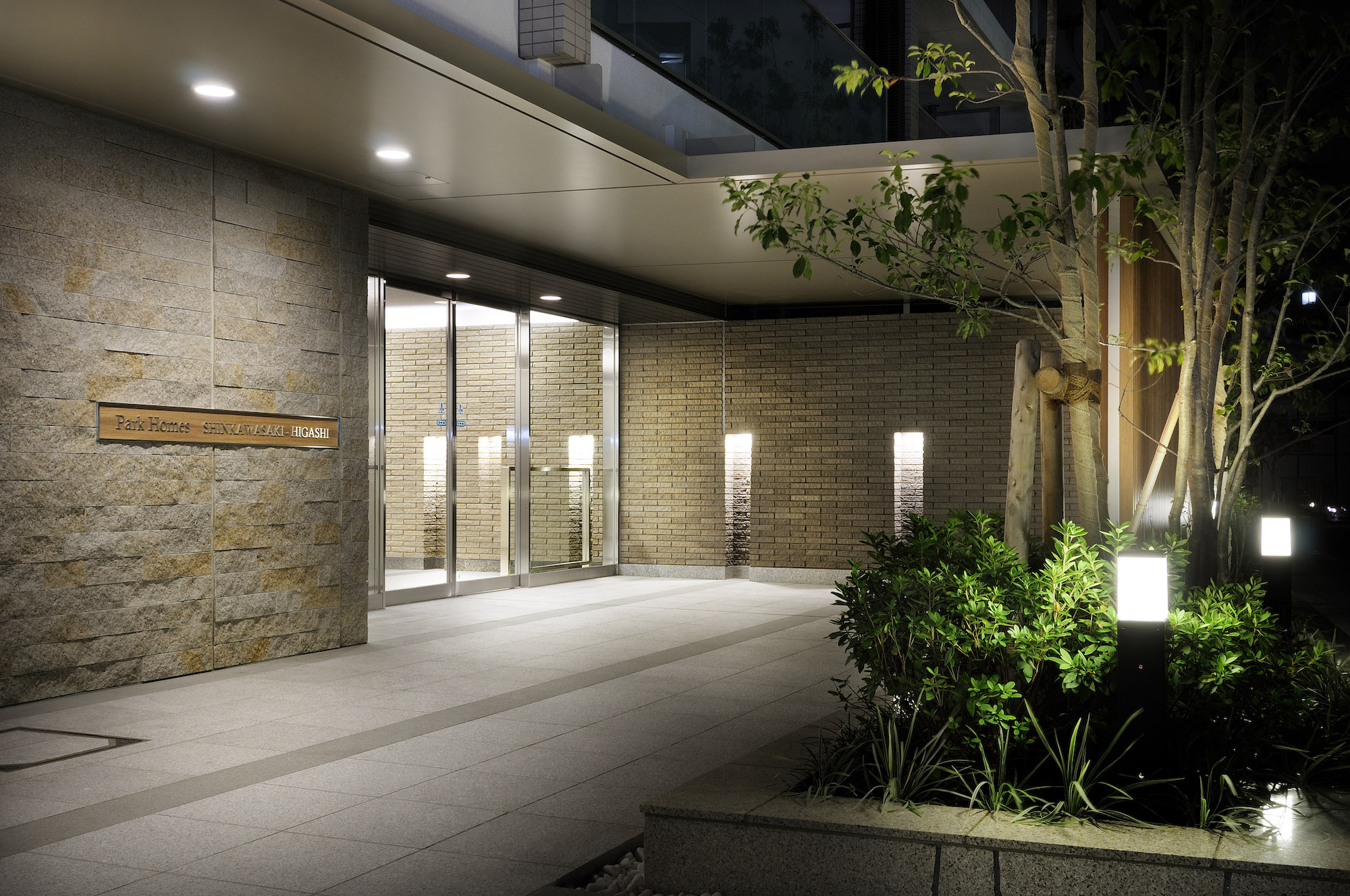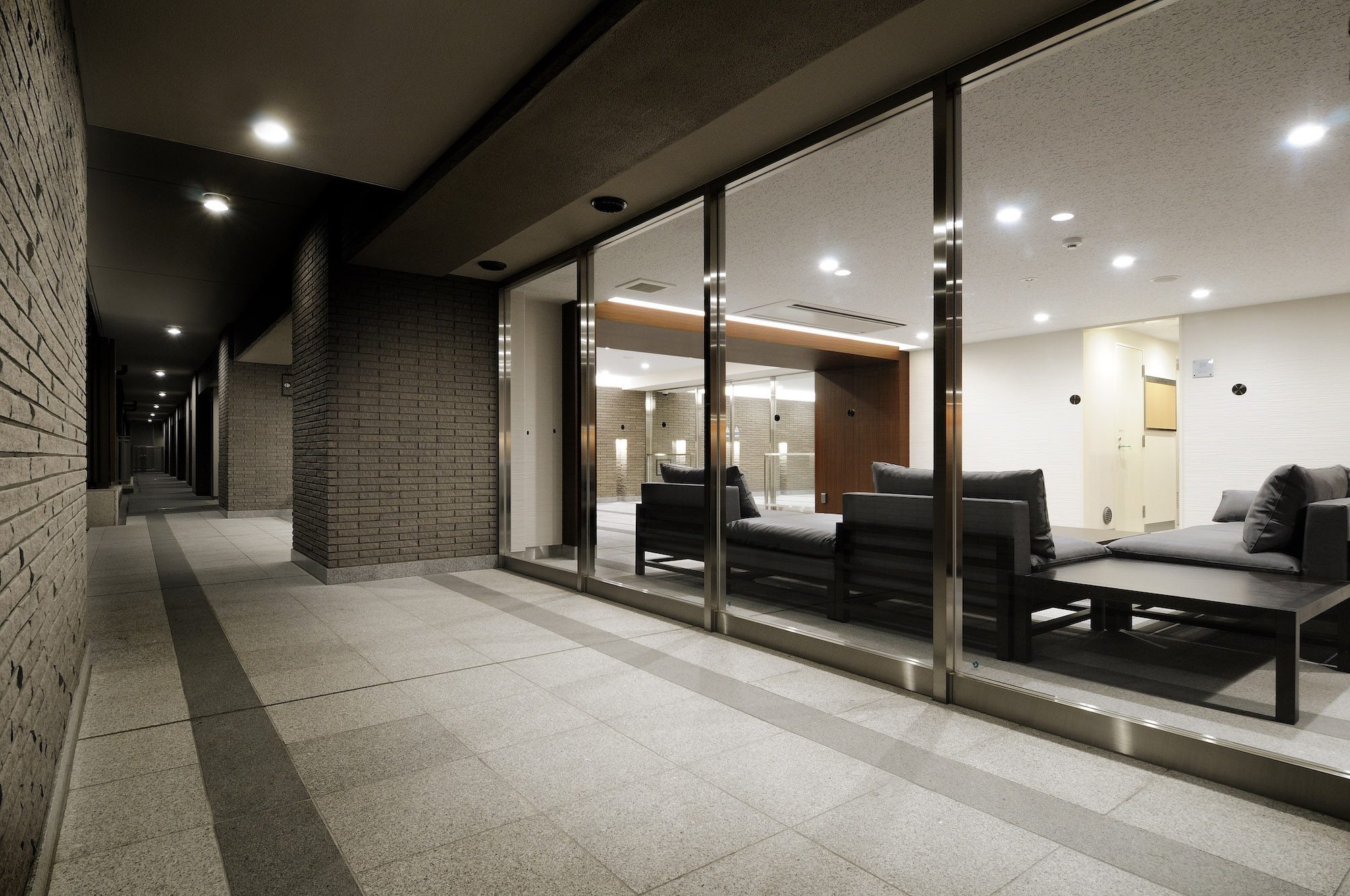 直線で構成されたフォルムが、フォーマルな雰囲気のメインエントランス。開放感のあるガラスや優しさを醸しだす木目調の縦格子、御影石貼りのウェルカムウォールとシンボルツリーが訪れる人々を迎えます。その先に広がるのは、もてなしの空間として設えられたエントランスホール。瀟洒な装いの中にも柔らかさを表現するために、床面には御影石、壁面には磁器質ボーダータイルが採用されています。ロビーは、坪庭の緑を眺めながら、住まう方が交流を深める場として、お客様を招き語り合う場として、暮らしの用途に合わせて利用可能です。