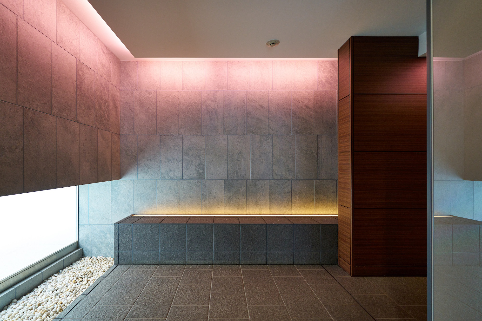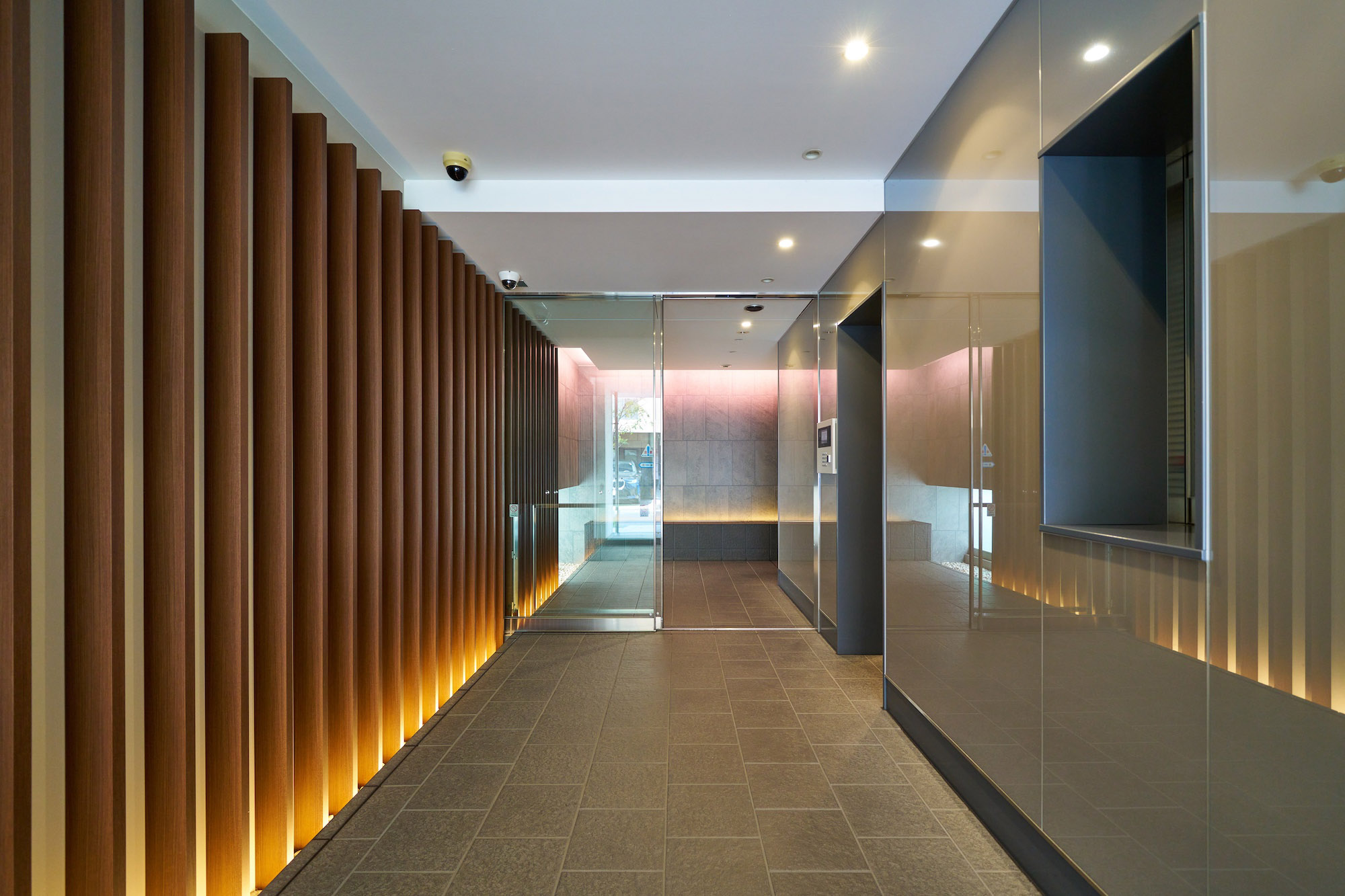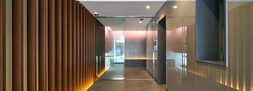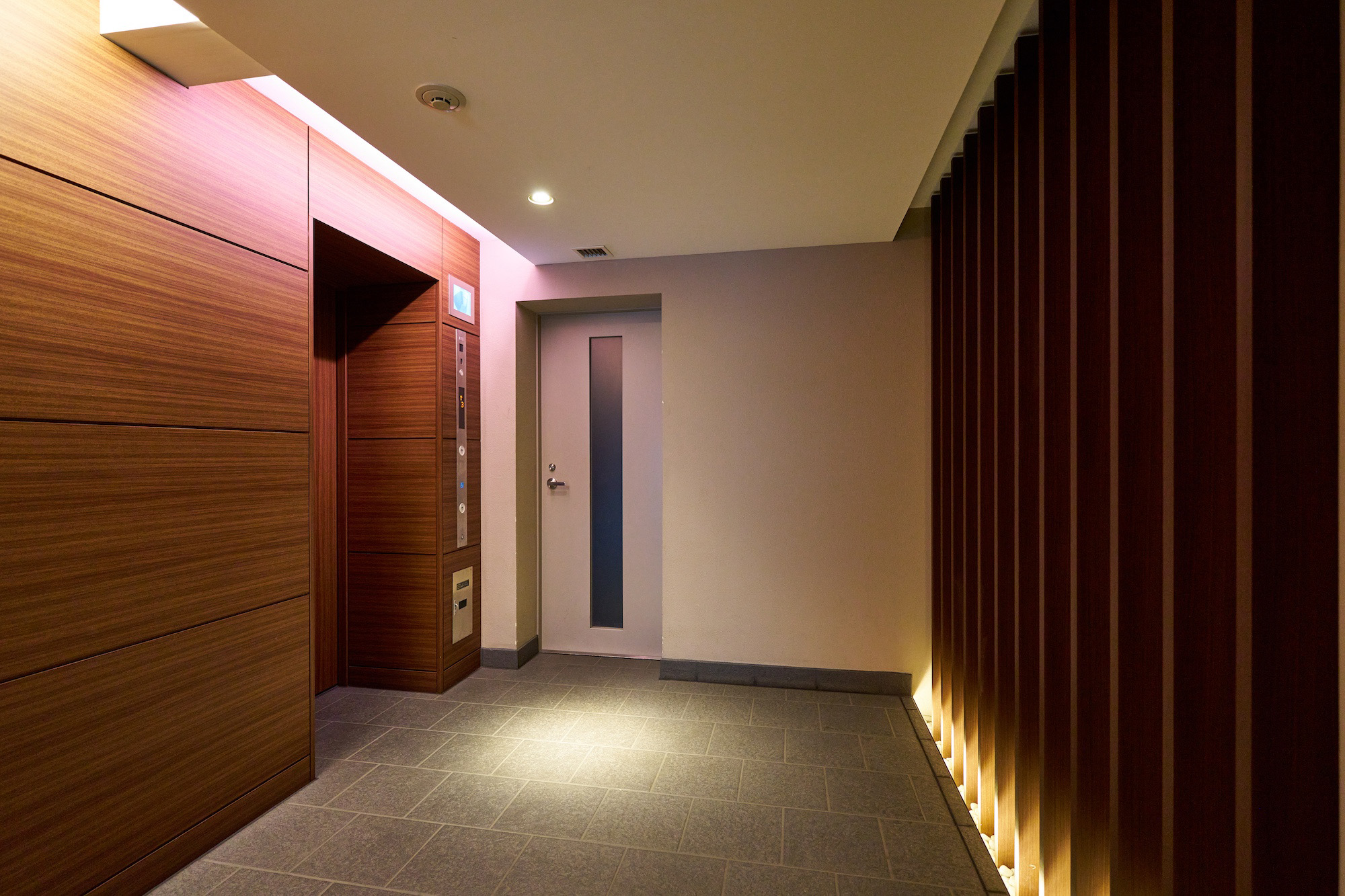 わが家に辿り着いた時まず初めに訪れる“ほっとする瞬間“、それは、端正な佇まいのエントランスに迎えられた時。踏み入れると、間接照明に浮かび上がる縦ルーバーが奥へ連続し、坪庭やガラスの反射と共に、変化に富んだアプローチ空間を形成しています。通り抜ける中、リズミカルな設えに心がほぐれ、そこから安らぎの時間が始まります。