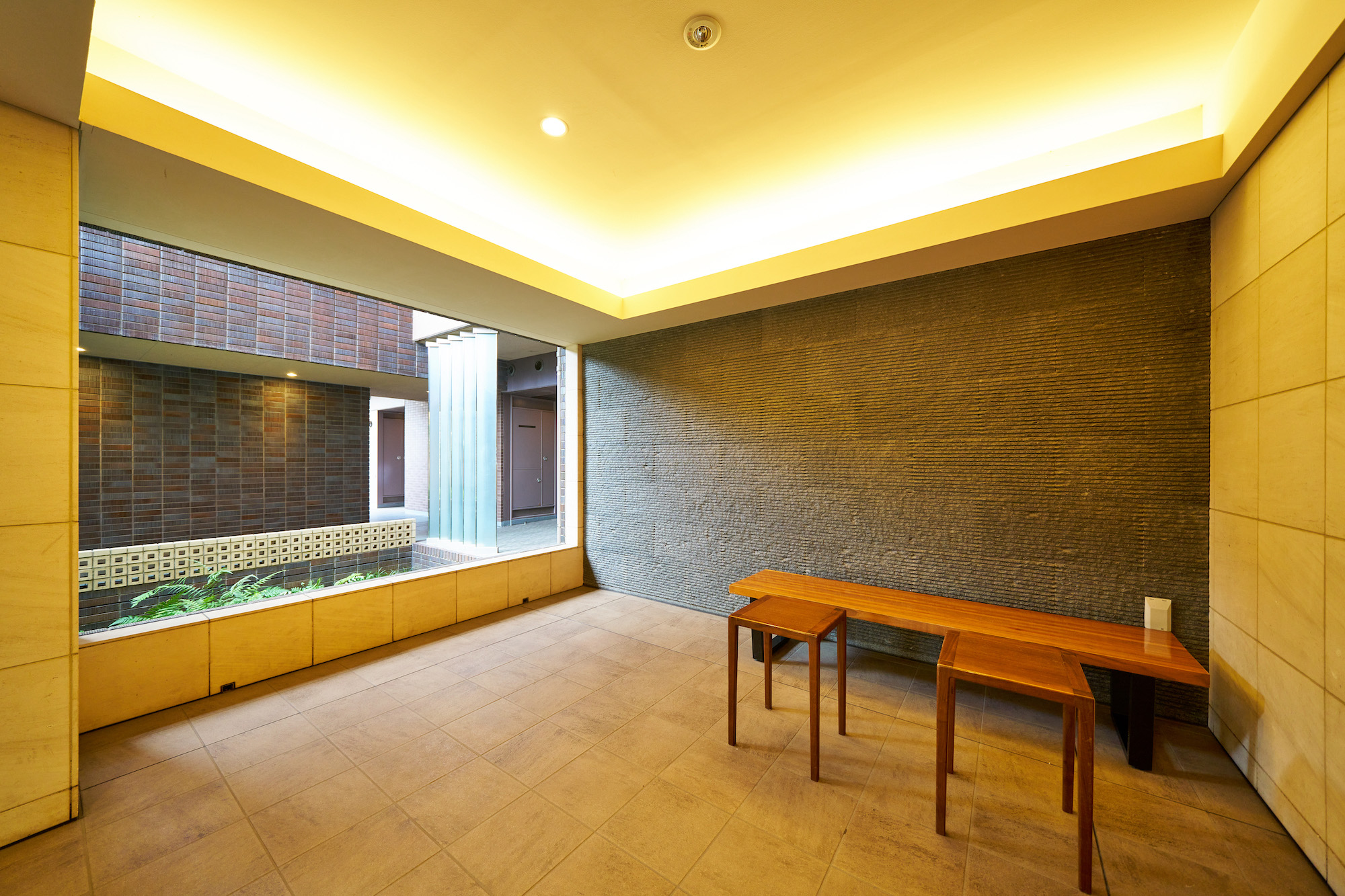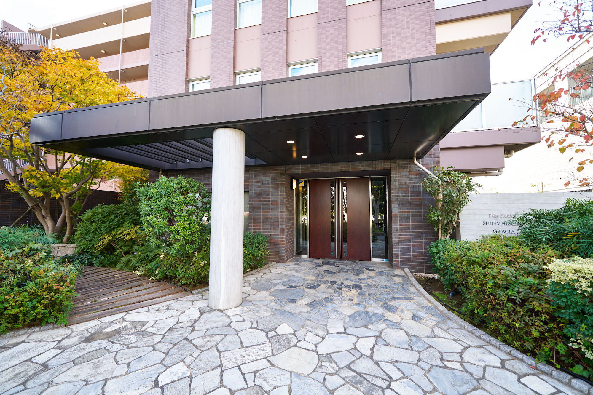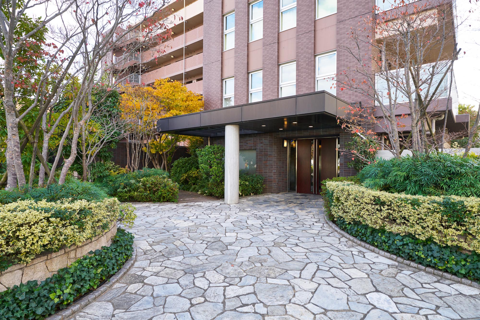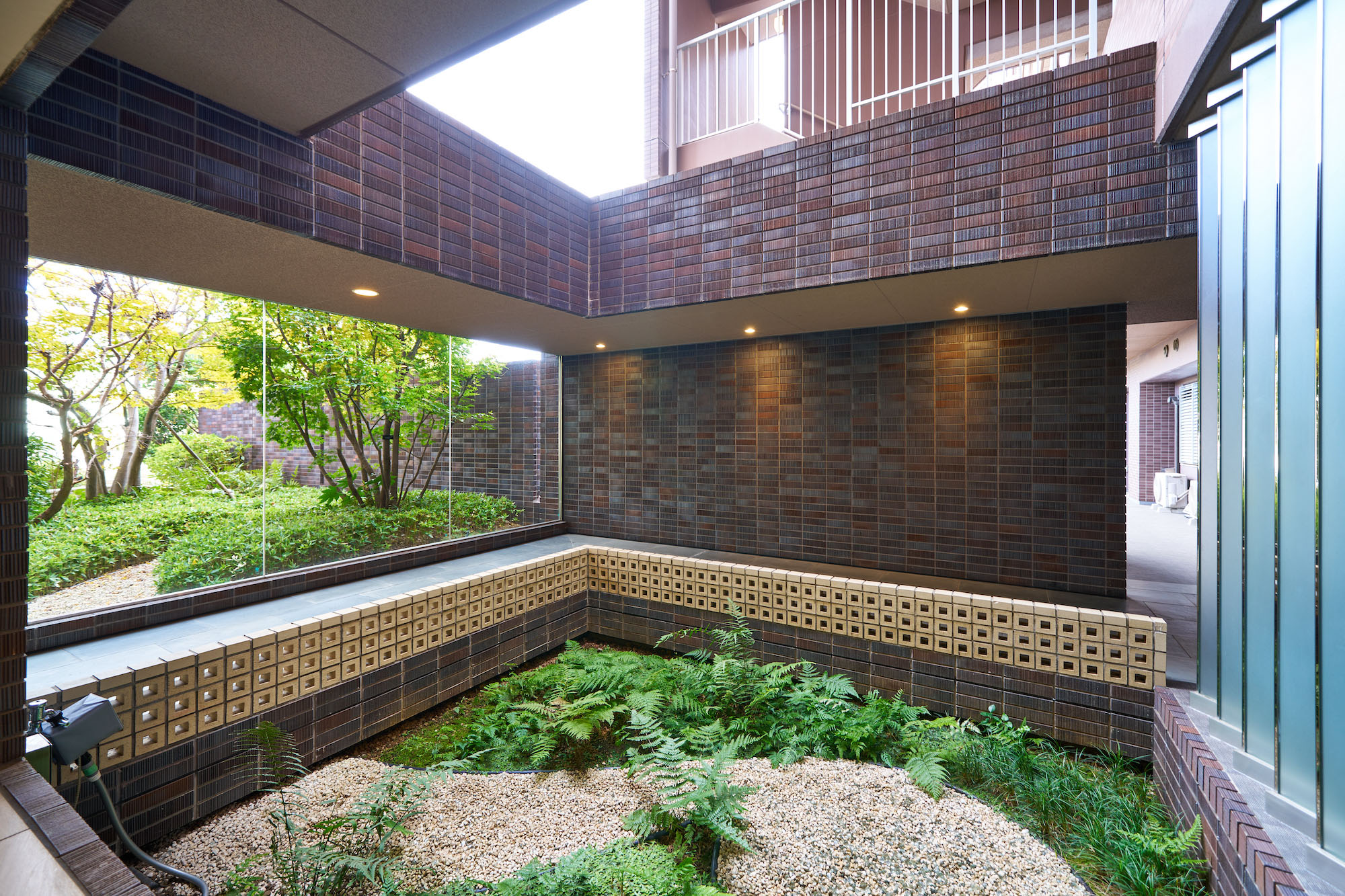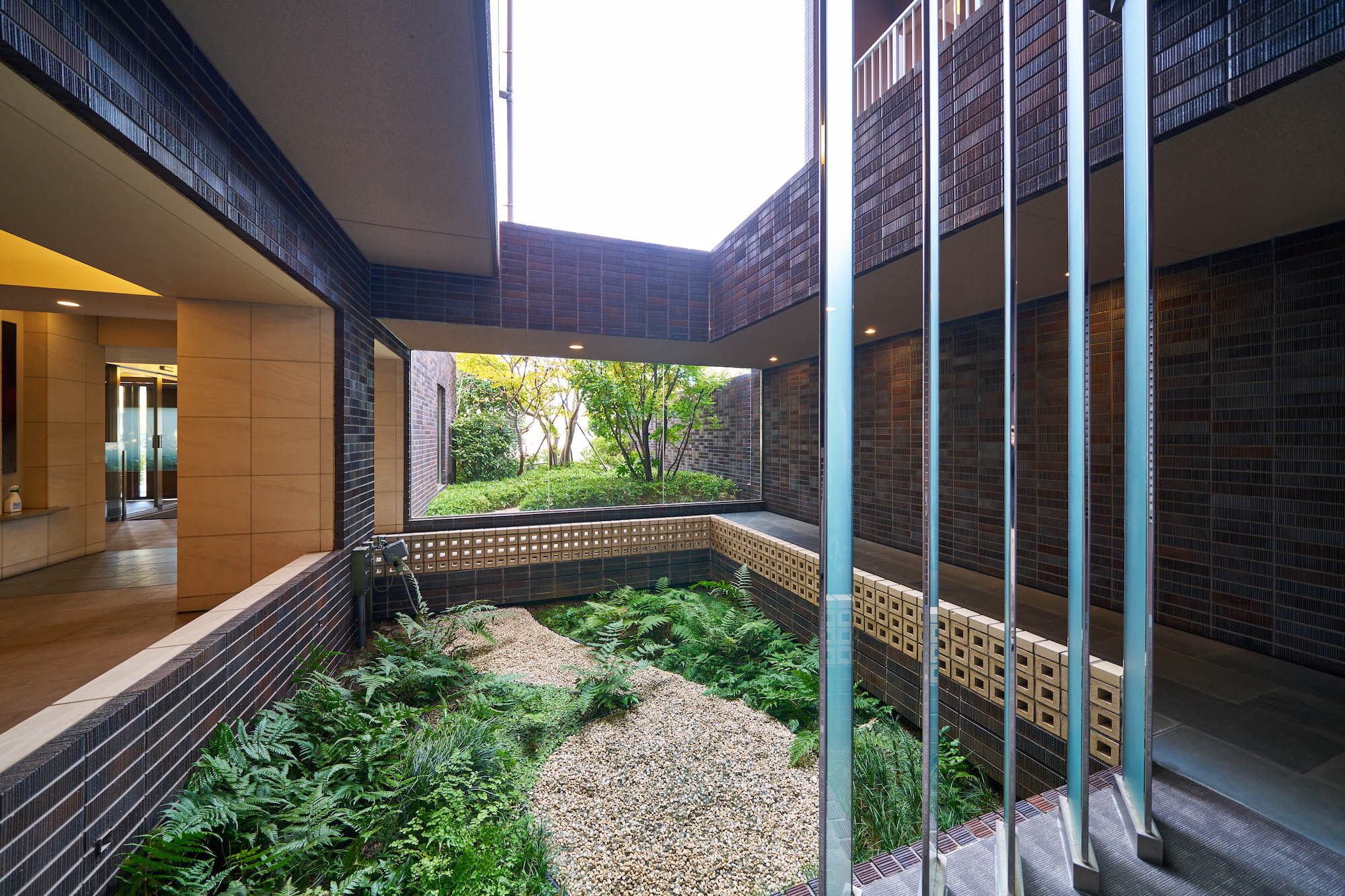 隣接する「やなぎ公園」とのつながりを意識して、エントランス前にはゆとりあるスペースが設けられ、豊かな植栽が配置されています。邸宅にふさわしい石畳みの道、大きな柱と庇が堂々としたエントランスを形成。庇の半分はパーゴラとなっており、その木漏れ日が優雅な雰囲気を演出しています。光と影のコントラストが美しい、やすらぎの空間です。また、建物内にも坪庭が設けられており、外の樹木を背景に、水の流れを模した砂利が橋の下を流れるように外へ向かって伸び、エントランス前の植栽へのつながりを感じさせます。坪庭の周りは回廊になっており、朝は爽やかな気分で出発し、帰宅時はリラックスして家族のいる住まいへと、気持ちの切り替えをサポート。住まいの外と内をやすらぎでつなぐ空間となっています。