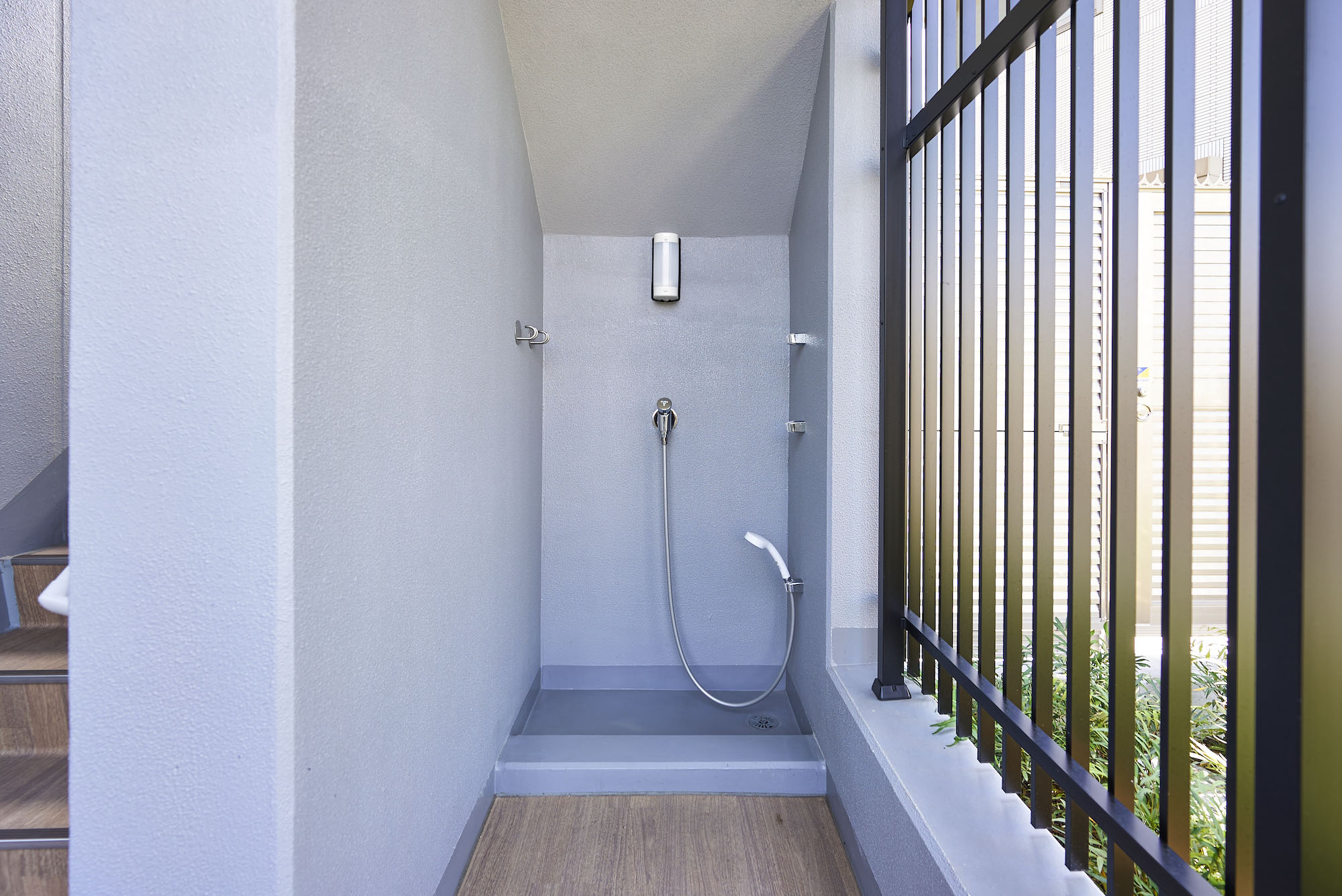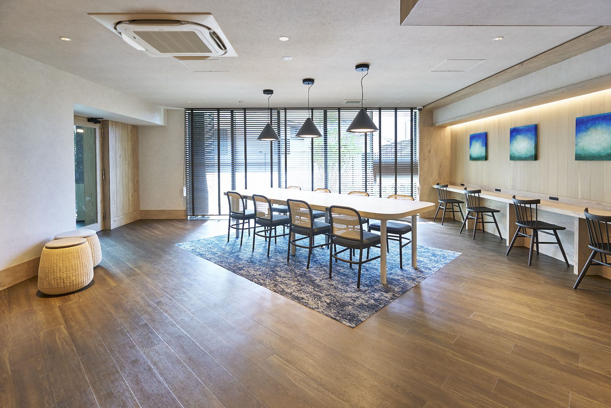 共用部のコンセプトは「Secret Beach House」。海へと続く洞窟をイメージした落ち着いた雰囲気のエントランスホールから、明るく開放感のあるシェアラウンジへと人々を誘うことで、隠れ家的なテイストが創出されています。シェアラウンジには、ビッグテーブルやカウンターテーブル、ソファセットを設置。住まう方同士のコミュニケーションはもちろん、ワーキングスペースとしても利用できるよう、コンセント・Wi-Fi環境も整備され、飾り棚にディスプレイされた海にまつわる小物などが空間を美しく彩ります。レンタサイクル、ペット足洗い場、サーフボード置場・洗い場もあり、湘南らしいリズムとスタイルで人生を愉しむ、そんな暮らしが叶います。