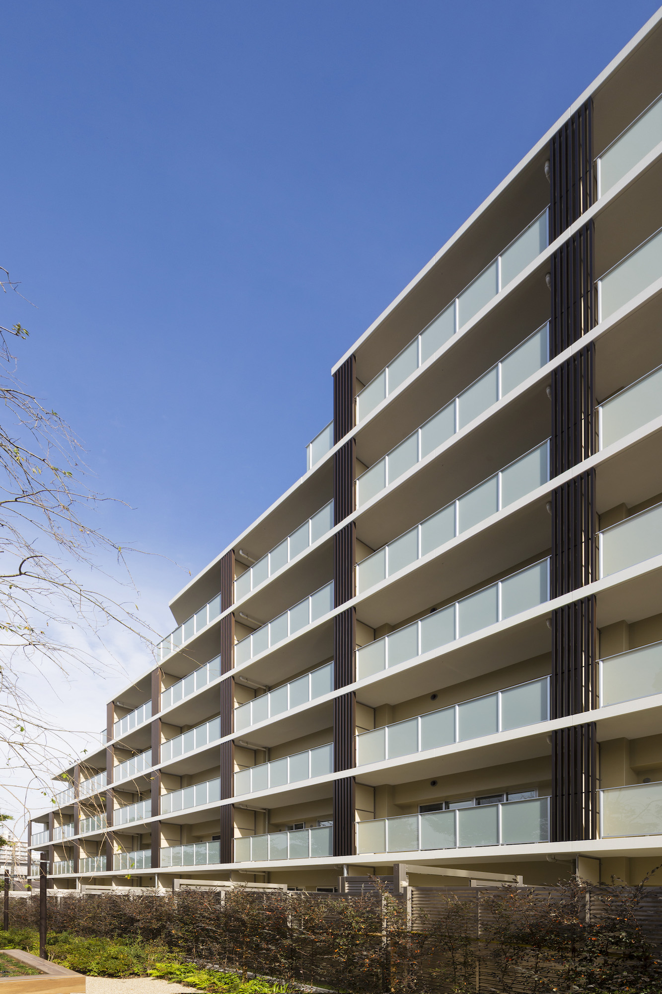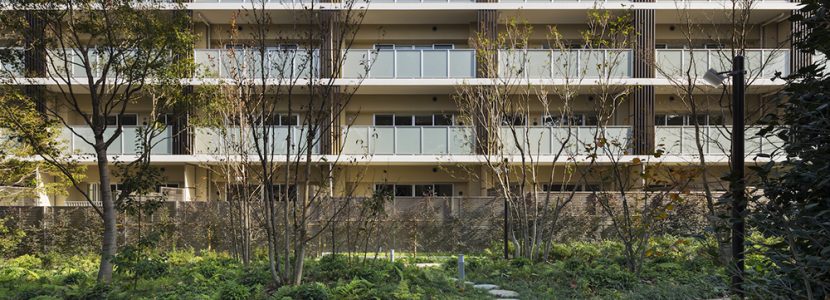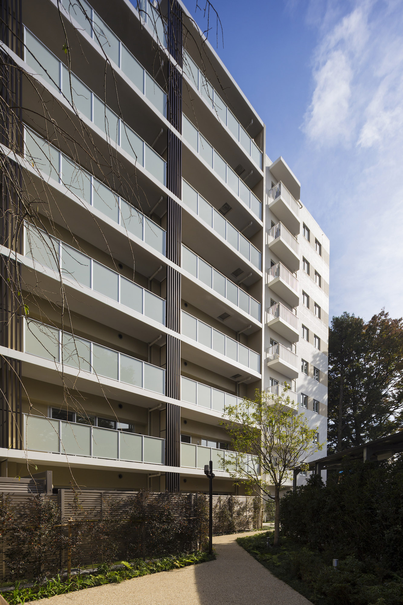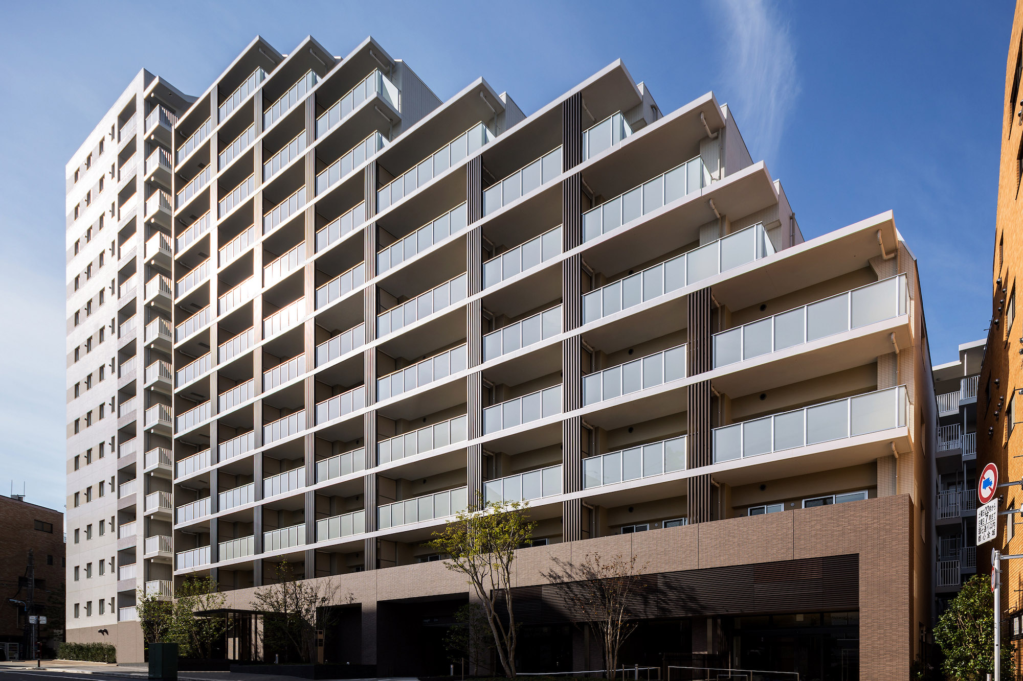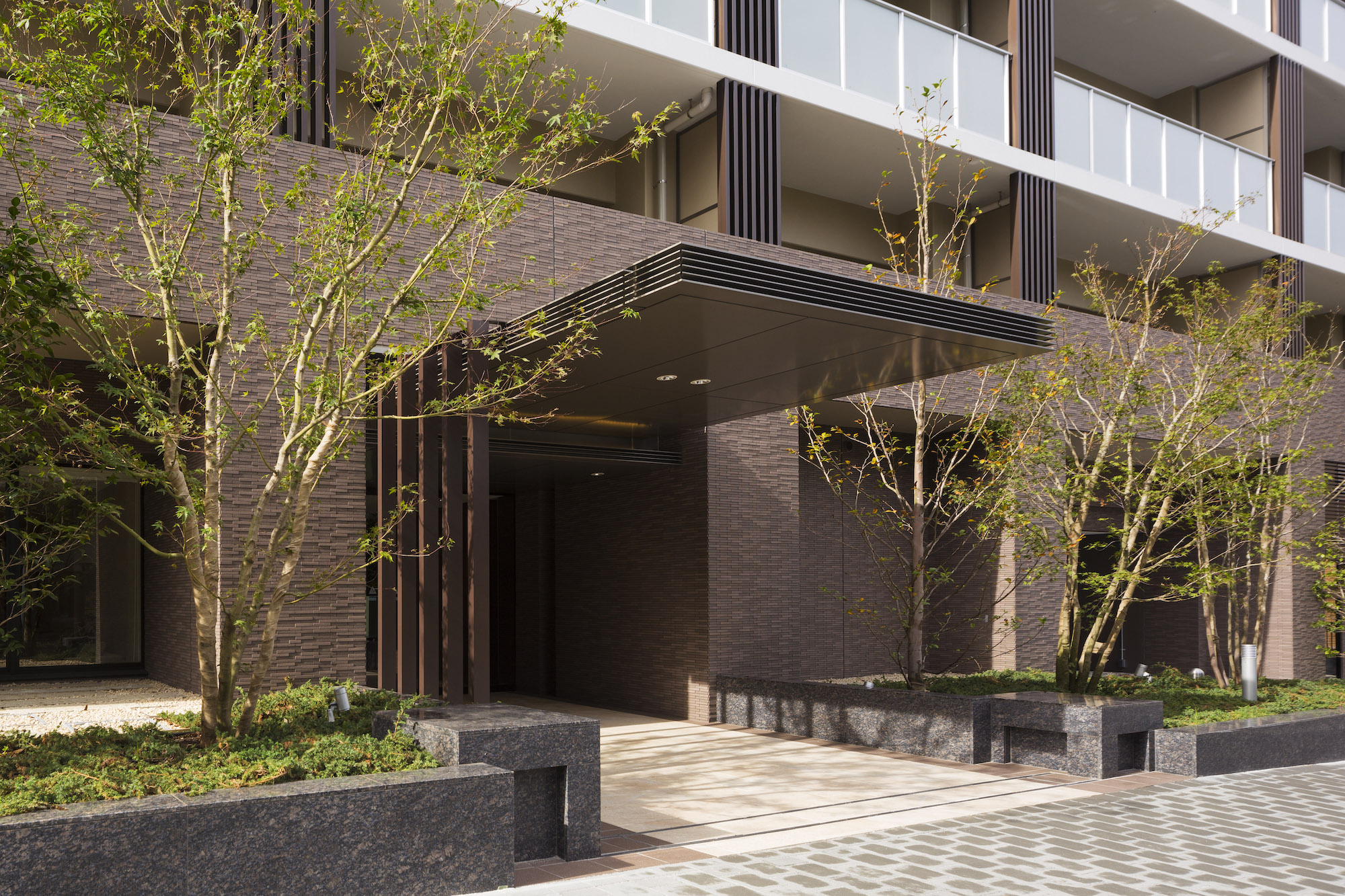 外観のデザインコンセプトは、「大樹と暮らす邸」。地上13階建、3棟構成のスケールを擁しながらも、外観はオフホワイトのモダンなカラーとし、そこに木の幹をイメージしたマリオンをアクセントに加え、水平ラインを強調したバルコニー形状や、ベージュ系のアクセントタイルにより建物を分節することで、街並みとの調和を図っています。また、基壇部には大地の重厚感をイメージしたボーダータイルがあしらわれ、地表から生える樹木が建物全体で表現。樹齢を重ねた大樹の杜が足元に広がり、澄み渡る空に優美なシルエットを描くように、街並みに調和しながら美しい風景となる佇まいです。