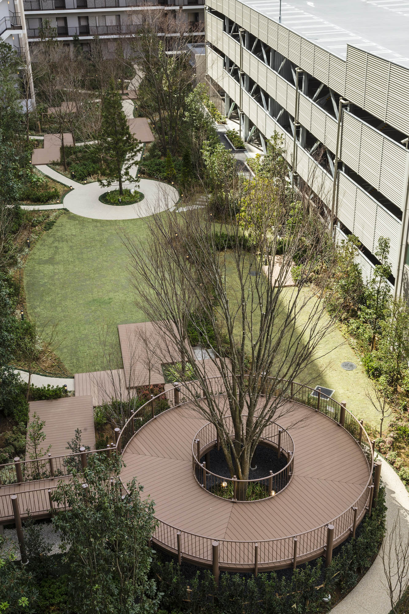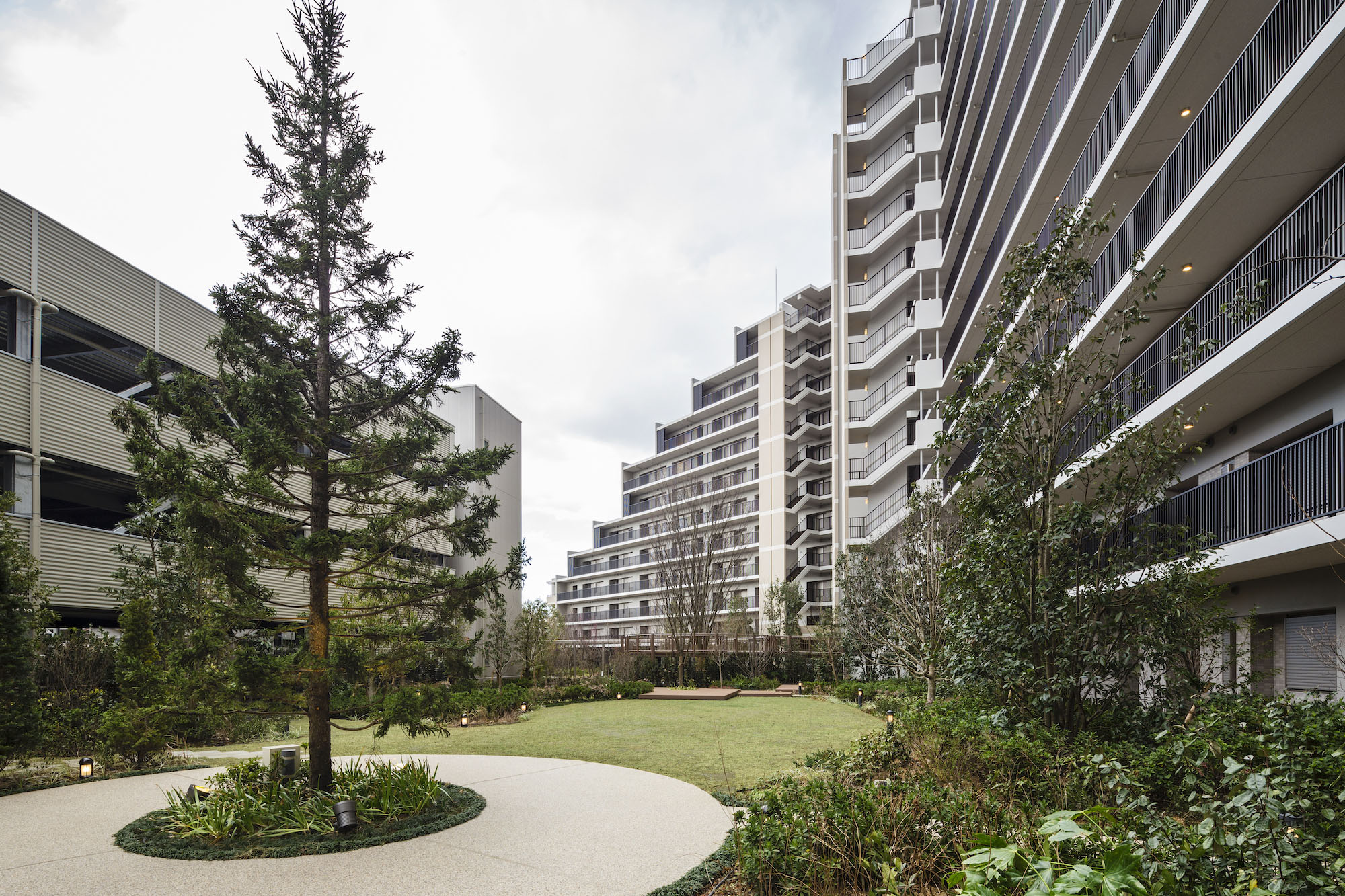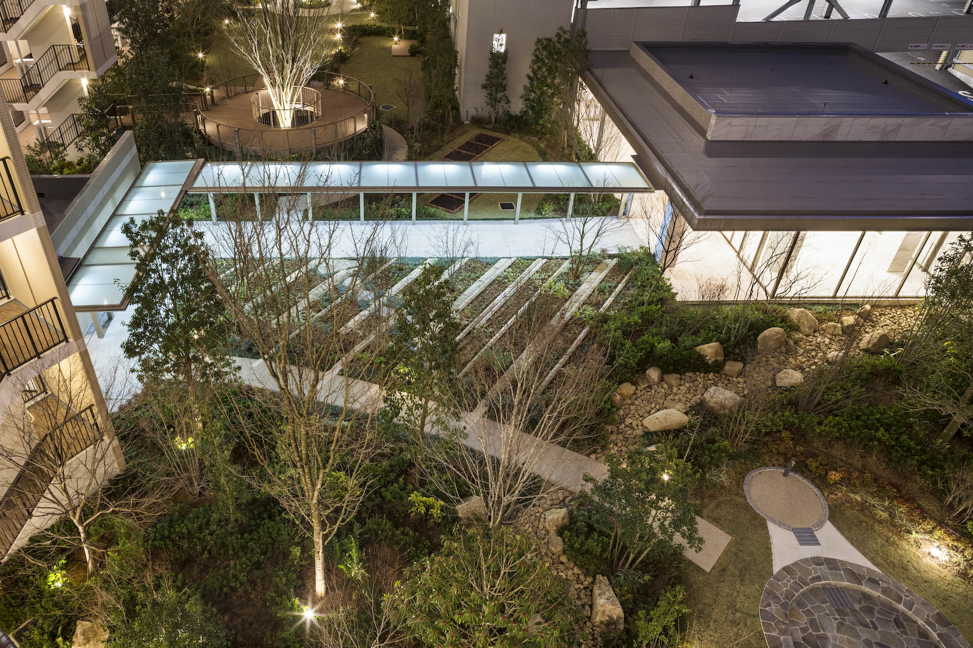 大らかな空、爽やかな風、豊かな大地を育んできた川などの立川の自然要素を建物デザインに踏襲。軽やかさや涼しさ、流れを感じる「縞模様」をモチーフとして、全体が表現されています。リズム感を持たせたタイル構成や飾り柱のマリオン、空を映し込むガラス手すりなどさまざまな工夫を重ねて、自然の美しさと現代的な造形を融合。地域に調和する表情と風情を演出しています。