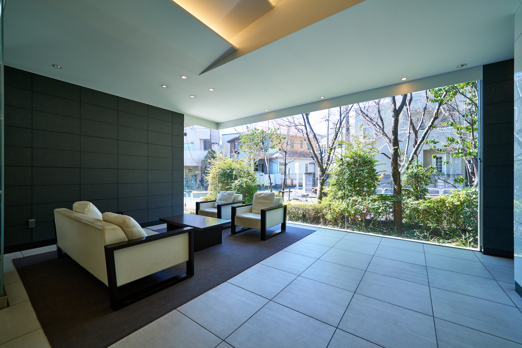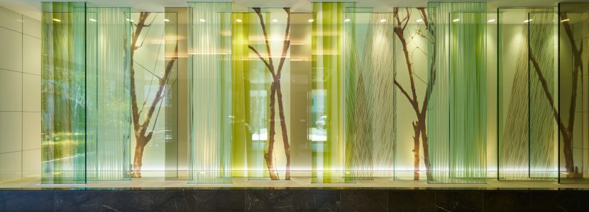 エントランスホールへ一歩踏み込めば、目の前には木立や木漏れ日をイメージしてデザインされたガラスウォール。時間ごとに変化する照明に浮かび上がる美しい装飾が、四季の邸へと優雅に迎え入れてくれます。そのそばには、グラデーションフィルム採用のガラスによりプライバシーに配慮しながらも、桜や樹々の揺らぎを感じるラウンジ空間。外から内へと自然のやすらぎは流れ込み、心和ませる風情を空間に宿しています。