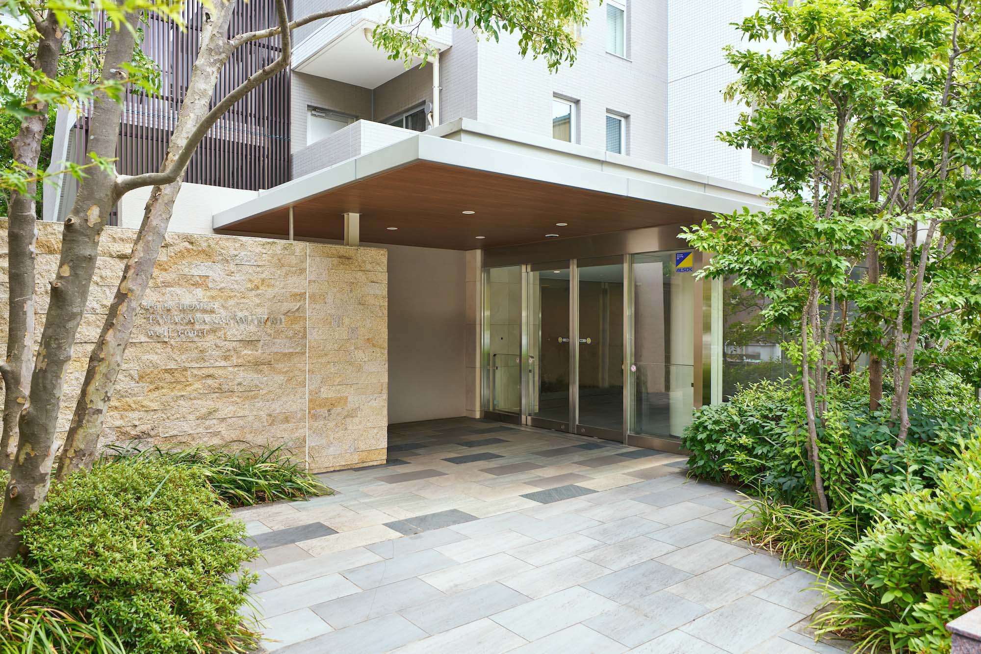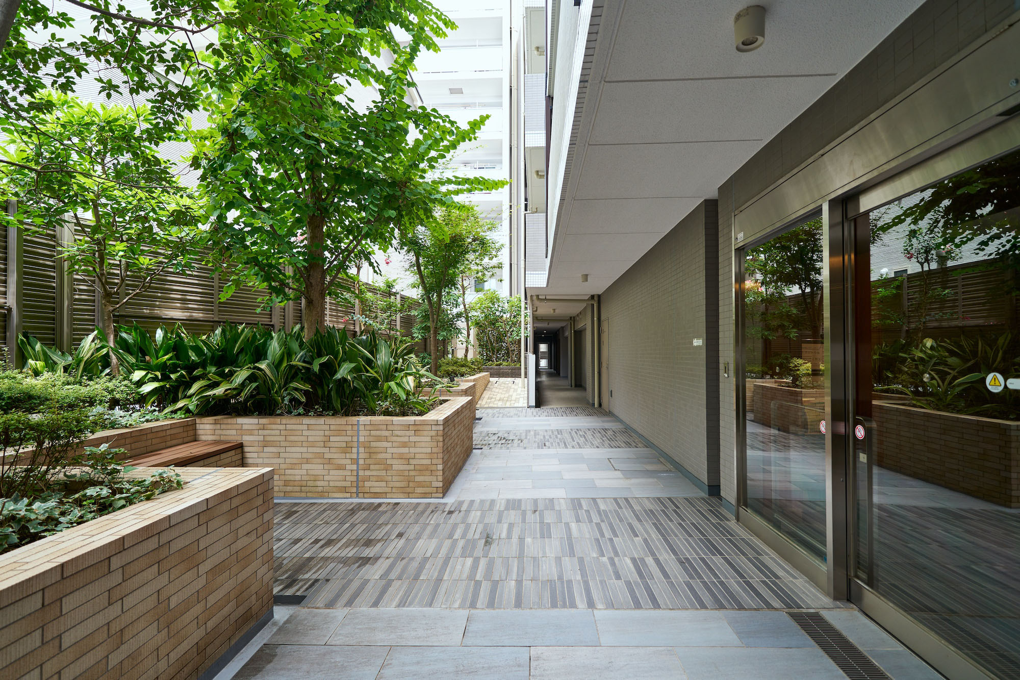 シンボルツリーを配し、緑に彩られたアプローチは、緩やかに雁行するさせることで空間に奥行きを与えるとともに、住まう方のプライバシーにも配慮。正面には、デザインウォールが設けられ、訪れる方を優しく出迎えます。建物の入口にはクリスタルのようにきらりと輝くガラスのエントランス。味わいのあるタイル貼りの床や壁が、趣のあるコントラストを創出し、シンプルでモダンな庇が住まう人や訪れる人達を優しくおおい、エントランスホール「クリスタルフロント」へと誘います。さらに歩みを進めれば、ガラス越しに広がるのは、プロムナード「ブリーズアレイ」の景色。爽やかな風と心地よい緑で彩られた中庭的な屋外空間にベンチが設えられ、住まう方々の憩いのスペースとなってコミュニケーションを育んでいます。