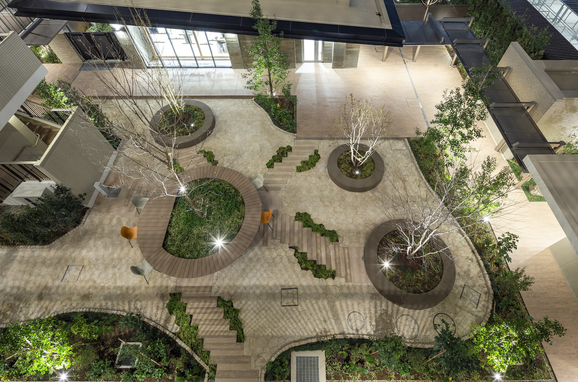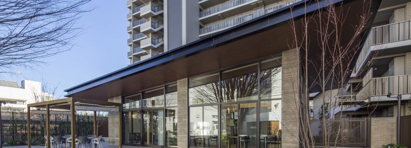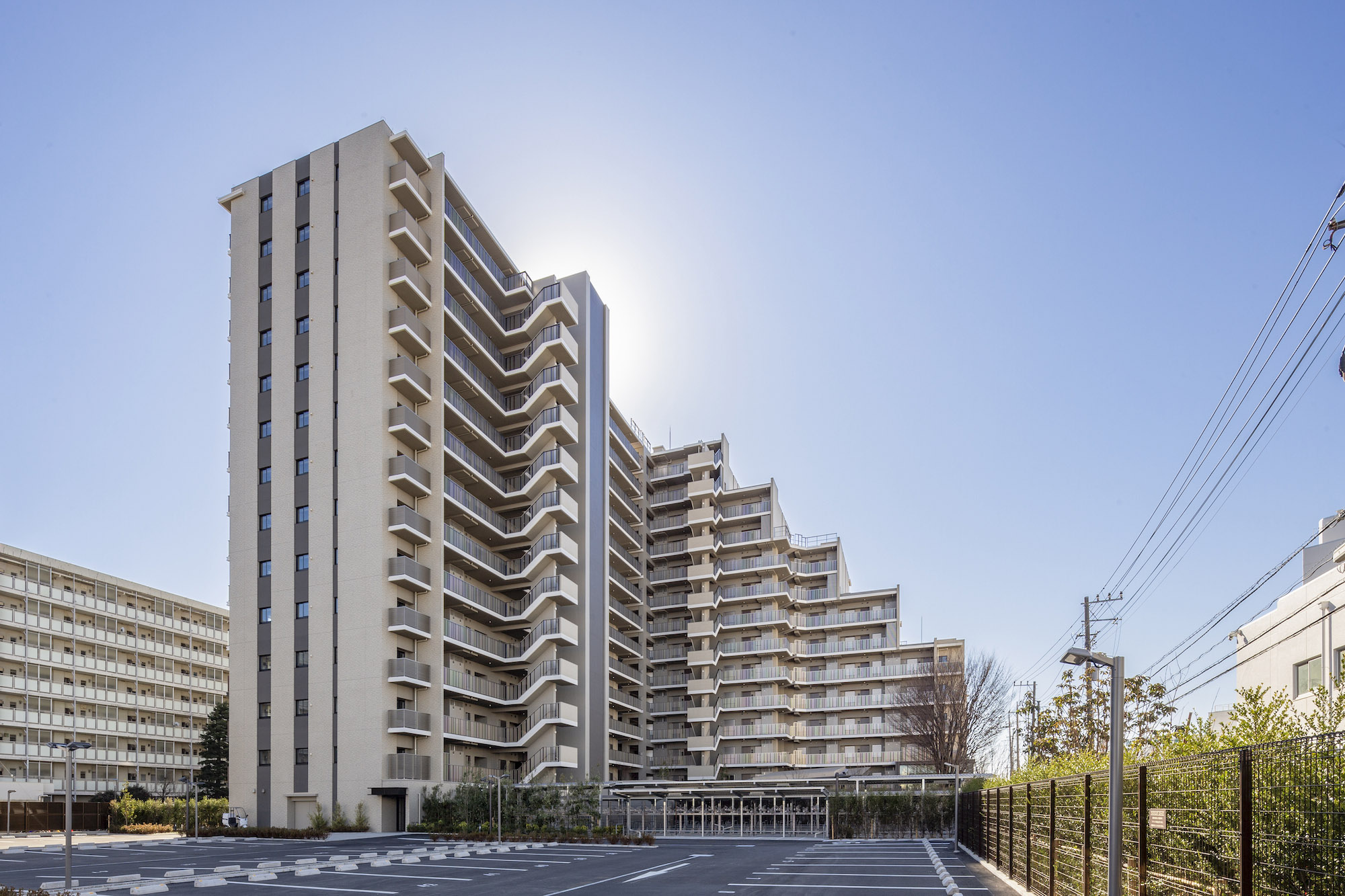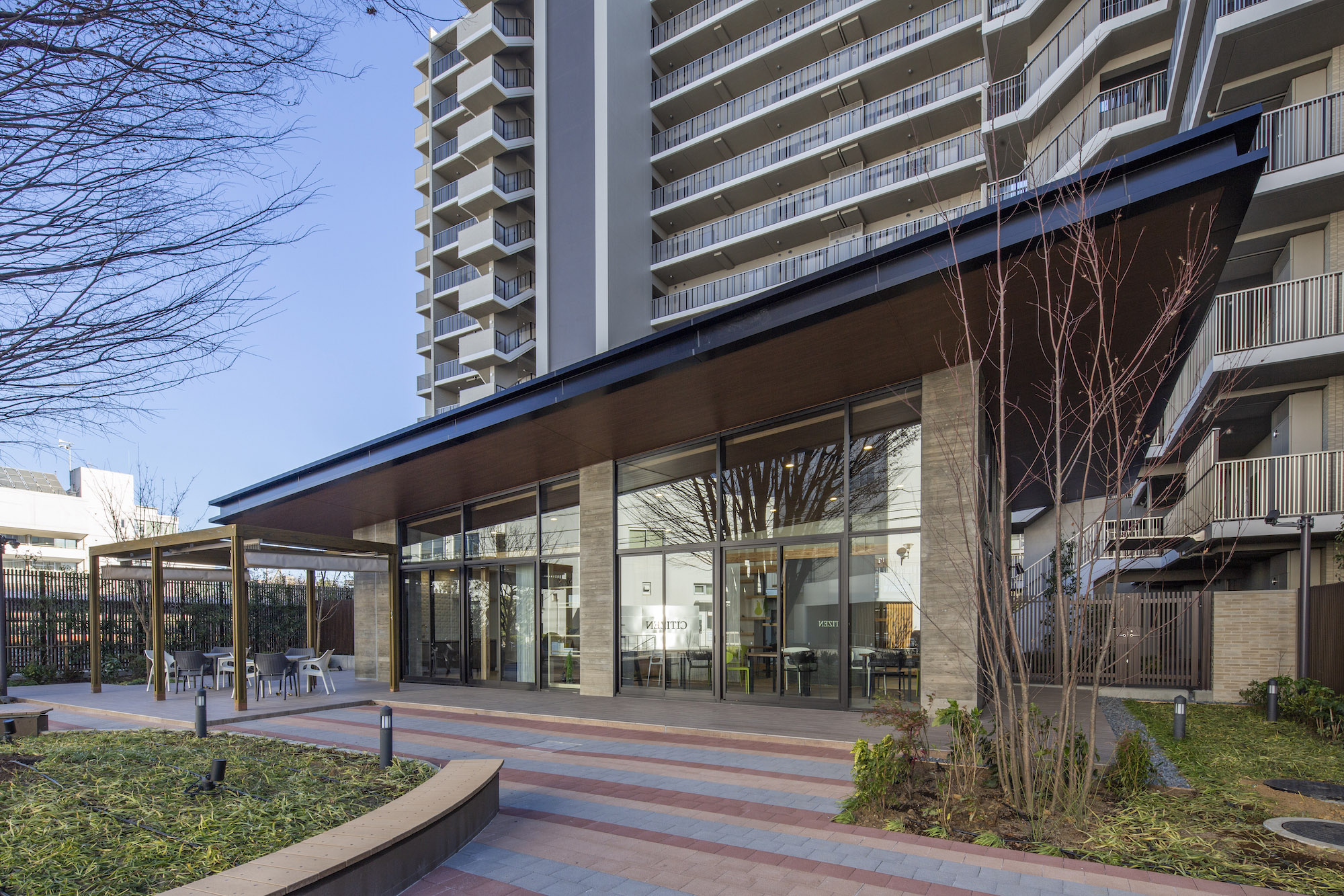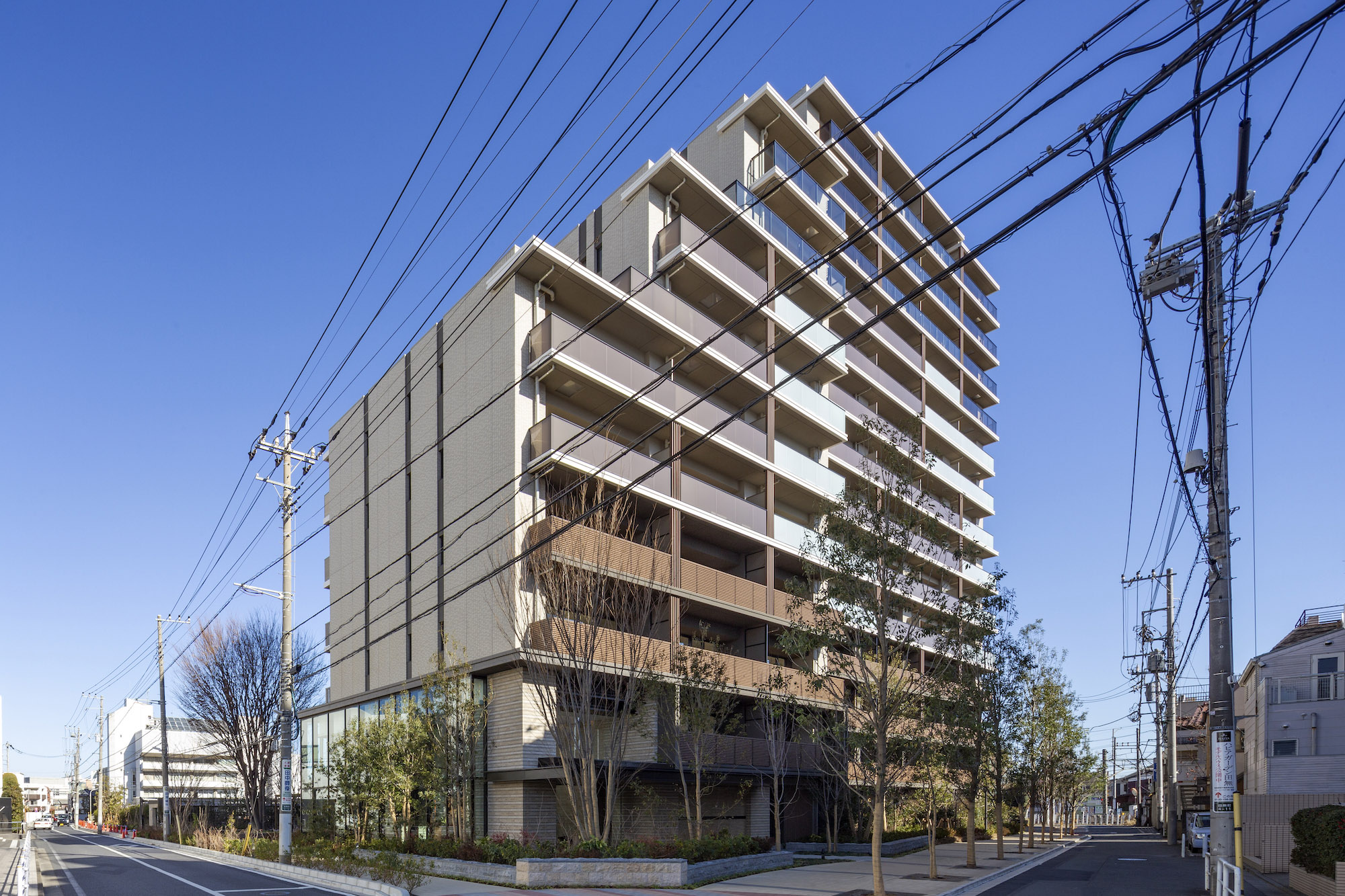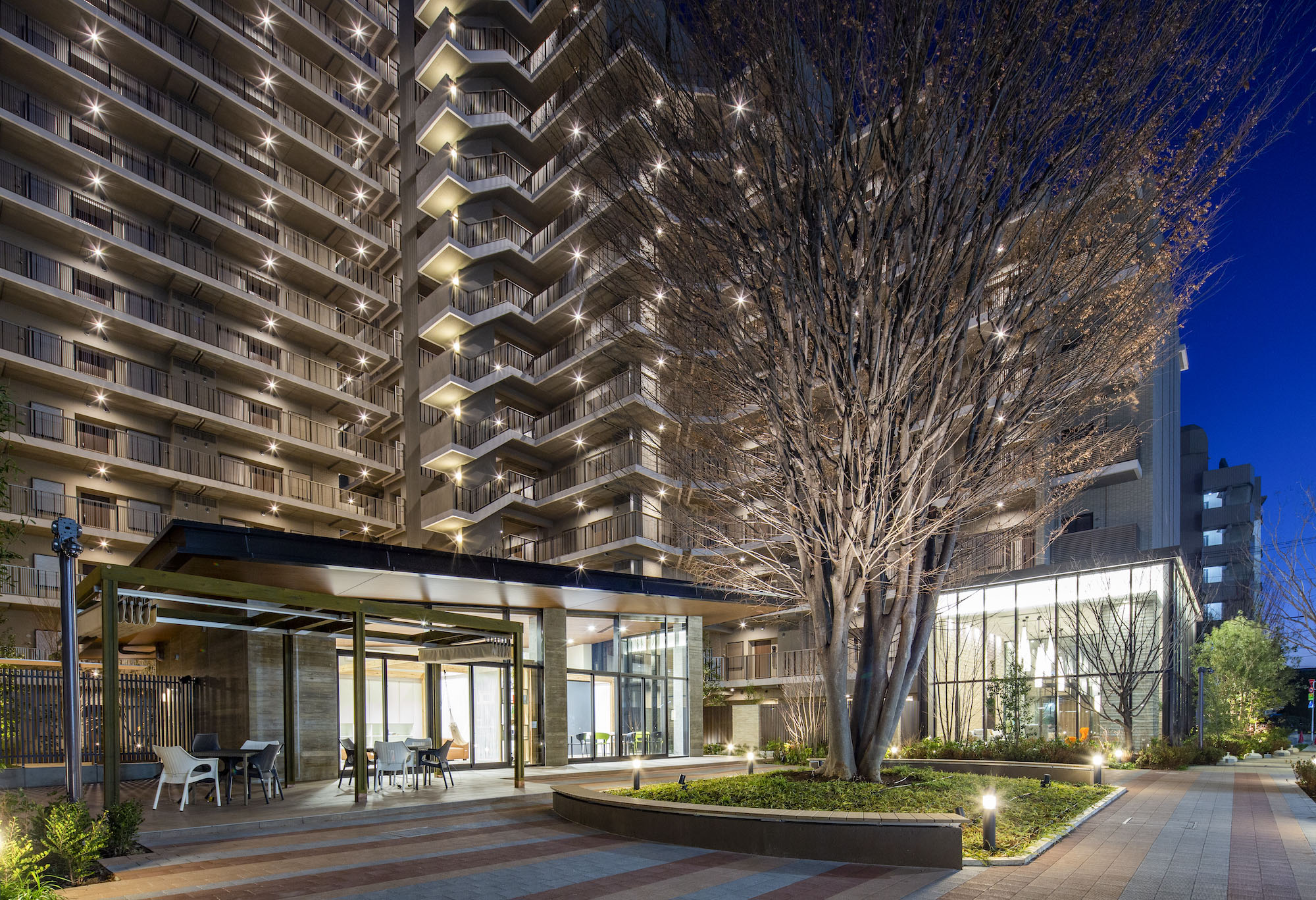 家族、街、緑、そして3棟の建物。そのすべてが「寄り添う」ことをデザインコンセプトとした外観意匠。地上14階建てのスケールに、有機的なリズムで構成されたガラス手摺や木調ルーバー、温かみのある素材が組み合わされ、この街の中でひときわ存在感を放っています。
