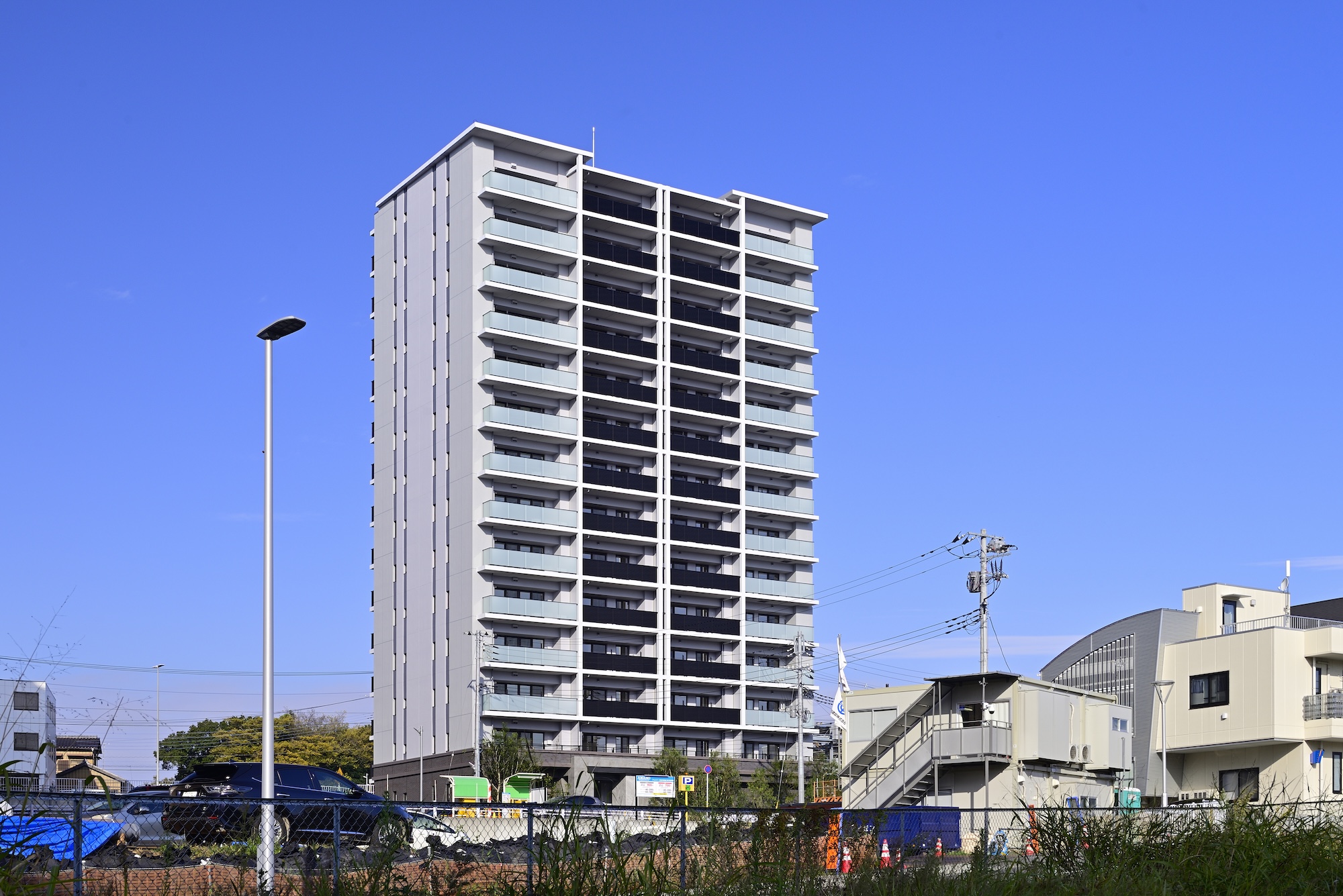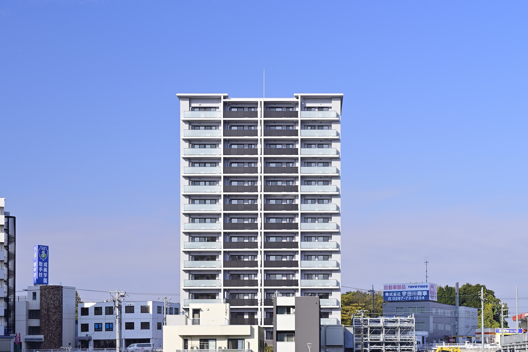 建物の正面であるファサードは、垂直と水平のラインを白で強調したシンメトリックなデザインにより、端正さと品位を創出。バルコニーには乳白のガラス手摺とアルミルーバー手摺を組み合わせ、表情に変化を生みだしています。最頂部のスカイラインはウイングを広げたような特徴的なデザイン。基壇部にあたる2階部分は重厚感のある素材で仕上げ、建物にグレード感を与えています。