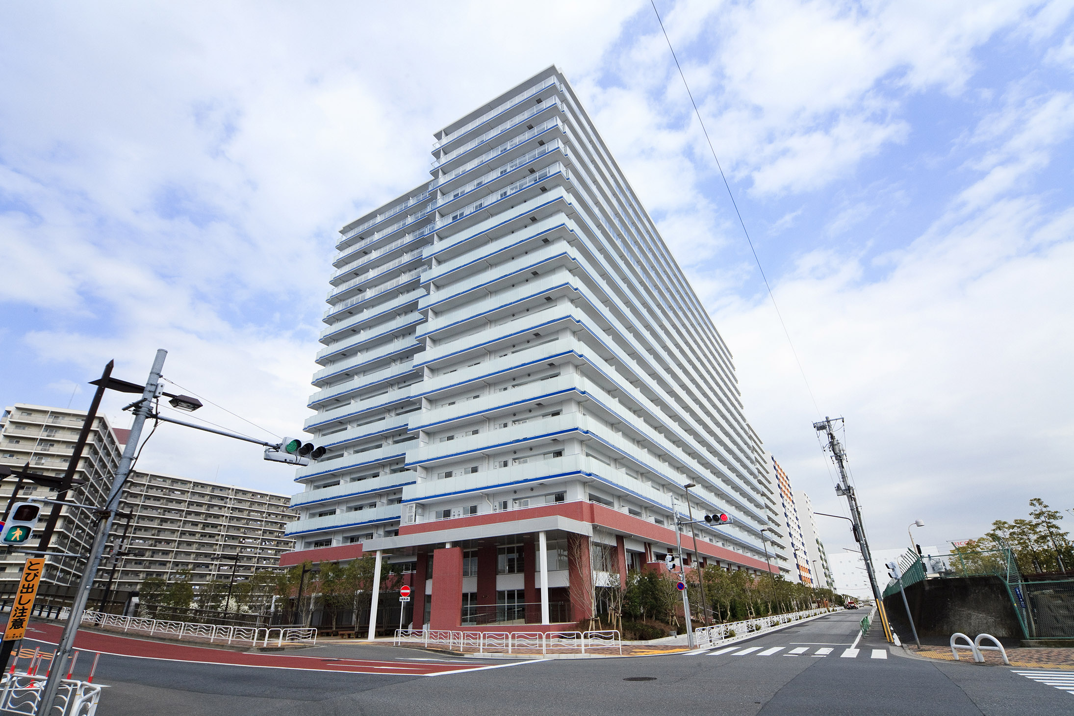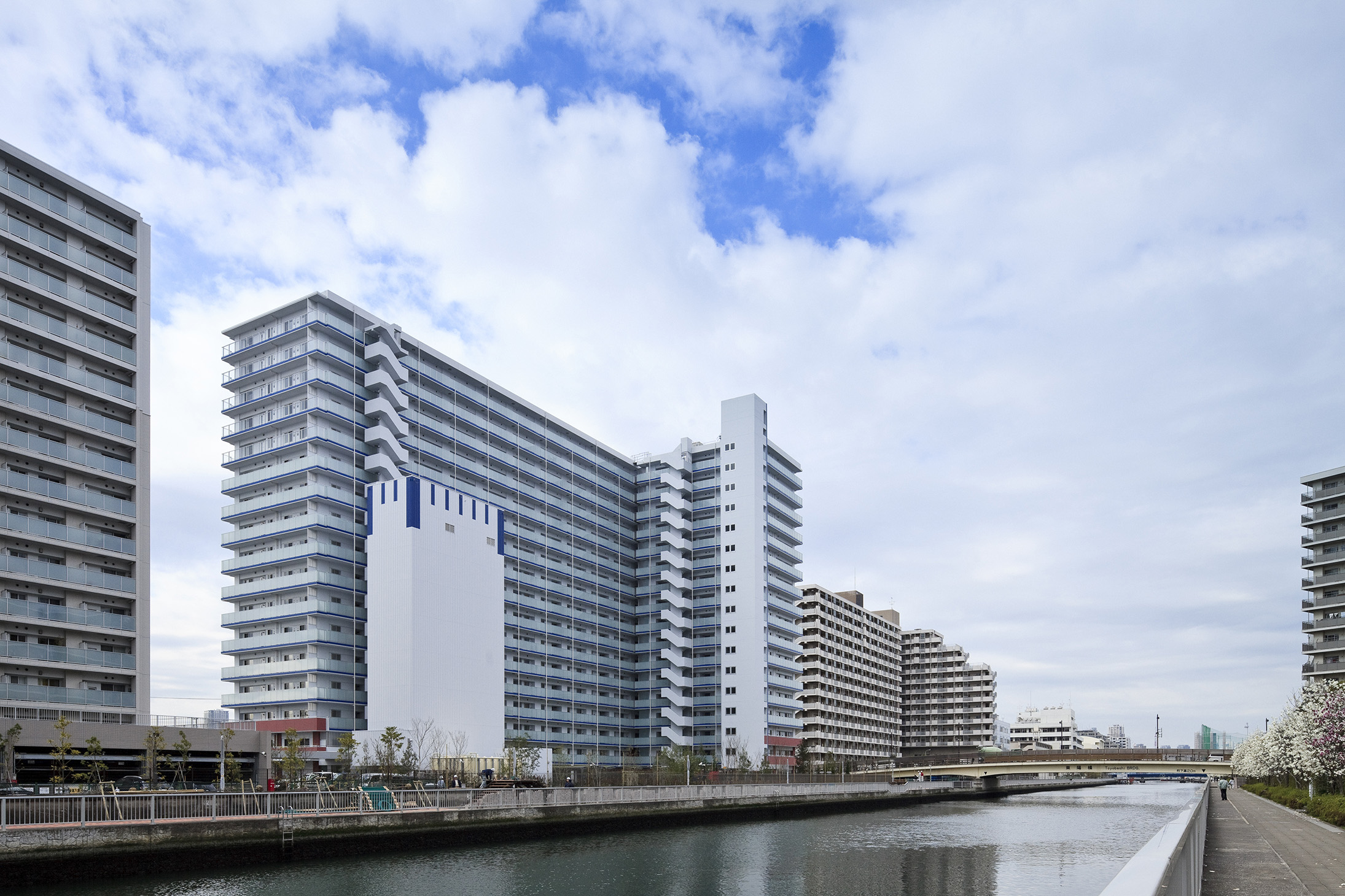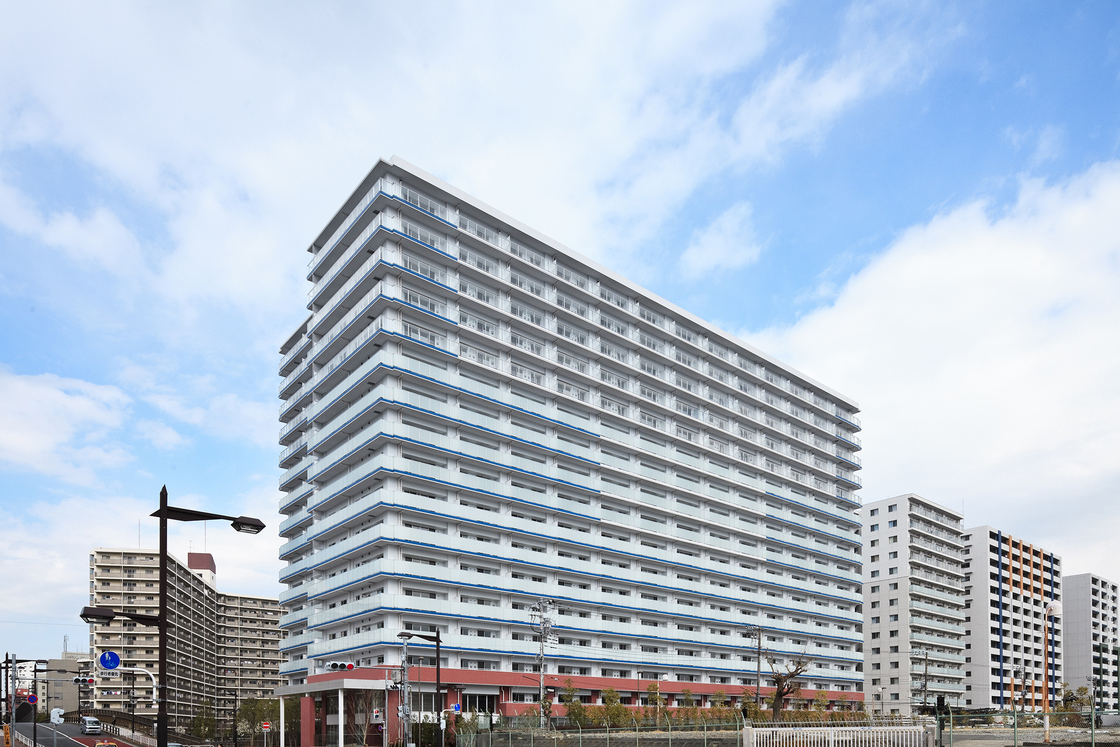 水のほとり、空のふもとという立地から導かれた、白いフォルムに際立つブルーのアクセントカラー。水平ラインを強調するとともに、軽快な印象を創出しています。南面は波の形をモチーフにし、バルコニーにはガラス手摺りを使用。南面、東面、西面、そして北面の一部にもガラスを用いて、たたずまい全体に透明感を演出しています。南面の上層階には透明度の高いガラスを使用し、中層階は半透明、低層階は透明度を抑えたガラスでプライバシーにも配慮。ガラス手摺りは居住空間にも大きな開放感と豊かな採光をかなえてくれます。一方、基壇部には、ウォーターフロントの港にある赤煉瓦の建物をイメージした赤茶系のタイルを使用。足もとの緑と調和しながら、アイレベルに重厚感や安定感を演出しています。