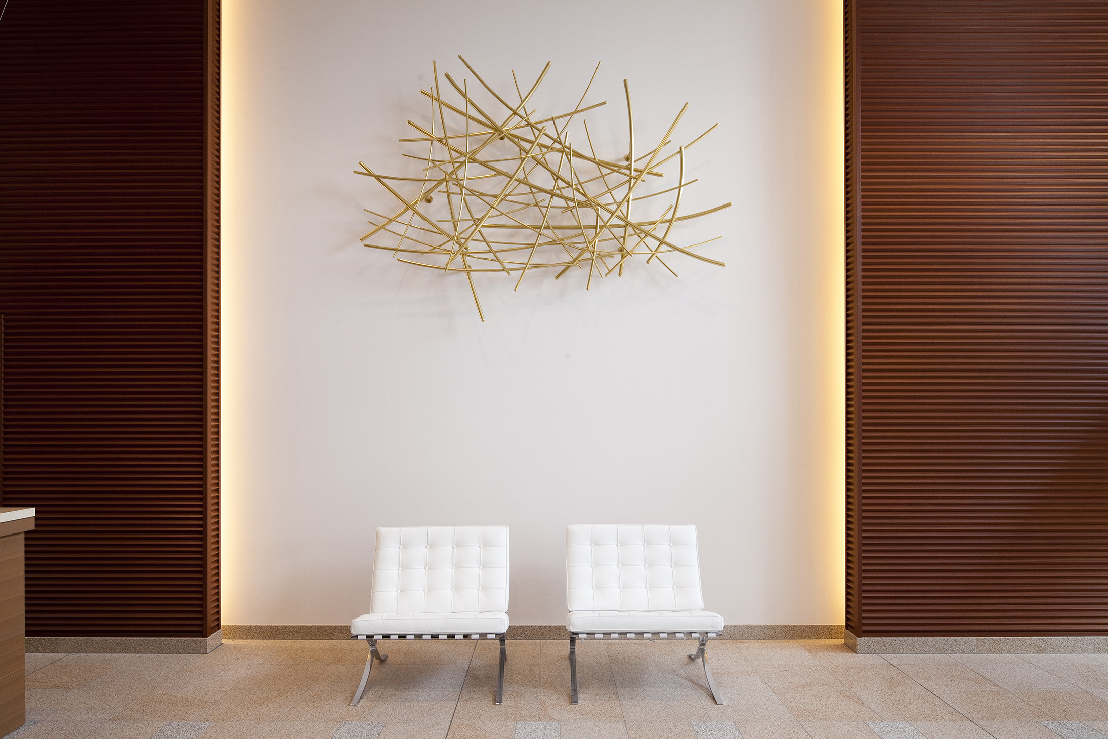 正面に飾られたアートは、工芸家・関根正文氏の作品。椅子は、近代建築の20世紀3大巨匠のひとりと呼ばれるミース・ファン・デル・ ローエのバルセロナチェアです。