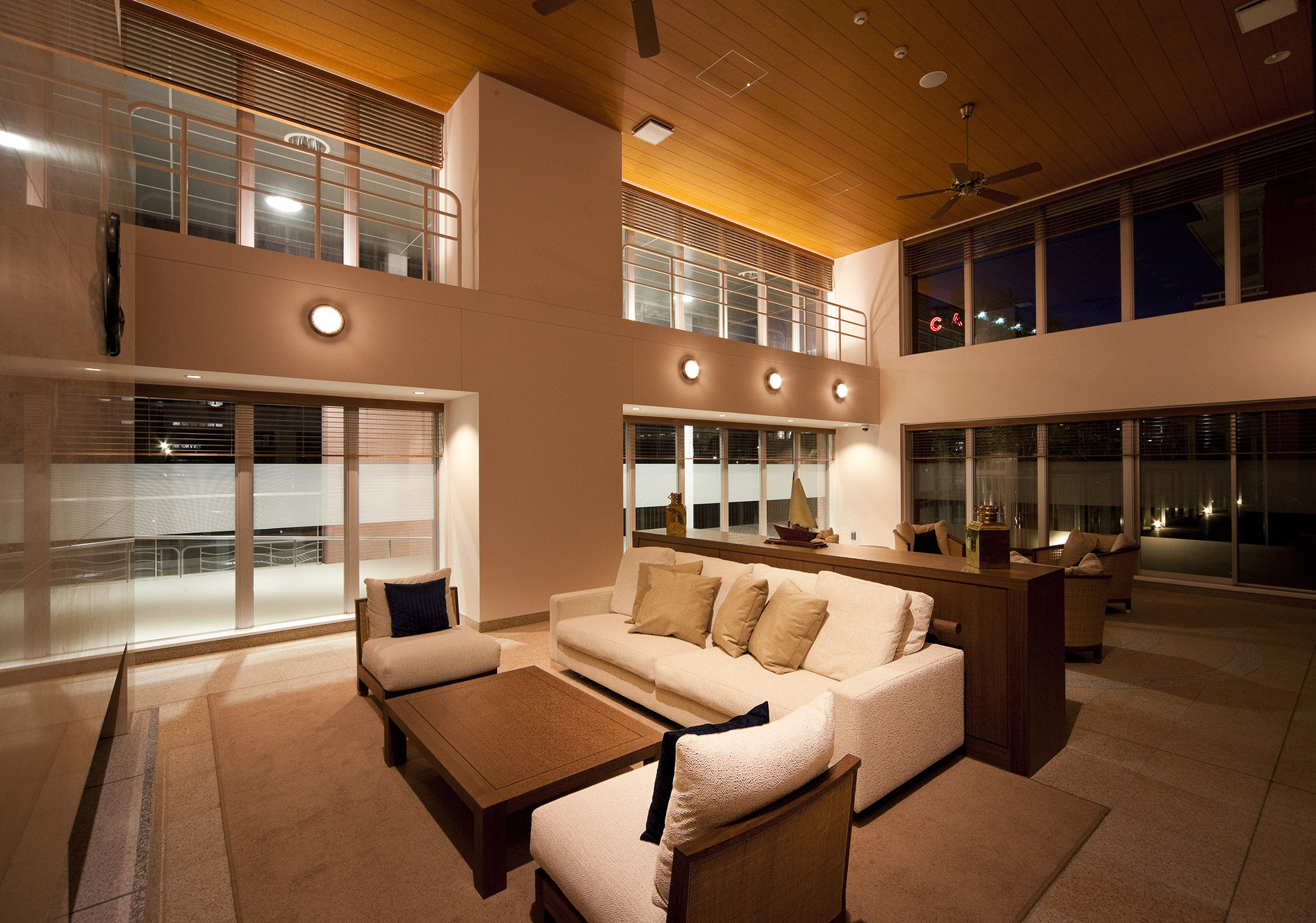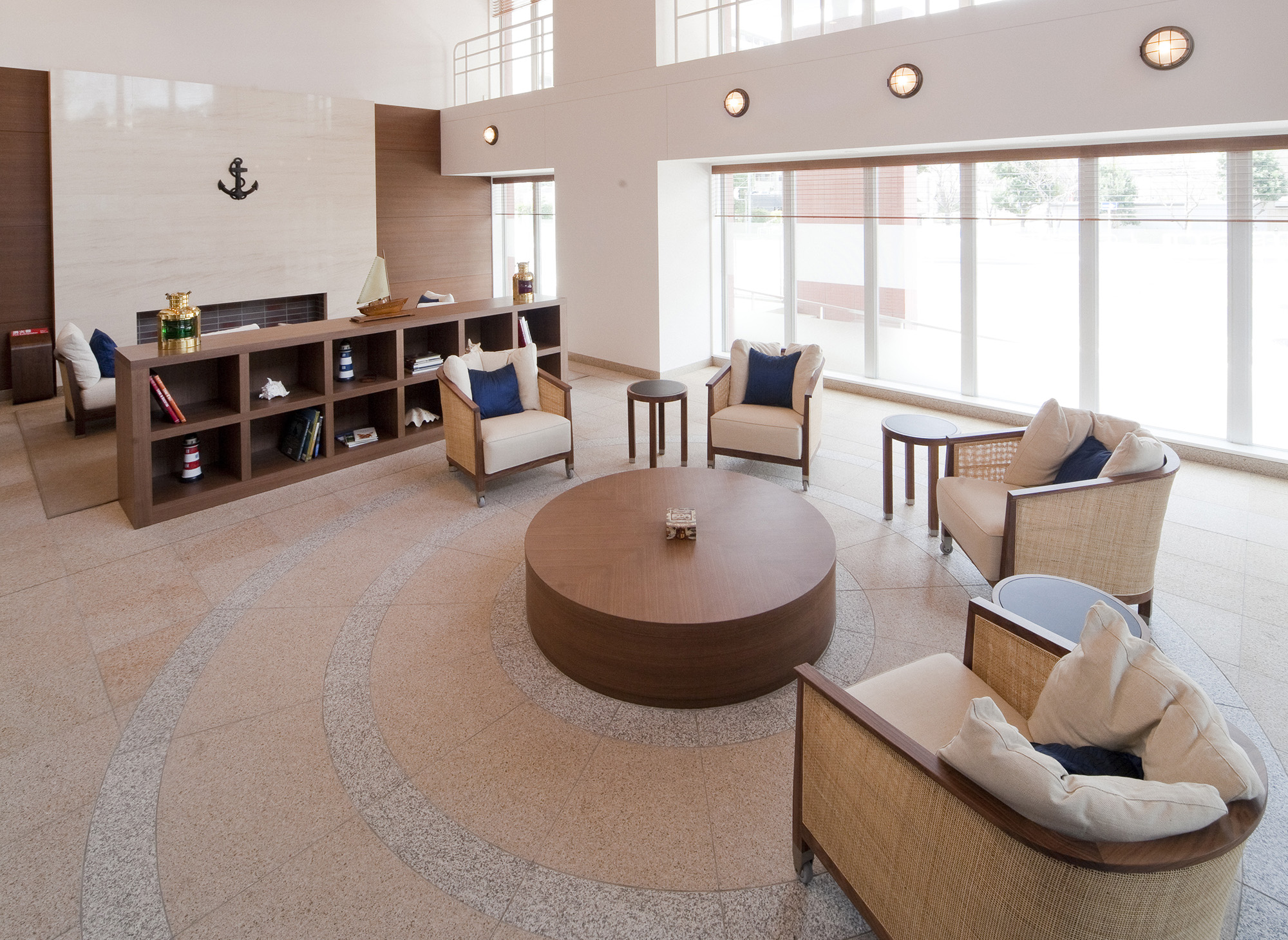 高いキャノピーと2層分の窓が、大きなスケールで住まう方を誇らかに迎えるメインエントランス。扉の先に待つのは、2層吹抜けの開放感あふれるエントランスホールとラウンジ。ウォーターフロントのイメージから、船室をモチーフにデザインしたラウンジは、こだわりのインテリアやディテールが施され、上質なくつろぎの空間となっています。集会室やキッズルームとして多目的に使えるコミュニティルームは、キッチンを併設しており、デッキからは爽やかな香りが漂うハーブの広場が見渡せます。運河に寄り添うキャナルガーデンは、樹々を渡る風も、運河への爽快な見晴らしも、住まう方だけが堪能できるプライベート空間です。