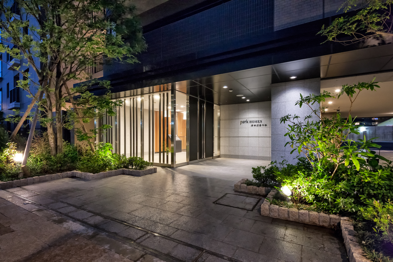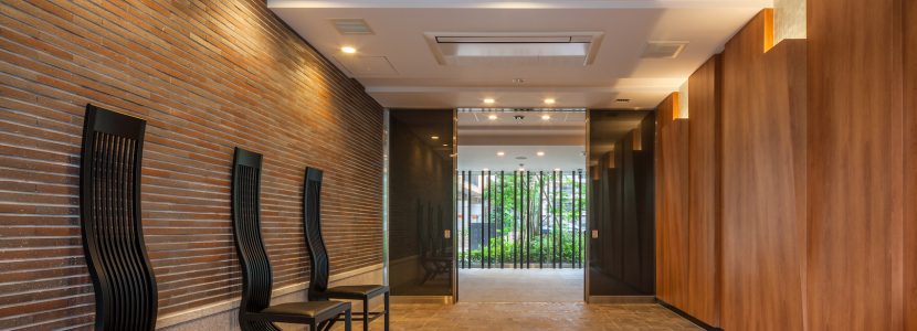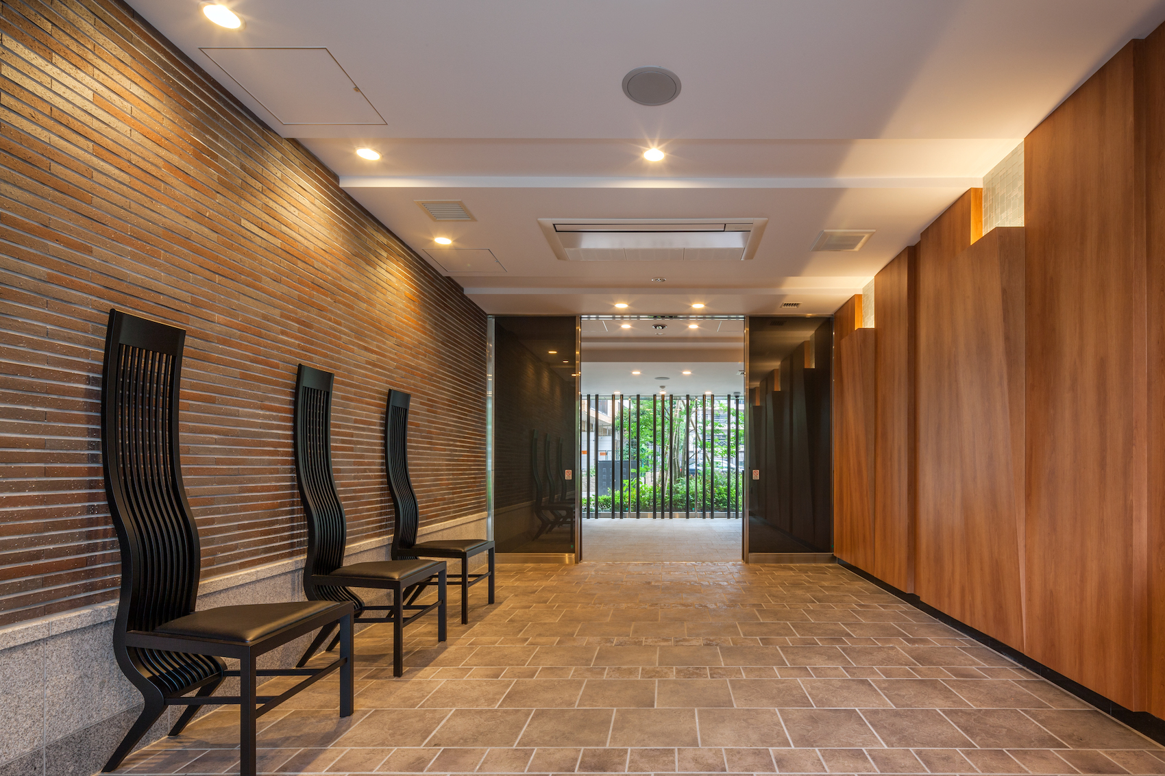 邸宅の誇りを表出しながらも、一歩奥まってもてなしを尽くすエントランス。質感が異なる木調と石肌調タイルの壁を対峙させ、コントラストの中にナチュラルな心地よさを描いたエントランスホール。巧みな意匠が奏でる上質な雰囲気は、その奥に広がる中庭の景をもっていっそう洗練されます。穏やかな四季の流れを感じながら安らぎを刻む、落ち着いた私邸に相応しい迎賓空間です。