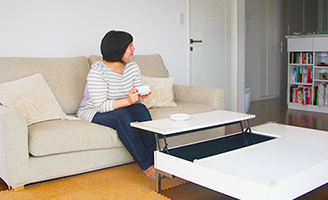 天板の一部がリフトアップし、お茶を飲んだり読み物を置いたりするのに便利なローテーブルは、奥様のお気に入り。