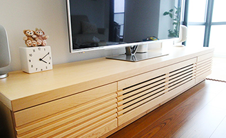 メイプル材のローボードは、ご主人がこだわってオーダーしたもの。他の家具に合わせて明るい色調のものを選んだ。