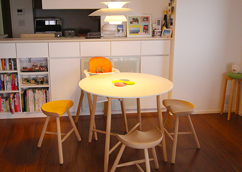 リビングダイニングのインテリアは、主にご主人が担当。お子様目線の低い位置でくつろげるシンプルなローテーブルとソファ、可愛らしいダイニングセットなど、部屋全体にご主人の思い入れとセンスの良さが溢れている。中でもダイニングテーブルを優しく照らすオシャレなペンダントライトは「新居に引っ越したら、まず入れたかった」と語る、お気に入りの品。セミオーダーのソファ表皮やテレビ用ローボードにもこだわりが感じられた。