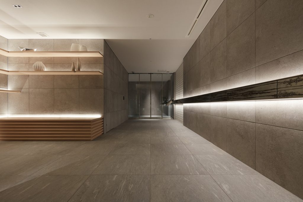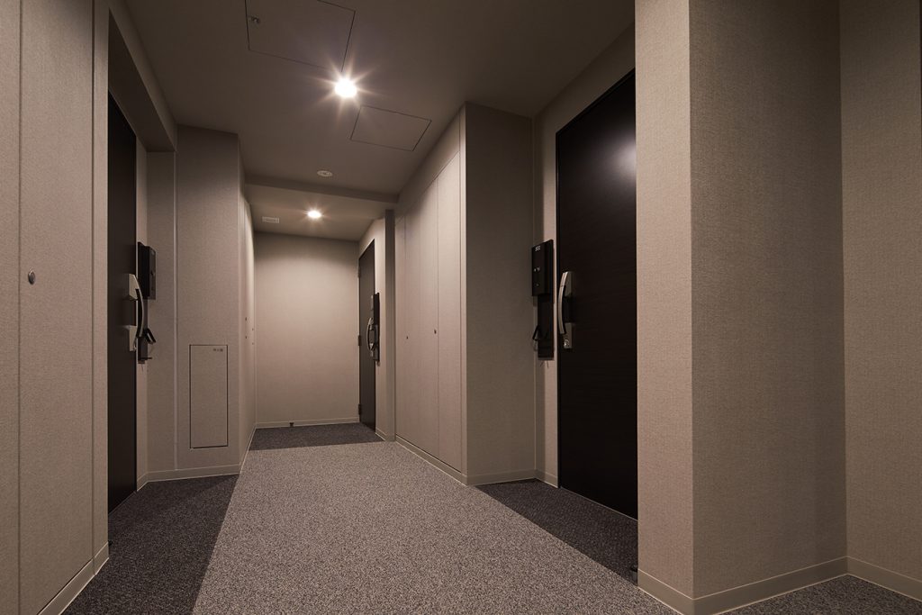 共用スペース 穏やかな照明と鮮やかなマテリアルを 織り重ねたエントランスホール。 エントランス エントランスホール エントランスホール 内廊下 都心に穏やかな自分だけの寛ぎ時間を。その想いをカタチにした、外からの視線を遮蔽し、住まう方だけの空間を創出する内廊下設計。高いプライベート性とつつみこまれる安心感を実現しています。