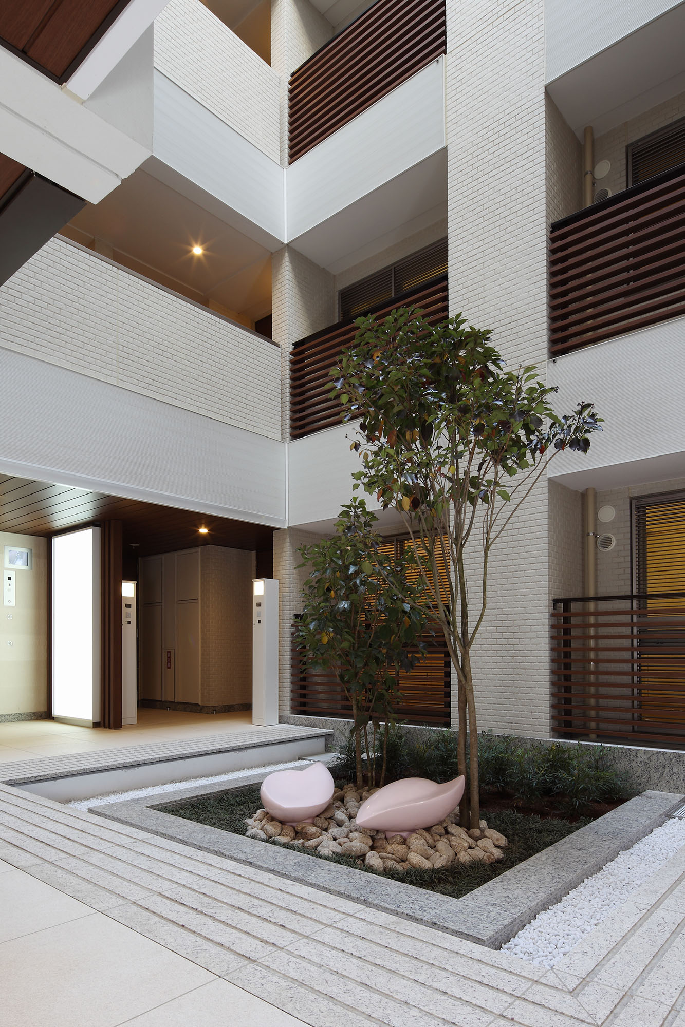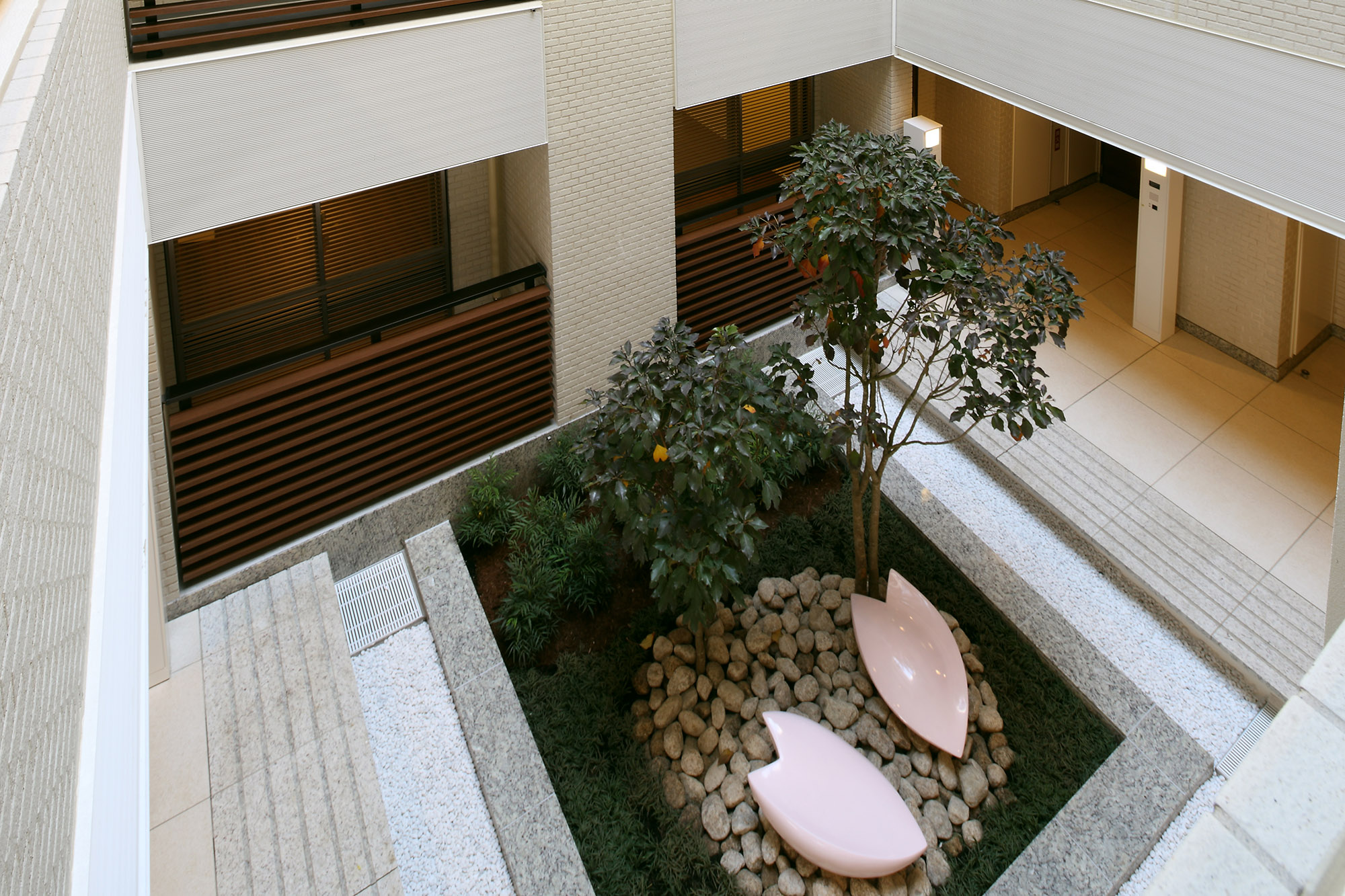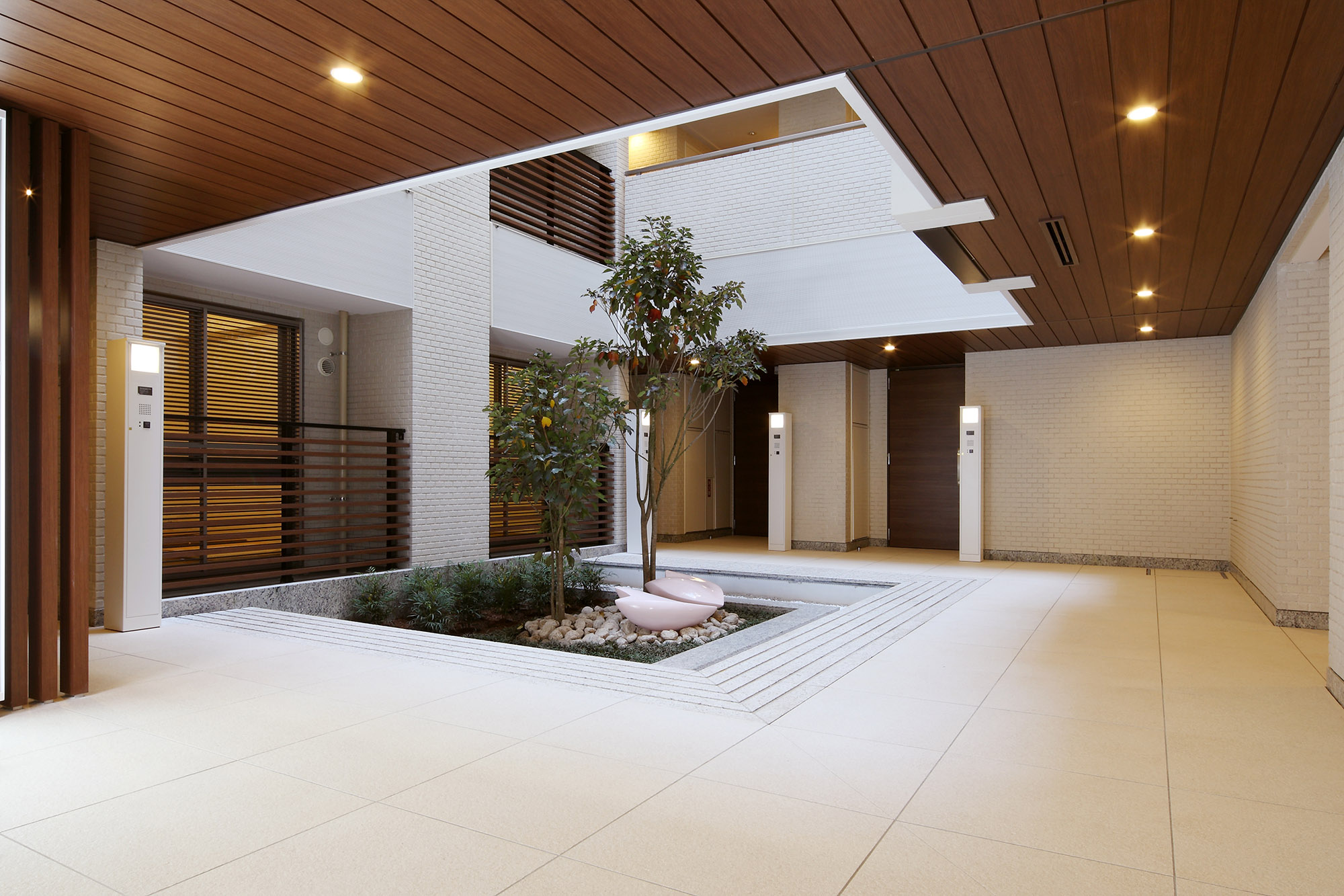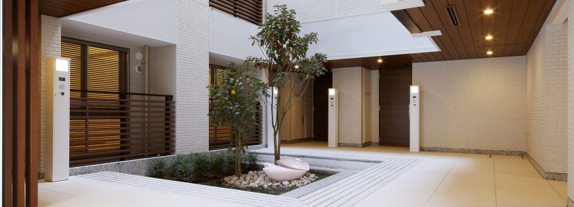 建物の中心は吹き抜けとなっており、それを取り巻くように住戸が配され、プライバシーにも配慮された回廊型設計です。吹き抜けの1階部分は静謐な中庭「ライトコート」。中央に配したカクレミノやオブジェが、ライトアップとともに幻想的な雰囲気を演出します。優しい「風」をイメージしたエントランスホールは、風紋を表したアクセントウォールが設えられ、住戸までのアプローチに癒しの表情を添えています。