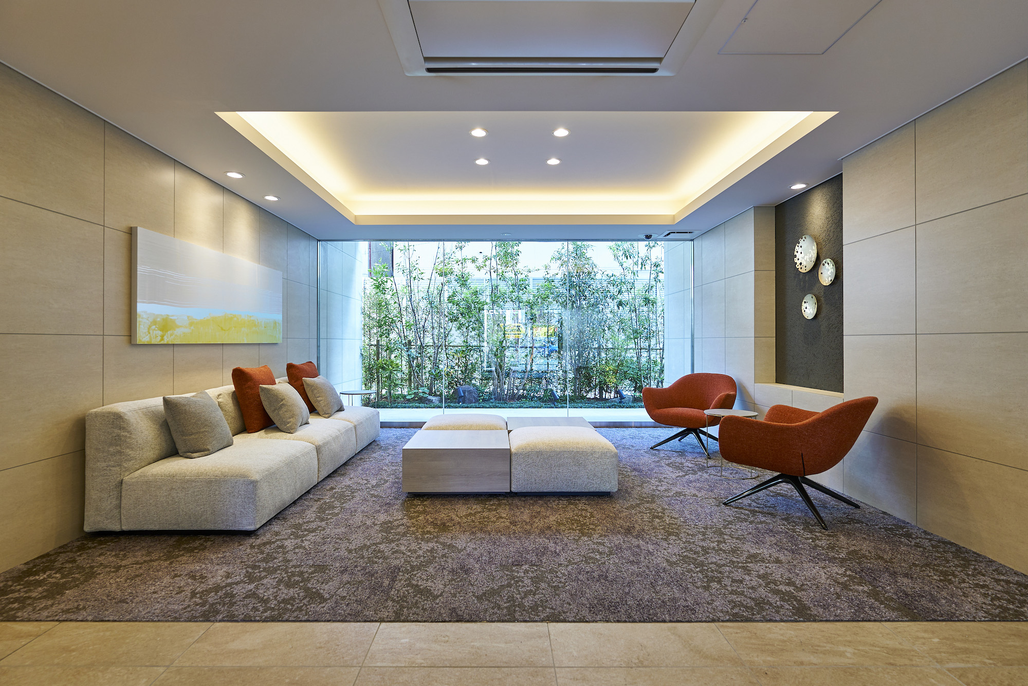 エントランスホールやラウンジには、北浦和公園内の近代美術館にインスピレーレーションを受けたアートが配されています。ラウンジは、温かみのある素材と落ち着きのあるインテリアで、住まう方同士で自然に会話が生まれ、コミュニティが育まれるゆとり空間をデザイン。正面の開口部から望む中庭の緑が癒しの雰囲気を醸し出し、もう一つのリビングとして寛げる空間を創出しています。