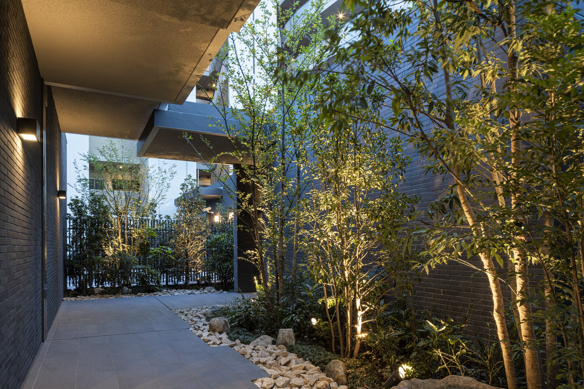 ガラス張りの共用棟「クリスタルゲートラウンジ」は、外光を建物内へと採り込み、植栽の豊かな緑を借景とする、優雅で洗練された空間です。エントランスから建物までのアプローチには、谷沢川や多摩川の流れをイメージした坪庭が配され、自然の潤いが入居者を優しく住まいへと導きます。シャッターゲート付き駐車場も設けられ、プライバシー性が確保されています。