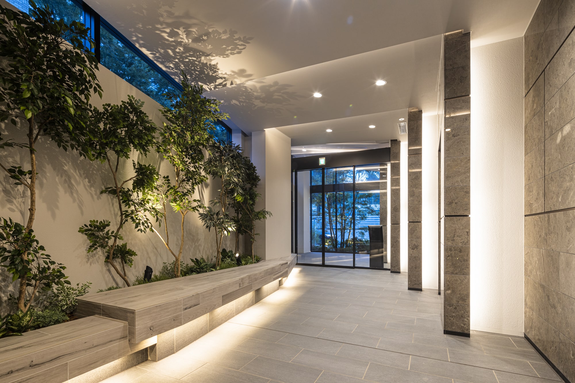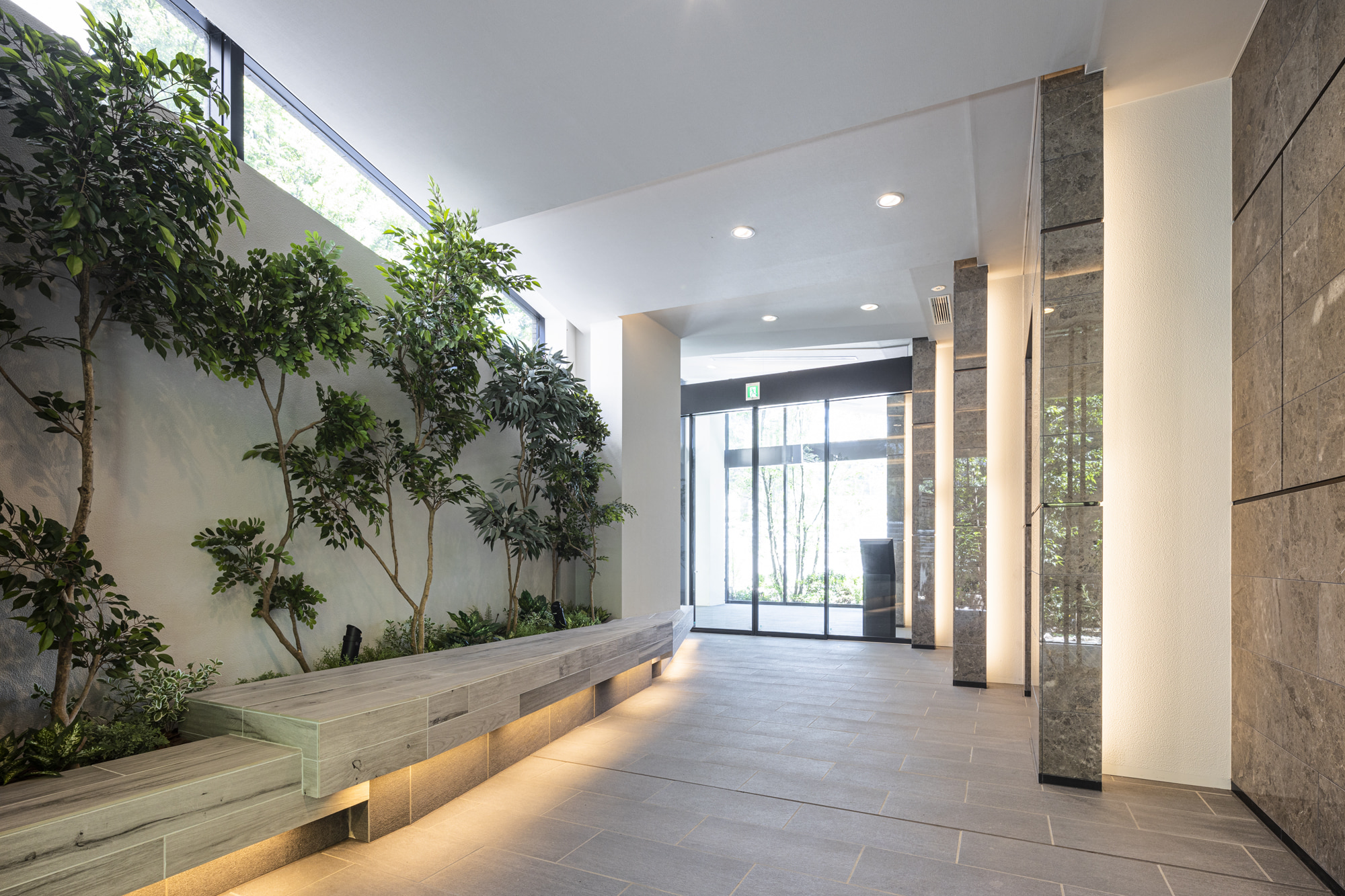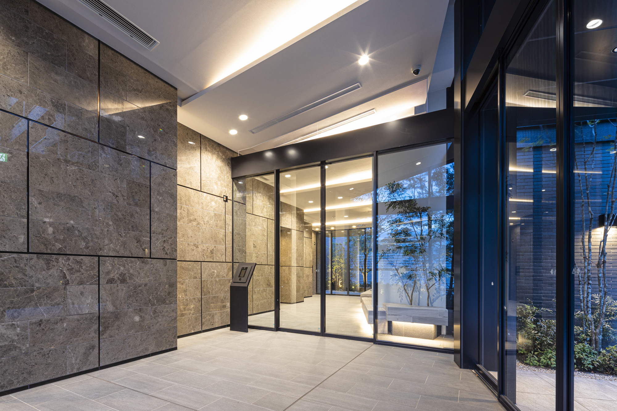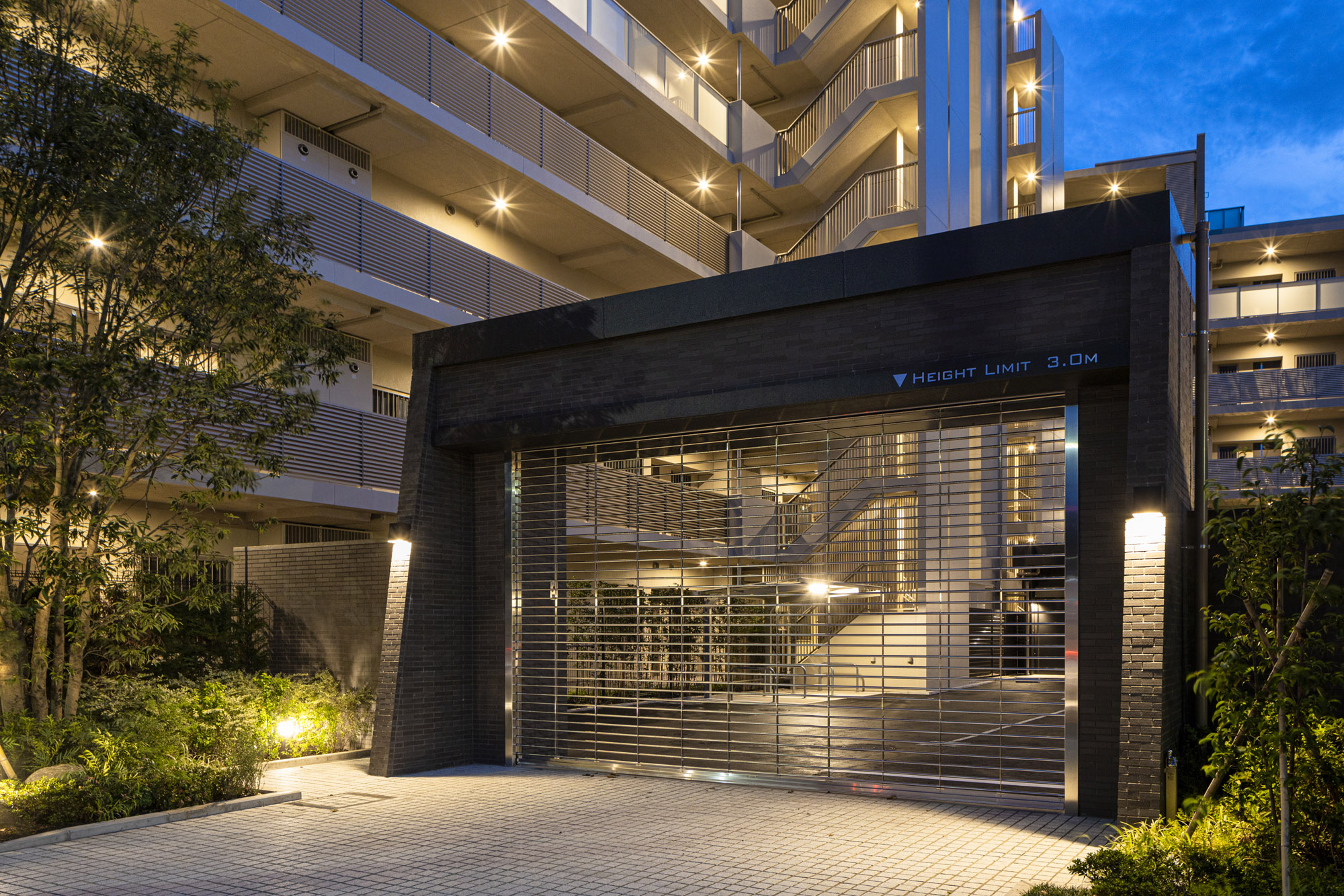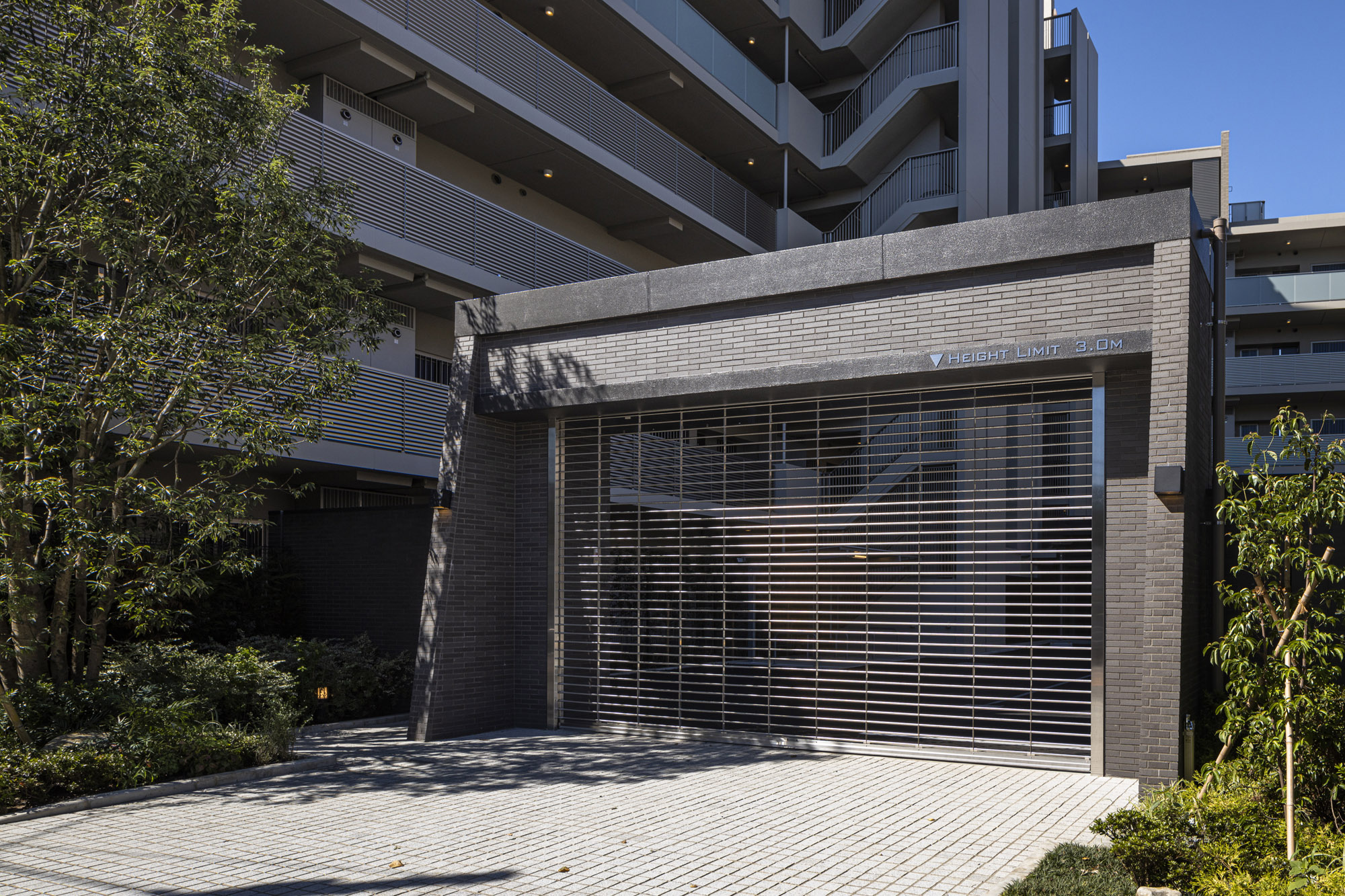 ガラス張りの共用棟「クリスタルゲートラウンジ」は、外光を建物内へと採り込み、植栽の豊かな緑を借景とする、優雅で洗練された空間です。エントランスから建物までのアプローチには、谷沢川や多摩川の流れをイメージした坪庭が配され、自然の潤いが入居者を優しく住まいへと導きます。シャッターゲート付き駐車場も設けられ、プライバシー性が確保されています。