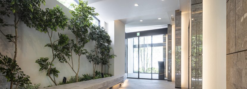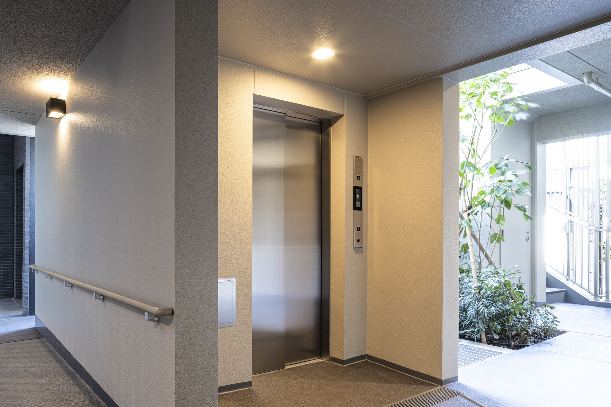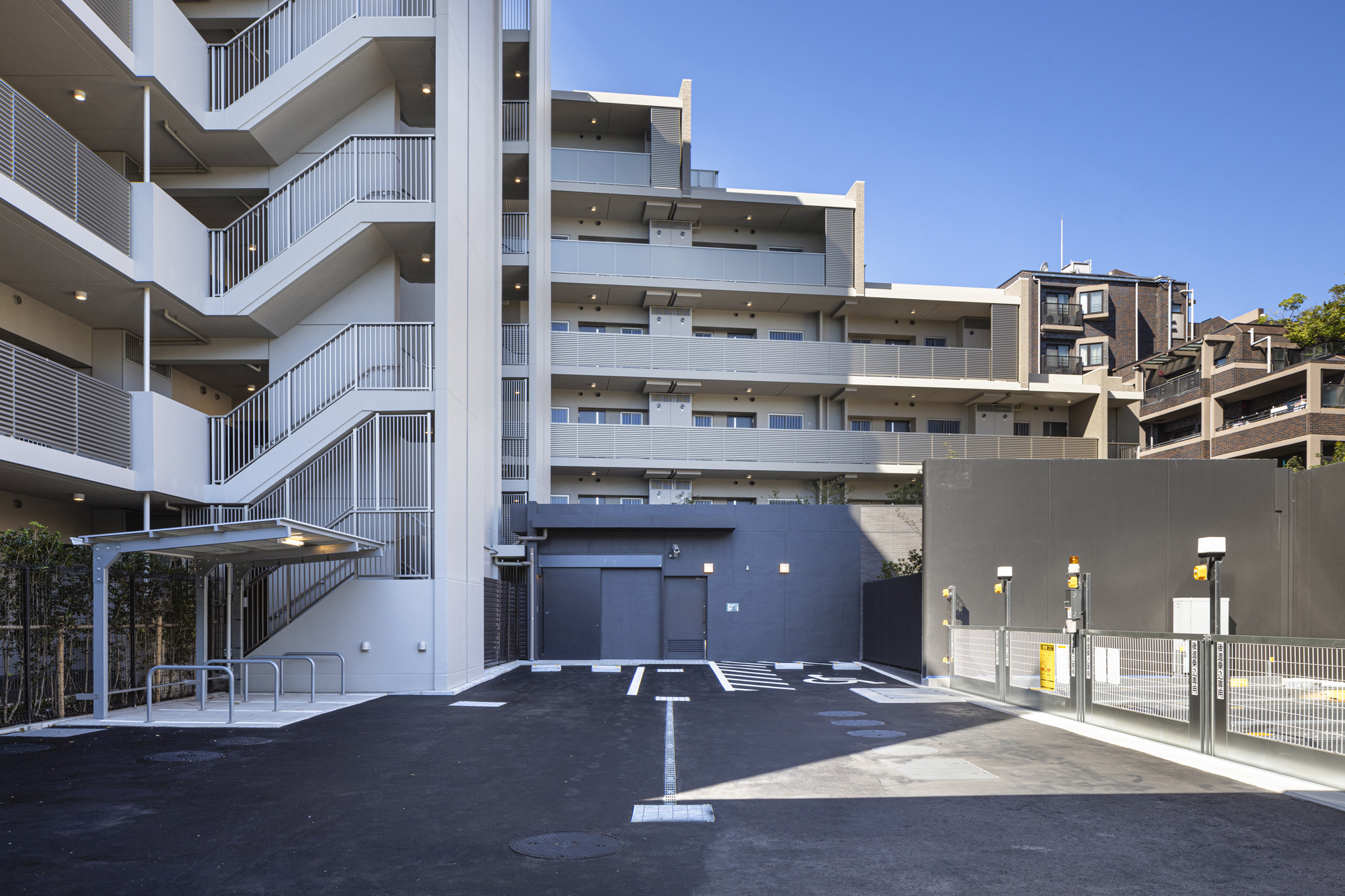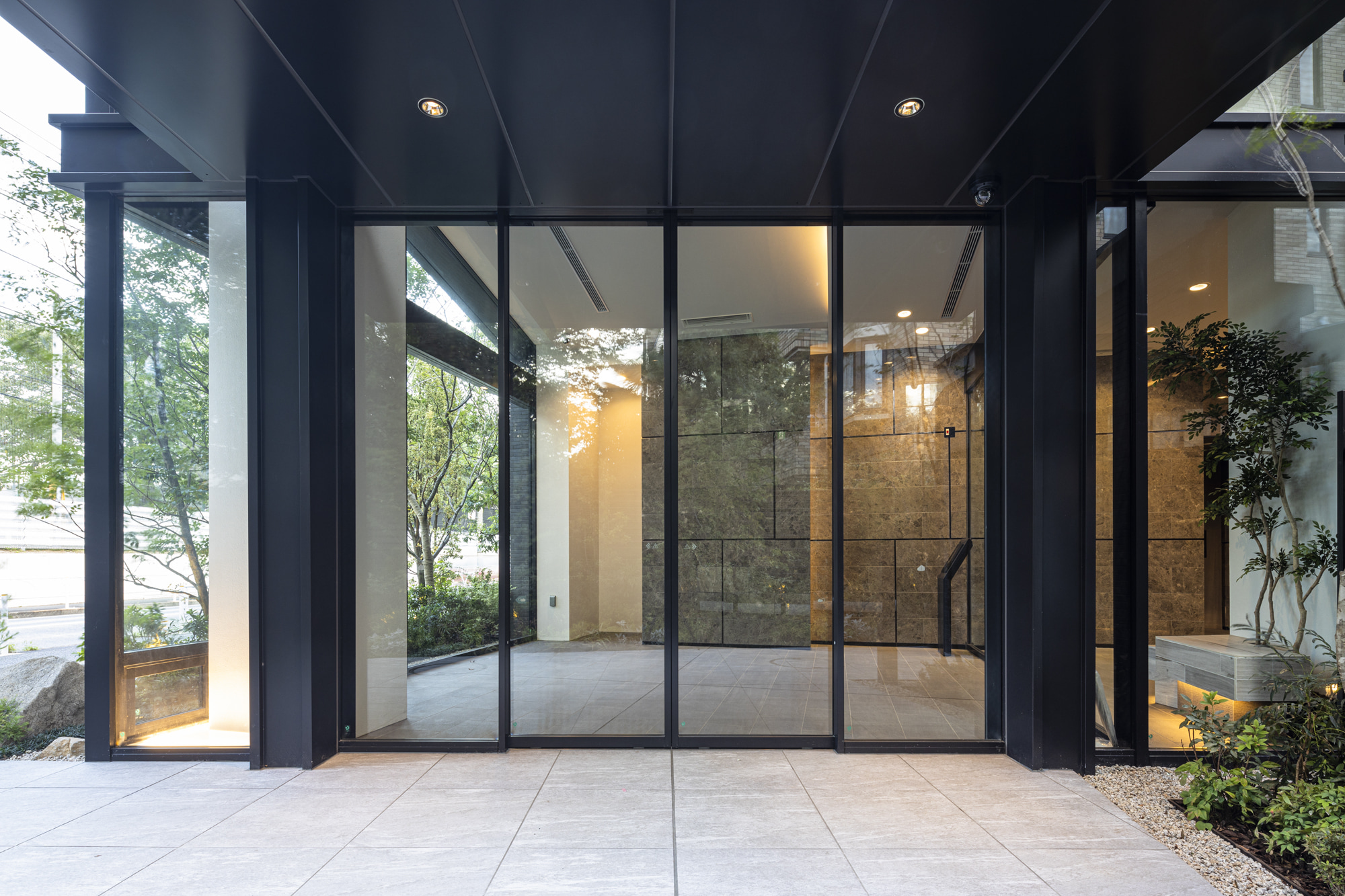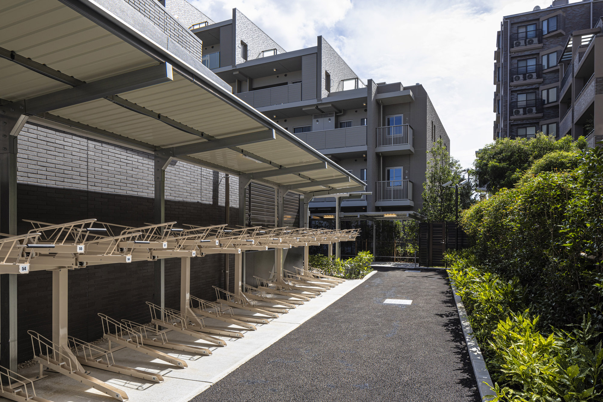 ガラス張りの共用棟「クリスタルゲートラウンジ」は、外光を建物内へと採り込み、植栽の豊かな緑を借景とする、優雅で洗練された空間です。エントランスから建物までのアプローチには、谷沢川や多摩川の流れをイメージした坪庭が配され、自然の潤いが入居者を優しく住まいへと導きます。シャッターゲート付き駐車場も設けられ、プライバシー性が確保されています。