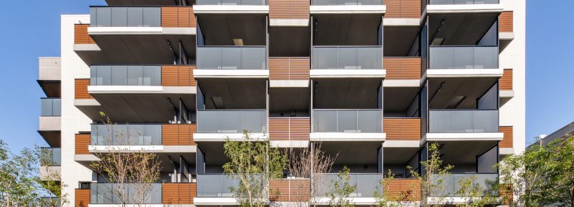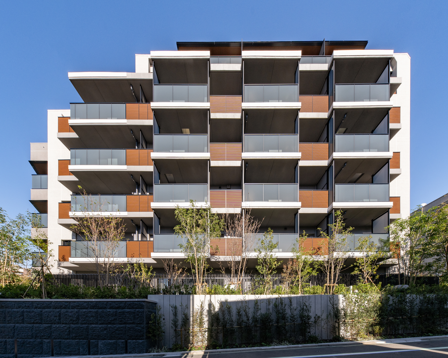 住まいの顔となる北西側は、2本のシンボルツリーを配し、質感のある三丁掛けタイルや石貼りの擁壁、ガラススクリーンと袖壁に囲まれたバルコニーによって象徴的なデザインを形成。一方、駅から見える南側は、最上階の木調の軒天井やガラス手摺りで、優しい表情が創り出されています。周囲の景観や街の歴史と調和しつつ、堂々と存在感のある佇まいです。
