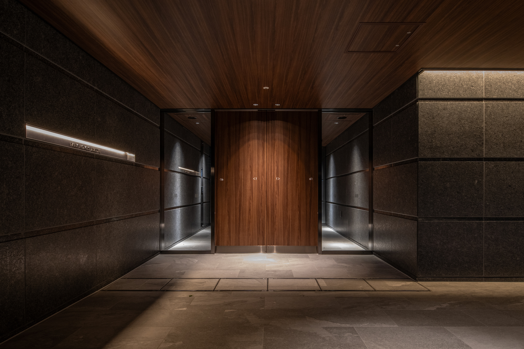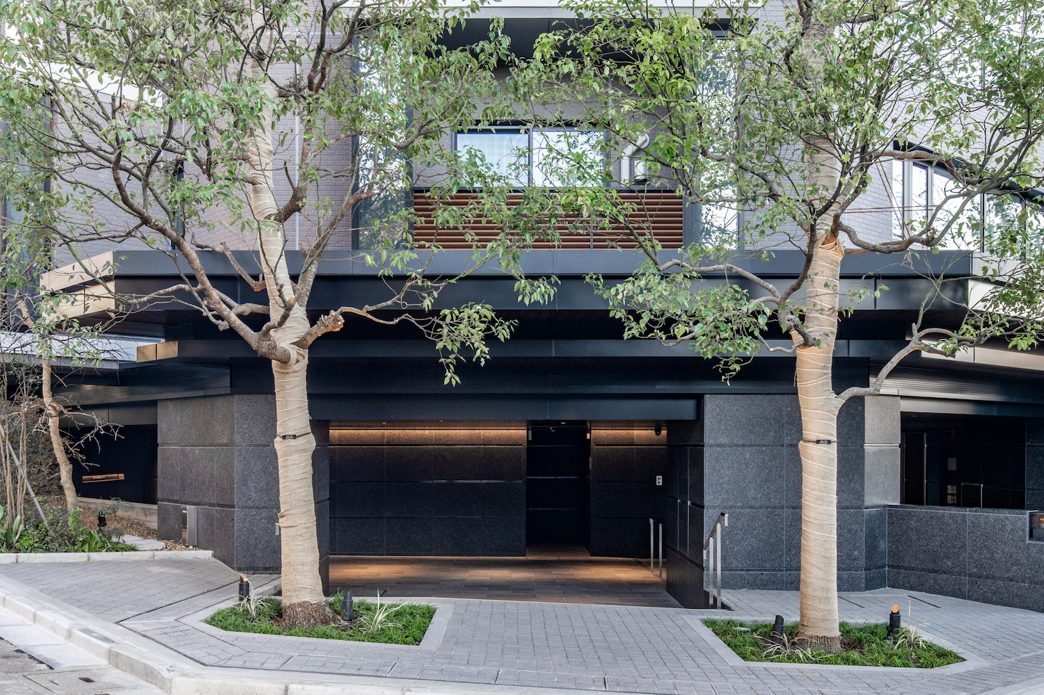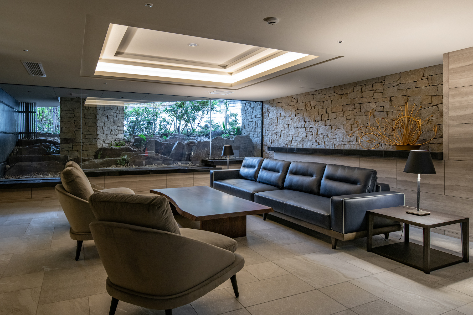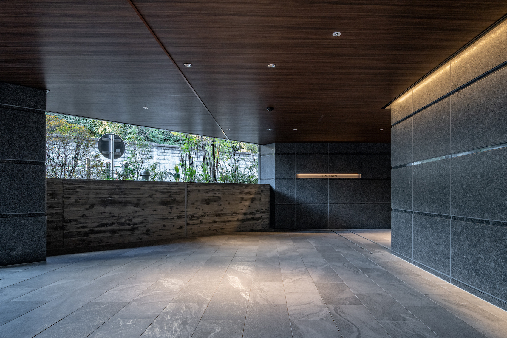 車路と一体になった間口の広いエントランスアプローチ。2本のシンボルツリーと擁壁上の植栽で、エントランスは緑に包まれた空間となっています。エントランスホールの脇に設けられているのは、自然石と植栽による前庭を臨むラウンジ。折り上げ天井や石貼りのデザインウォールなどこだわりの意匠が施され、大きくゆったり座れるソファも備えられた寛ぎの空間です。コワーキングスペースも用意されており、Wi-Fi環境はもちろん、1人用だけではなく、2人で利用できる個室も完備しています。