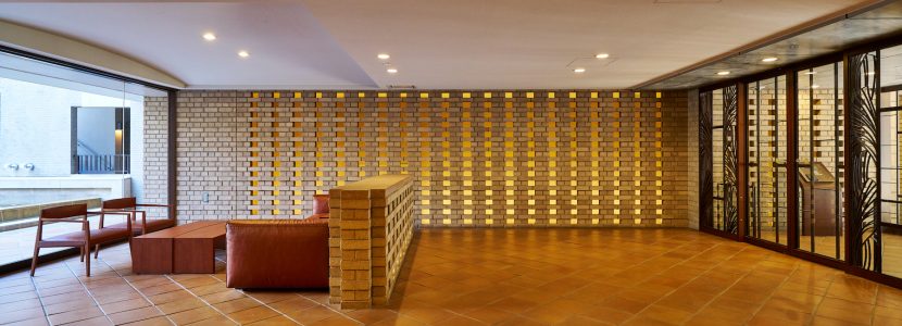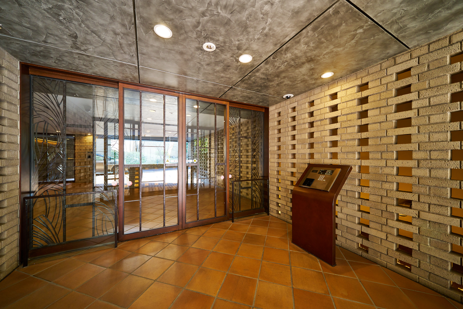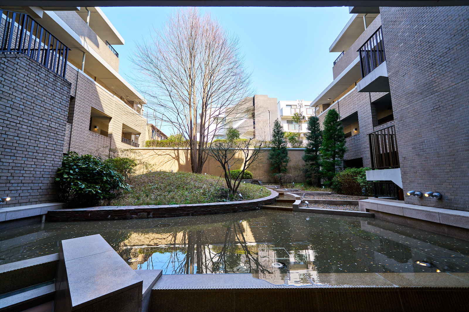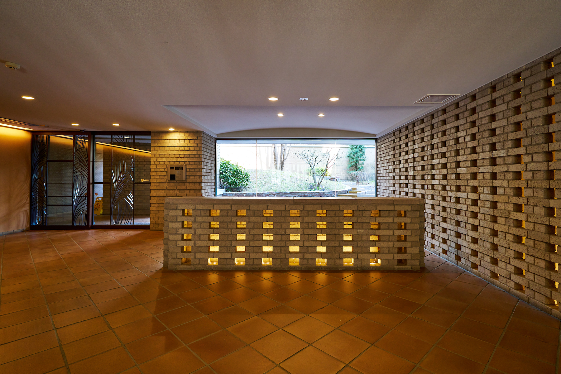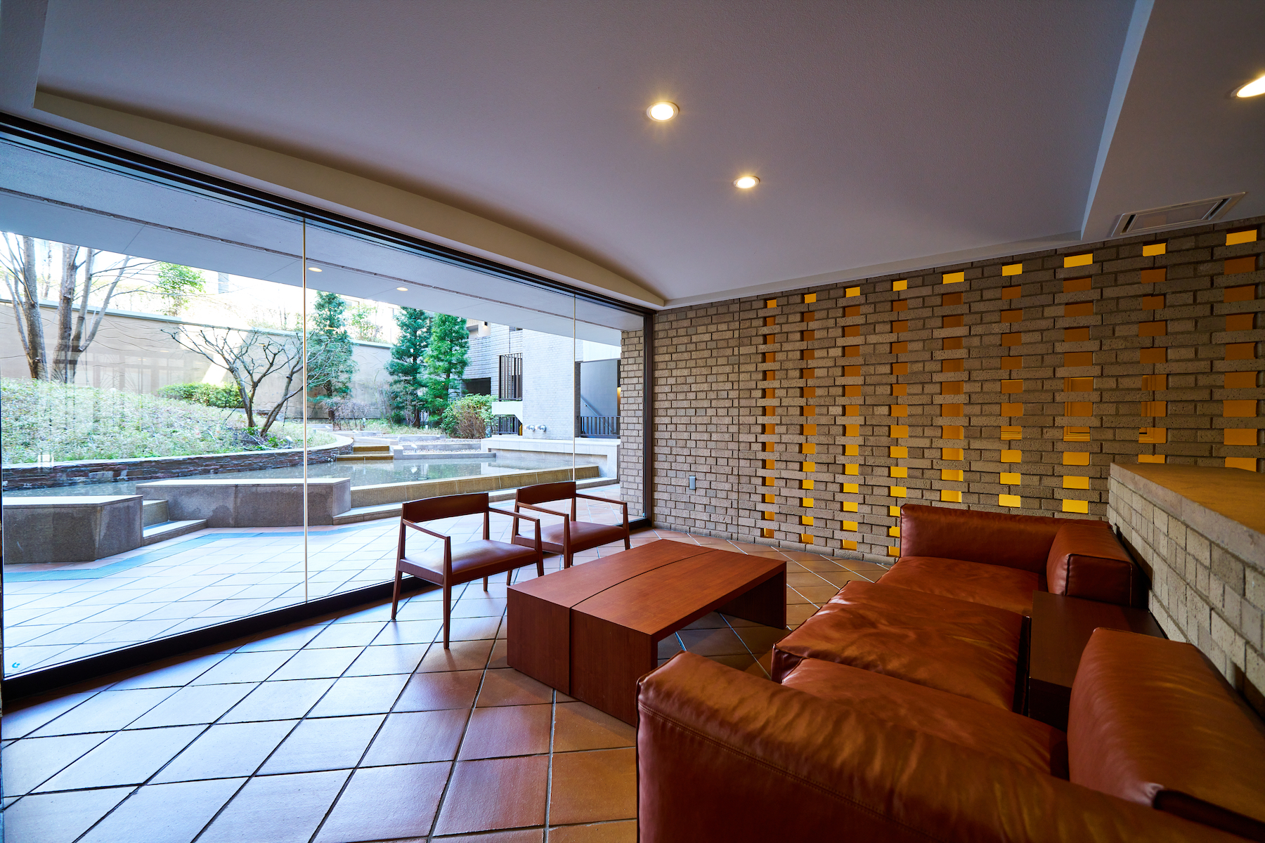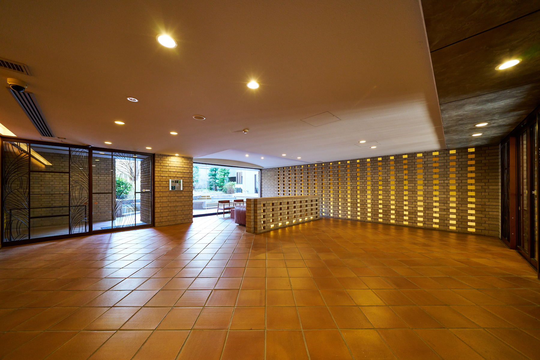 豊かな緑がつくり出す結界性と、ロートアイアンの重厚な趣きで演出されたエントランス。続くエントランスホールは、本質的なマテリアルが醸し出すあたたかな空気感と共に、安息感に満たされた空間となっています。空洞を織り込みながら風合いに満ちたレンガを積み、その奥に間接照明を施した「透かしの積み」の壁と、感触に満ちたせっ器質タイルの床。五感に響く美しさが、その先に待ち受けるさらなる美への予感を演出しています。窓の外に広がるのは、自然を尊ぶ用賀という街のレジデンスとして相応しい、豊かな中庭。自然地形を生かしたマウンドや微かにせせらぐカスケード、豊かな木々や花々が、住む方の美意識をより研ぎ澄ませていきます。