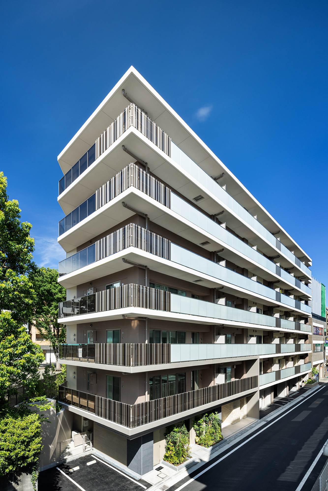 一方、駅に近い南西面は、アーバン・スタイリッシュな雰囲気の外観デザイン。外壁色および手摺の種類をファサードの変化に合わせて切り替えることで面の分節化を図り、統一感のある建物が連続するようなヨーロッパの街並みを表現しています。