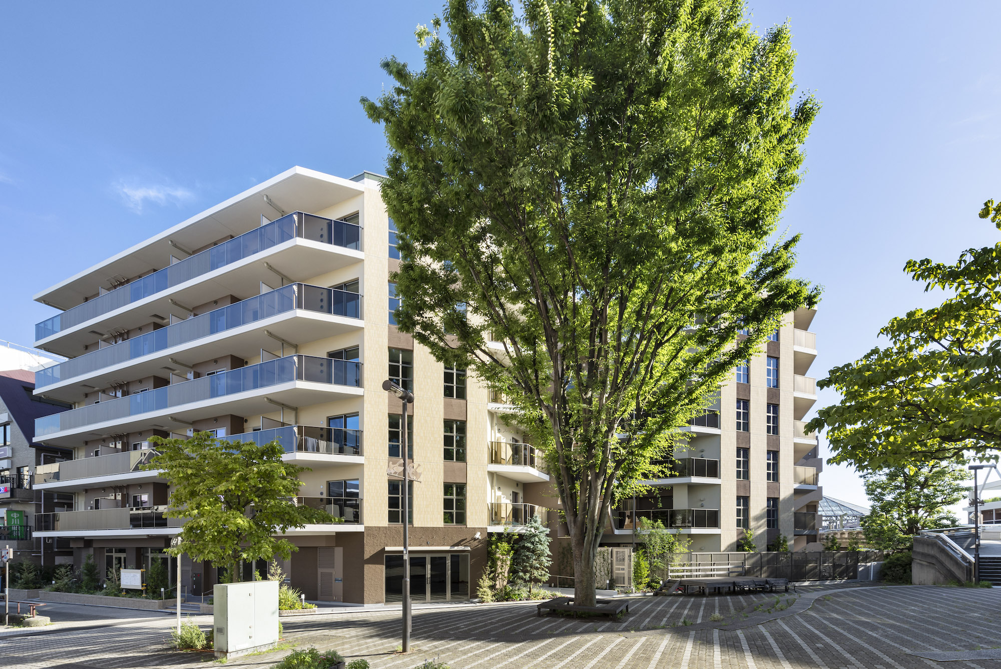 中川駅の周辺は「ネオ・ロマンチック」をコンセプトに、中世ドイツの景観を目指した街づくりがなされています。その美しく洗練された街並みへの敬意を込め、街に開かれた北東面をヨーロッパの景観をテーマにデザイン。イエローを基調としたレンガ、意匠が目を引く窓、ステンカラーの手摺など、周辺の街並みと共鳴する優美なファサードが作り上げられています。