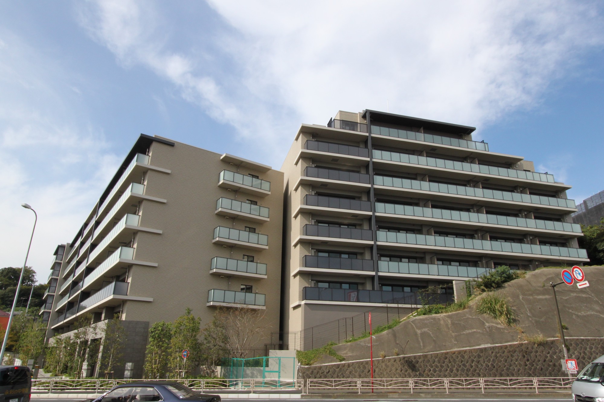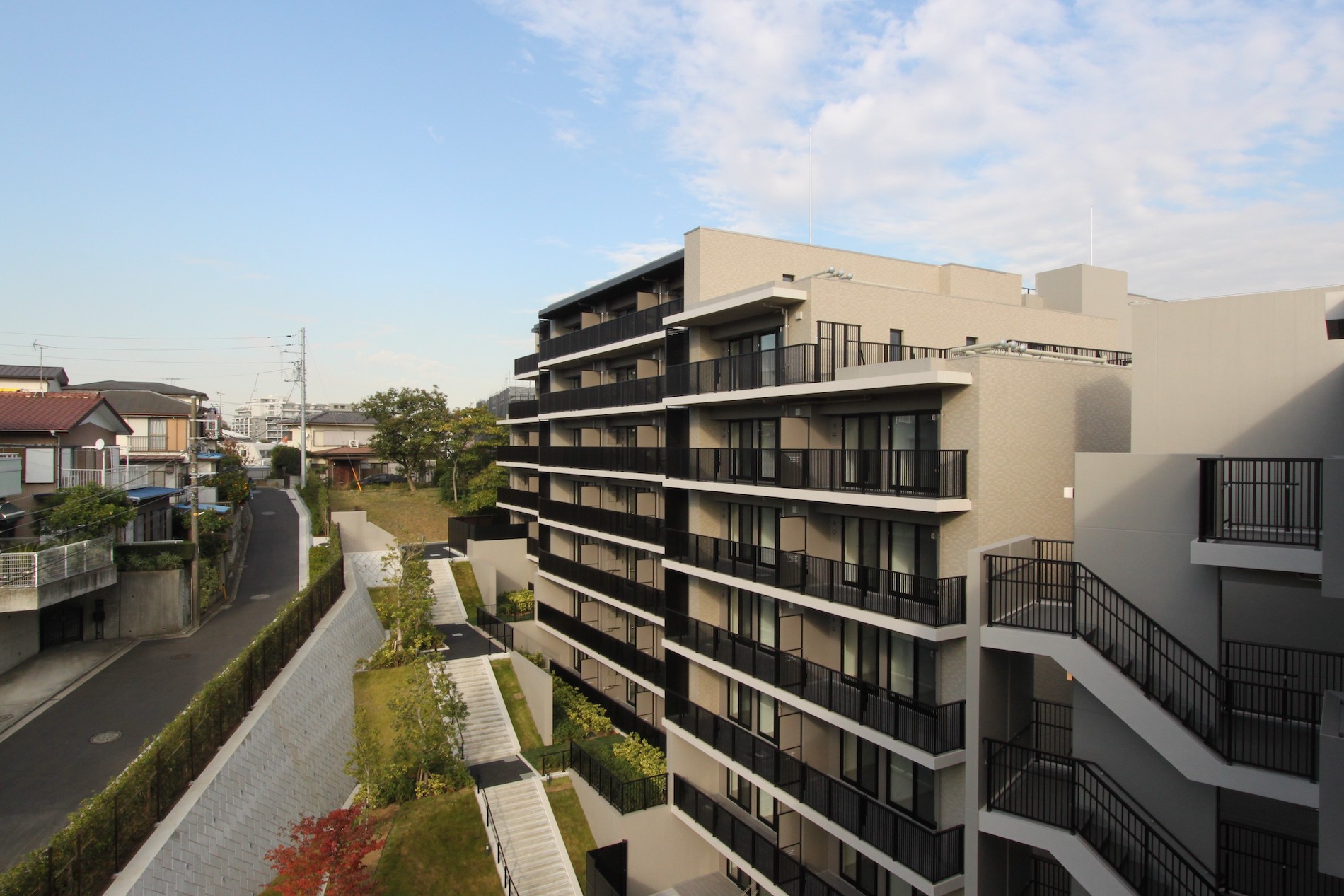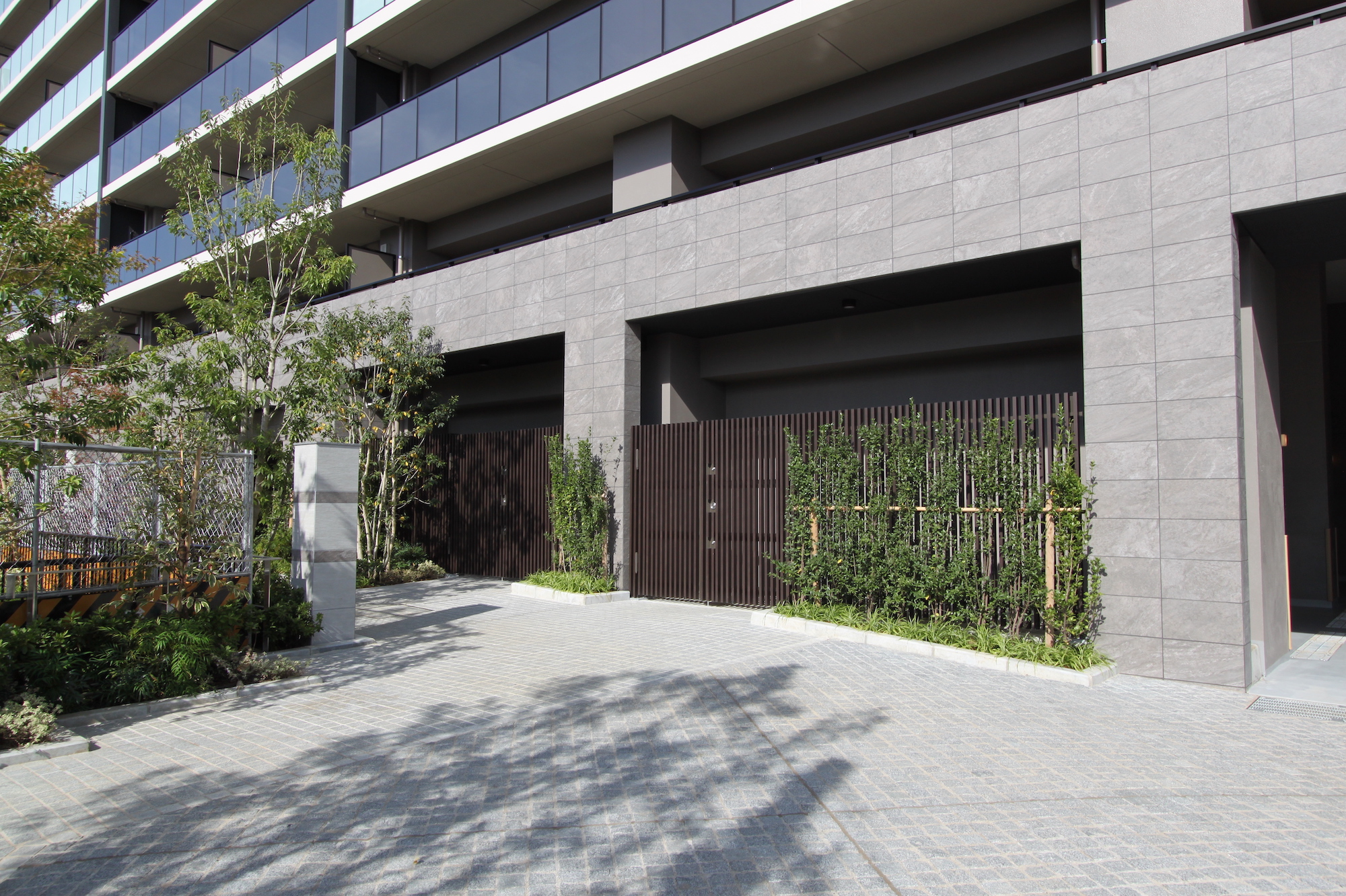 落ち着きのあるアースカラーのタイルを基調としたファサードデザイン。空へと伸びゆくマリオンと水平ラインを強調するキャノピーは、煌めく陽光を映すガラス手すりとともに、このレジデンスならではの開放感とスタイリッシュな存在感を高めています。鶴見・山手、東寺尾——その住宅地としての歴史を継承しながら、広がりのある空や高台の空気感、豊かな緑とも調和する佇まいです。