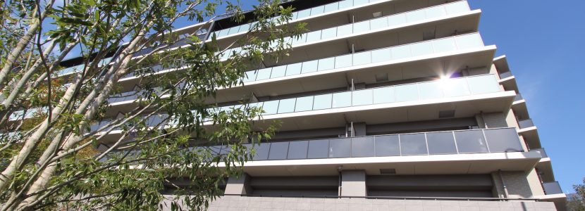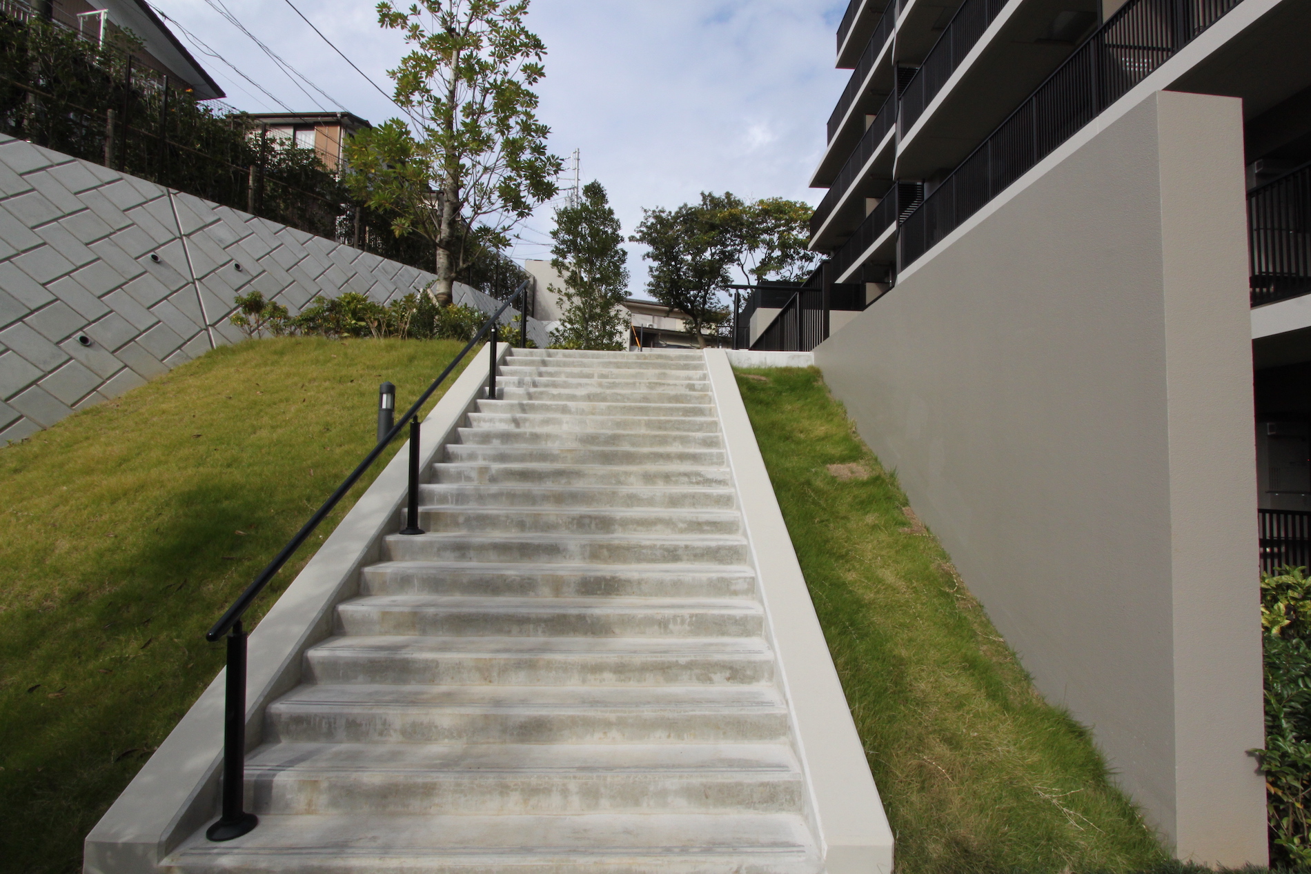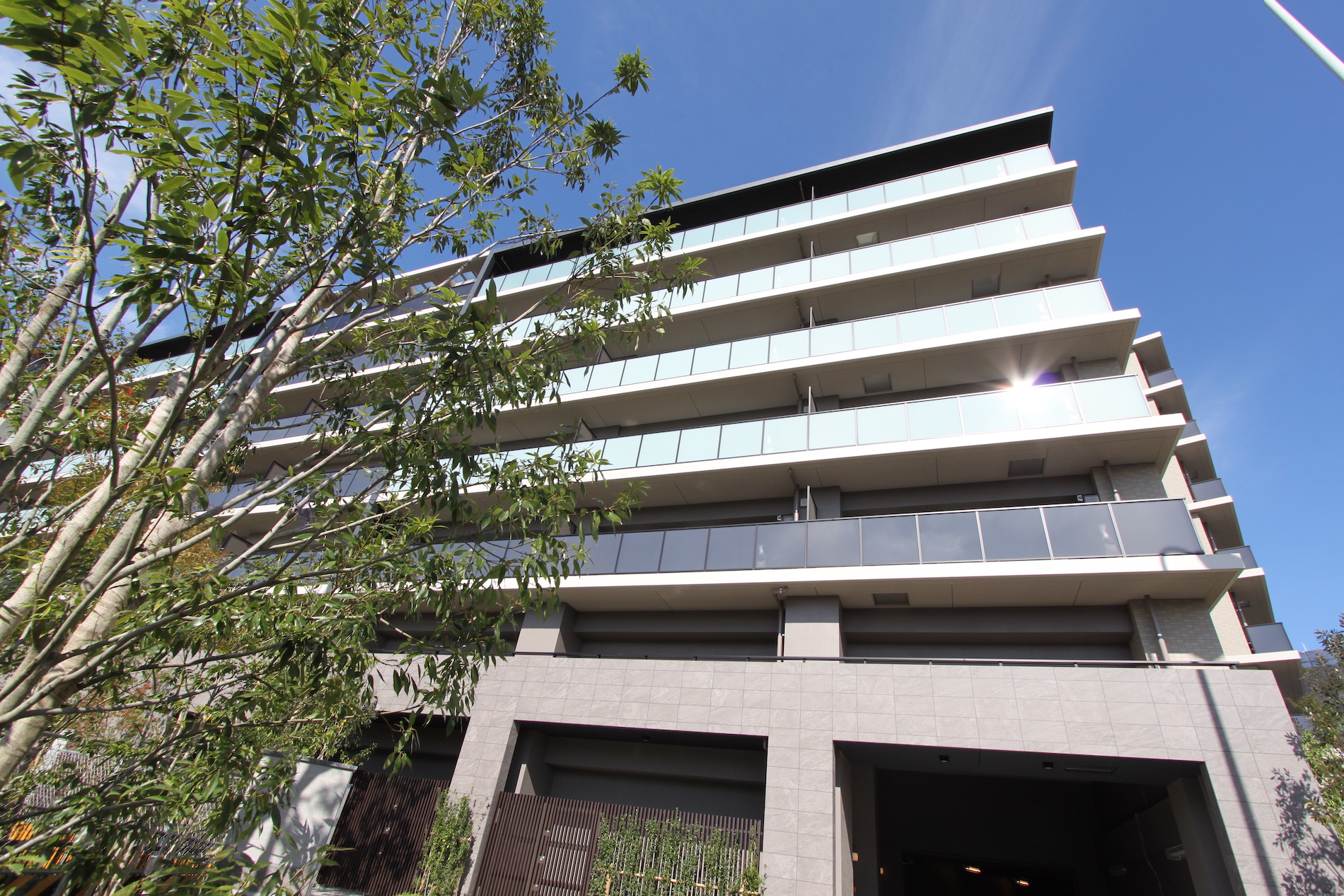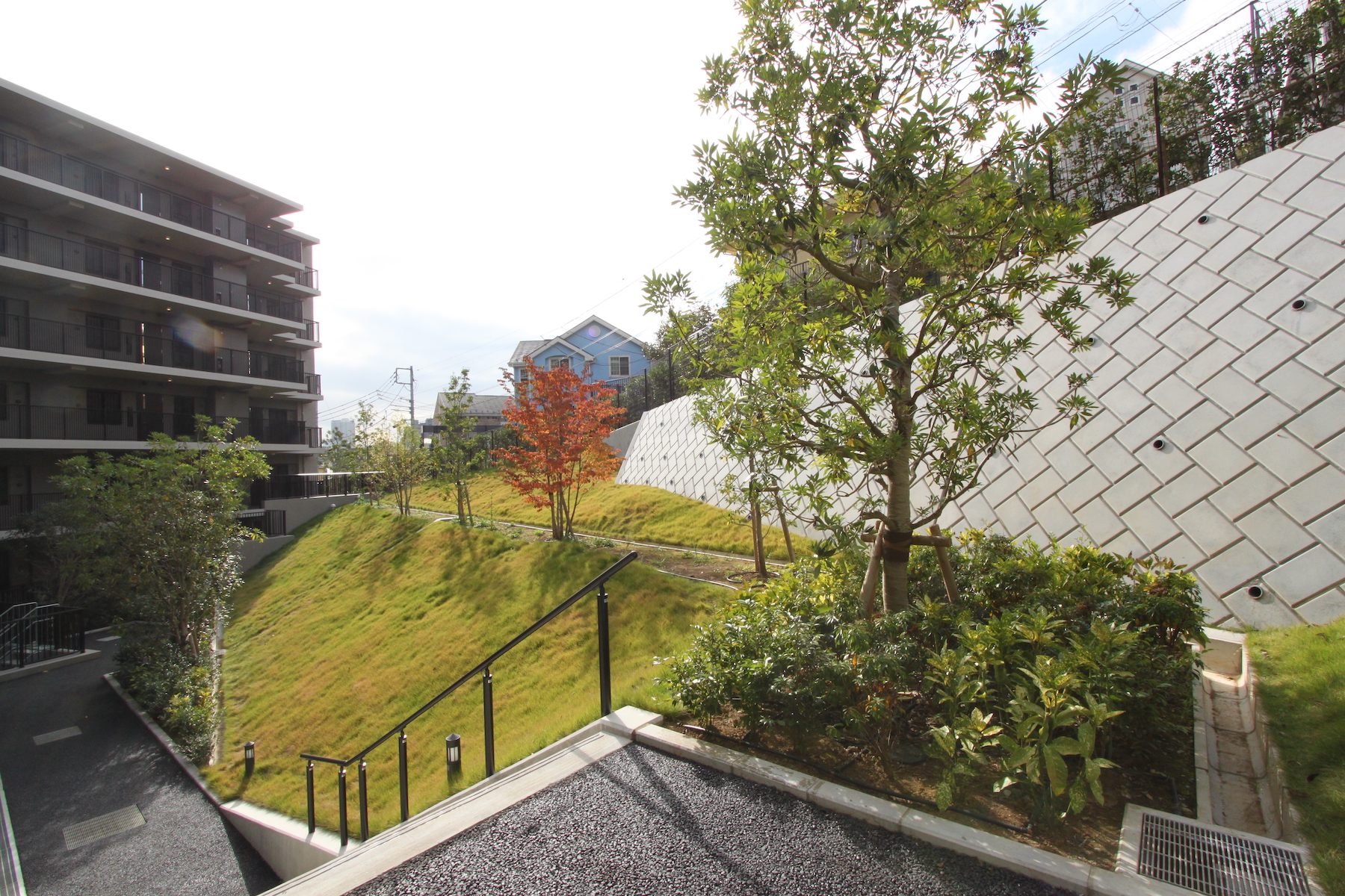 落ち着きのあるアースカラーのタイルを基調としたファサードデザイン。空へと伸びゆくマリオンと水平ラインを強調するキャノピーは、煌めく陽光を映すガラス手すりとともに、このレジデンスならではの開放感とスタイリッシュな存在感を高めています。鶴見・山手、東寺尾——その住宅地としての歴史を継承しながら、広がりのある空や高台の空気感、豊かな緑とも調和する佇まいです。