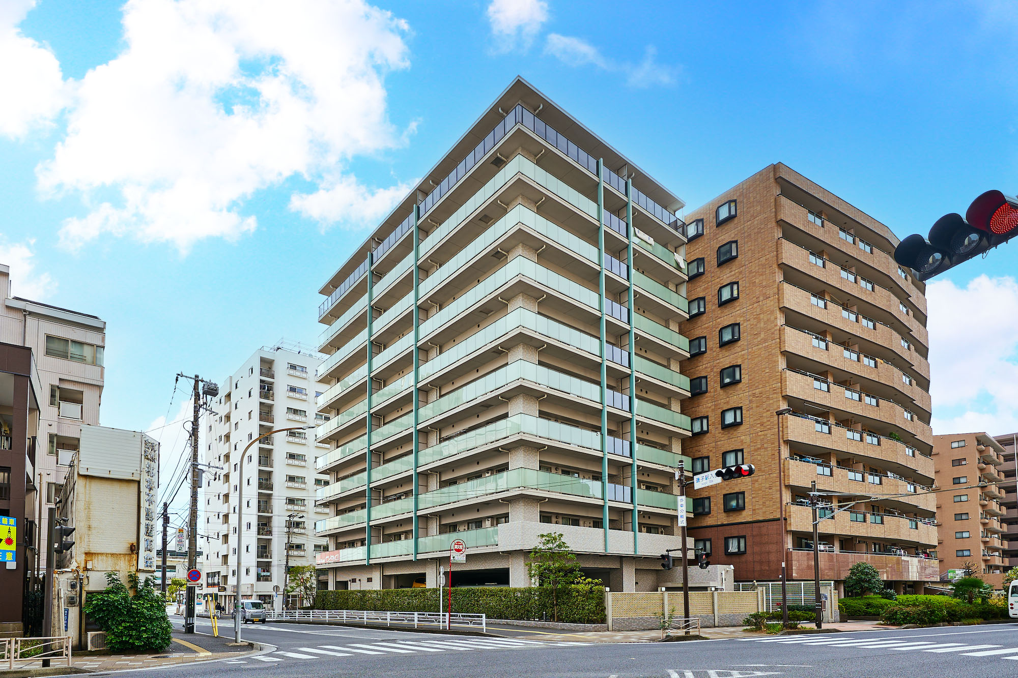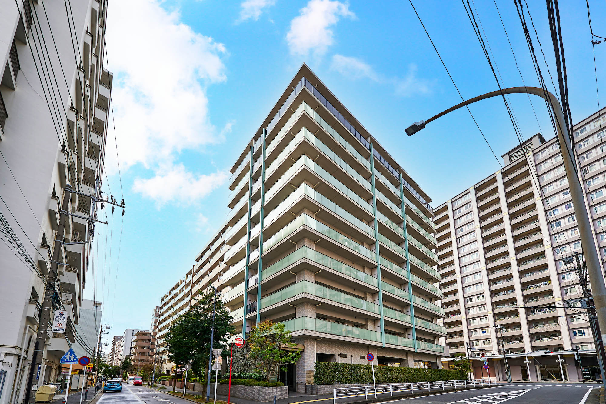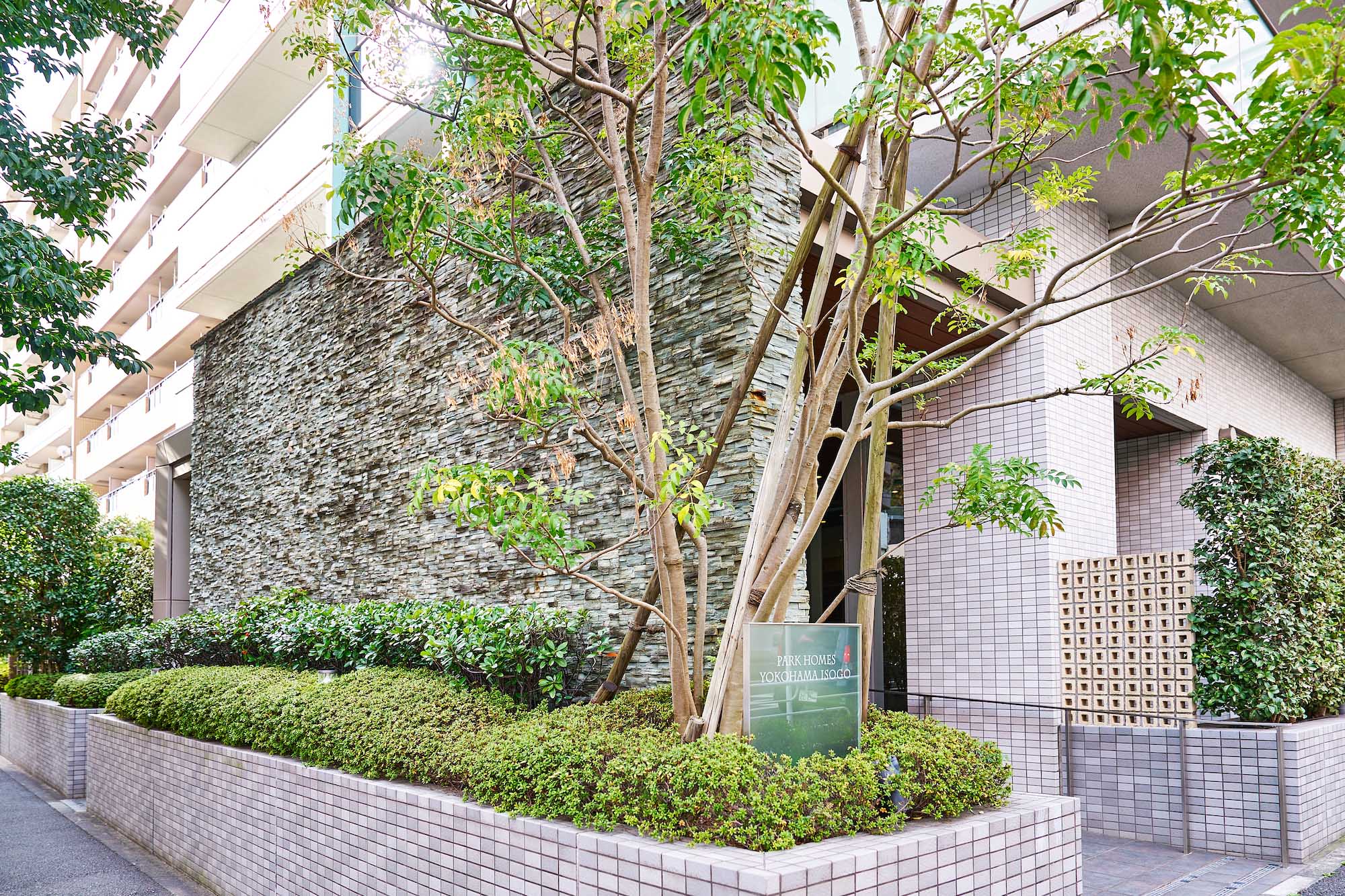光によって白から明灰色に絶妙な階調を見せるバルコニー。縦ラインの美しさを強調する、建物の側面3方に緑青に輝くマリオンなど、爽やかさと清潔感を醸し出しながら全体に変化のある印象を創出。その都会的な優美さは、そこに住まう人のステイタスを確かなものにしてくれます。さらに全体の美しさや格式と品格のある空間は、細部の素材にこだわることによって生み出されています。自然石、ガラス、タイル、そしてガラスブロックや空洞ブロックなどの多彩で上質な建築素材。これらを吟味し使い分けることで、モダンの中にも質感のある表情豊かな外観をつくり出しています。