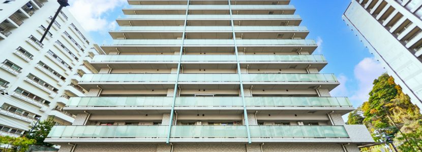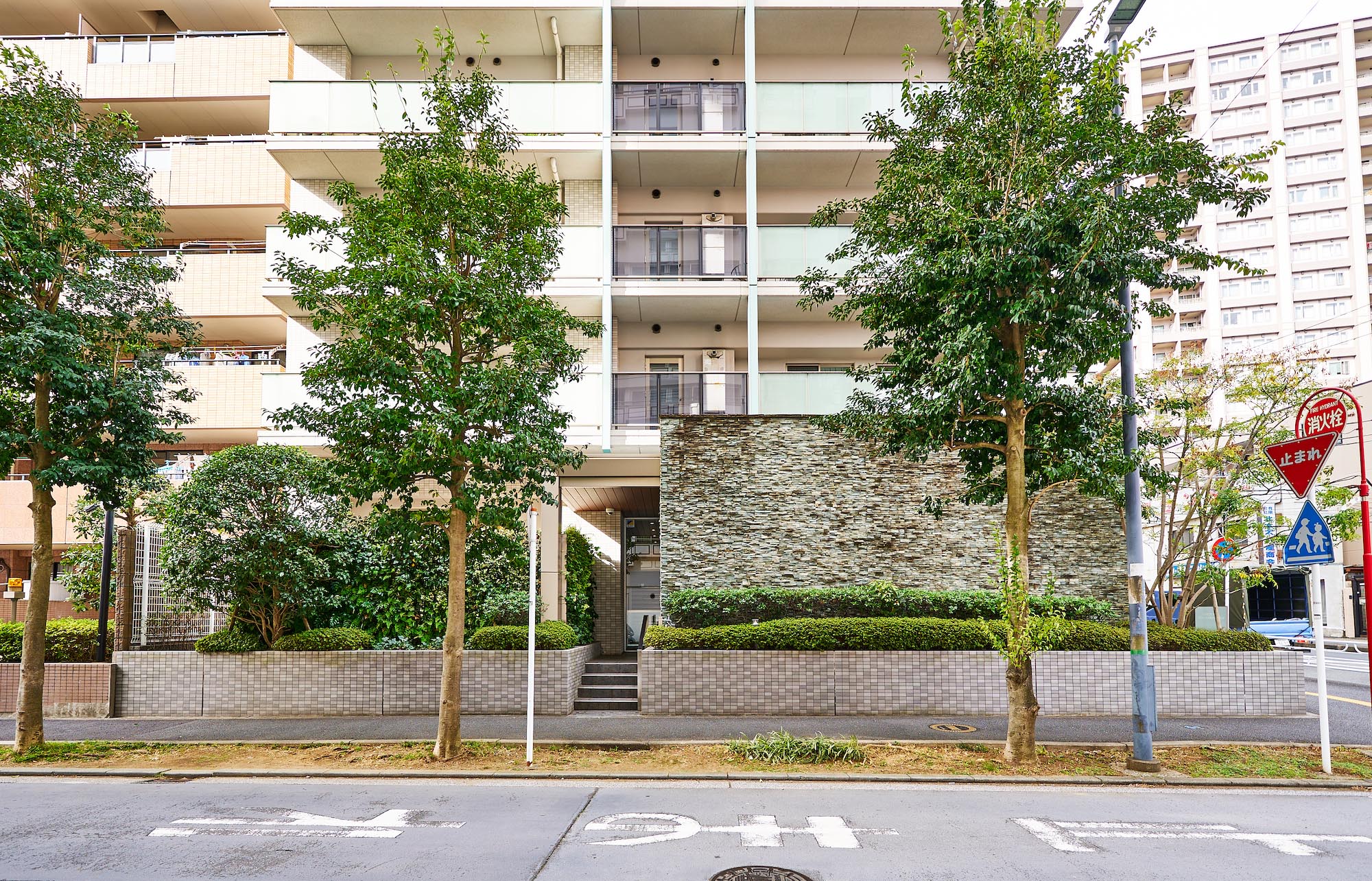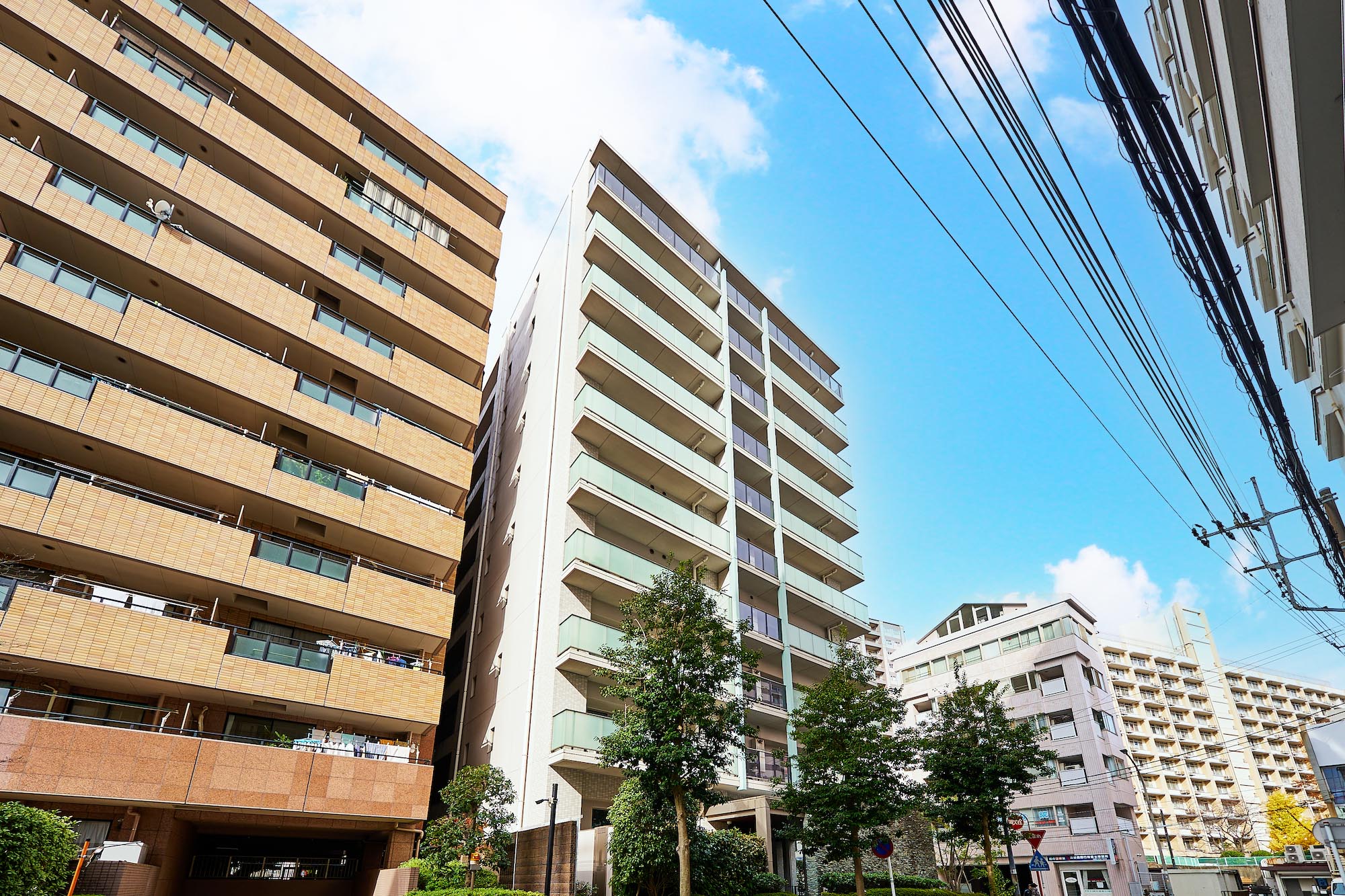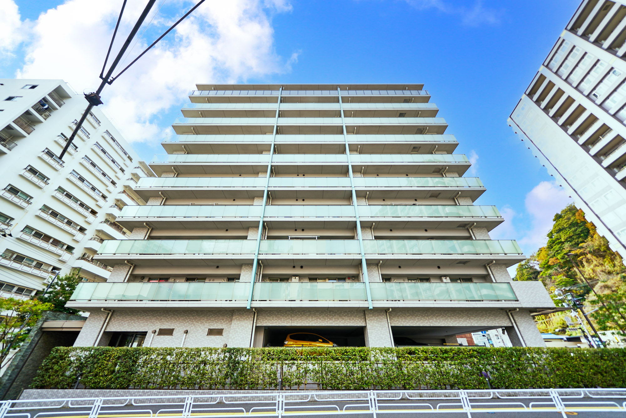 光によって白から明灰色に絶妙な階調を見せるバルコニー。縦ラインの美しさを強調する、建物の側面3方に緑青に輝くマリオンなど、爽やかさと清潔感を醸し出しながら全体に変化のある印象を創出。その都会的な優美さは、そこに住まう人のステイタスを確かなものにしてくれます。さらに全体の美しさや格式と品格のある空間は、細部の素材にこだわることによって生み出されています。自然石、ガラス、タイル、そしてガラスブロックや空洞ブロックなどの多彩で上質な建築素材。これらを吟味し使い分けることで、モダンの中にも質感のある表情豊かな外観をつくり出しています。